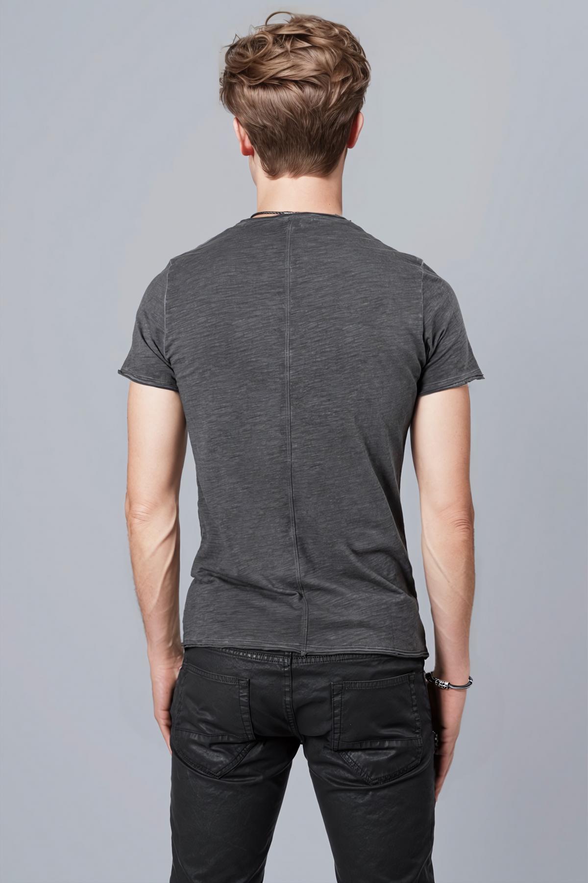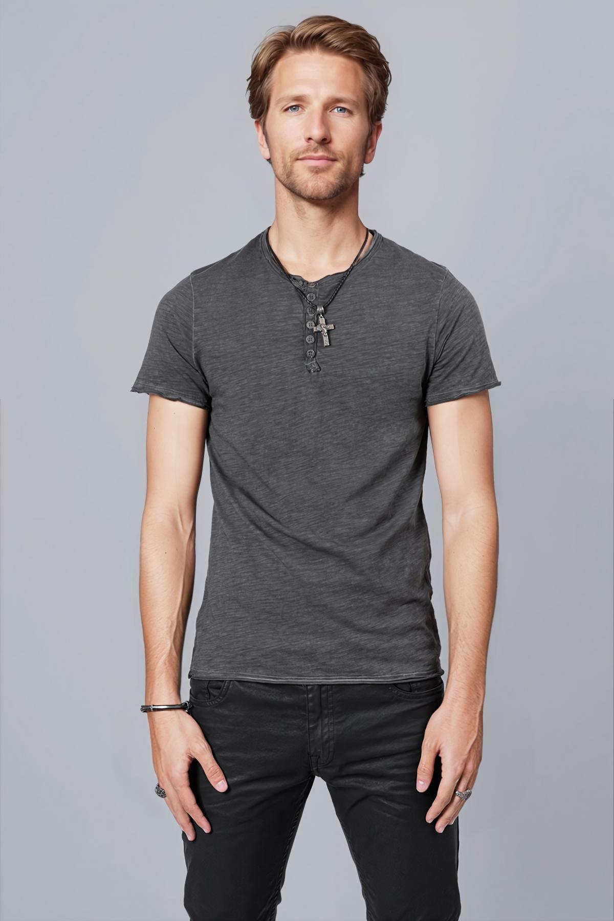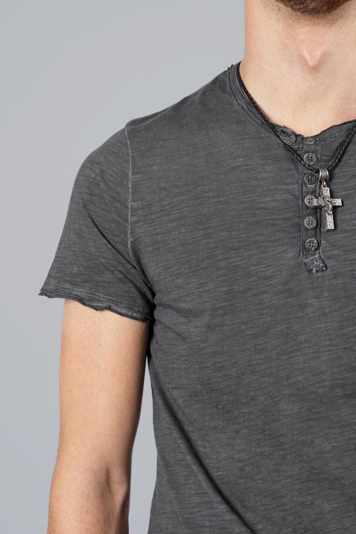 Chester T-shirt with short sleeves. Buttons at center. Inside poem print. Raw cut hem.