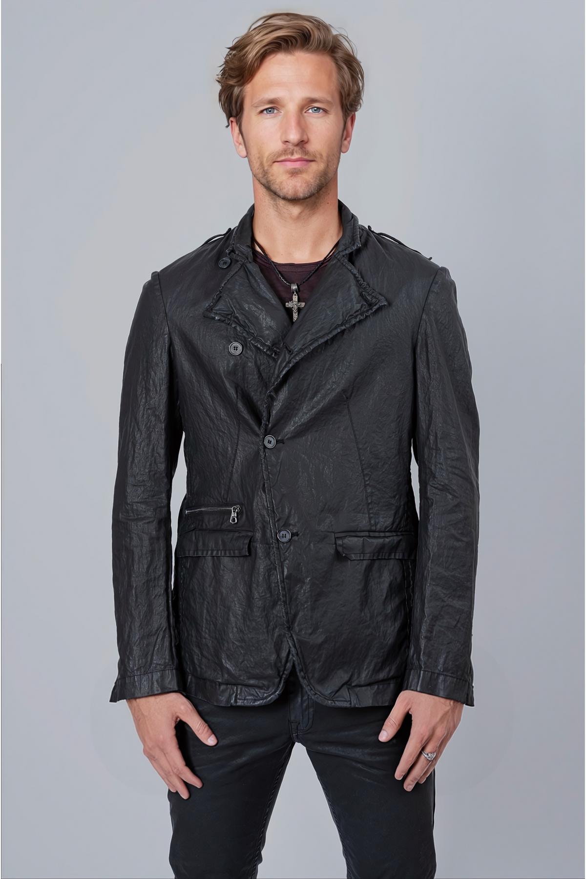 Unlined jacket in resinated linen. Off-center button closure, flap pockets and zip on front on shoulders.Insignia on shoulders.
