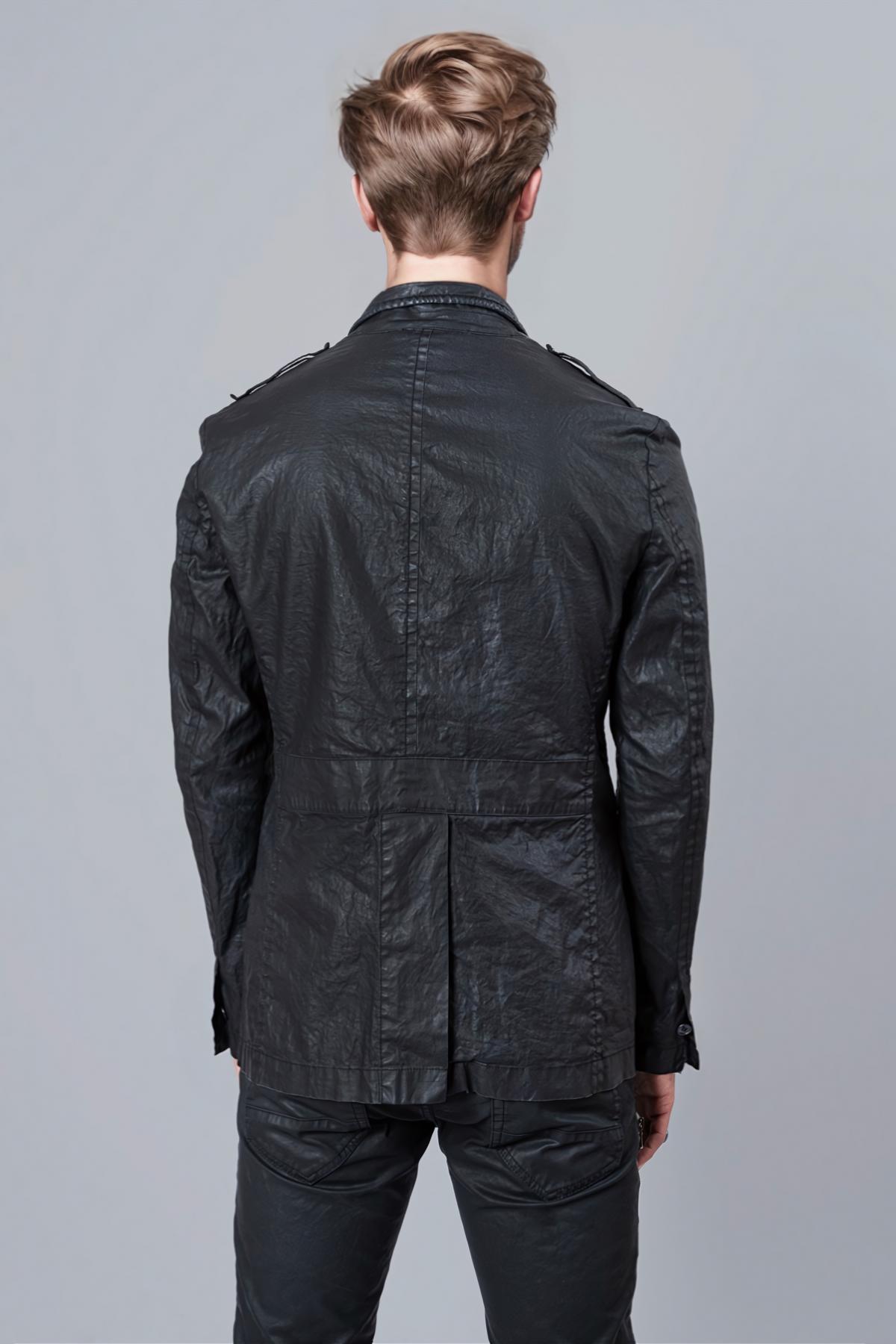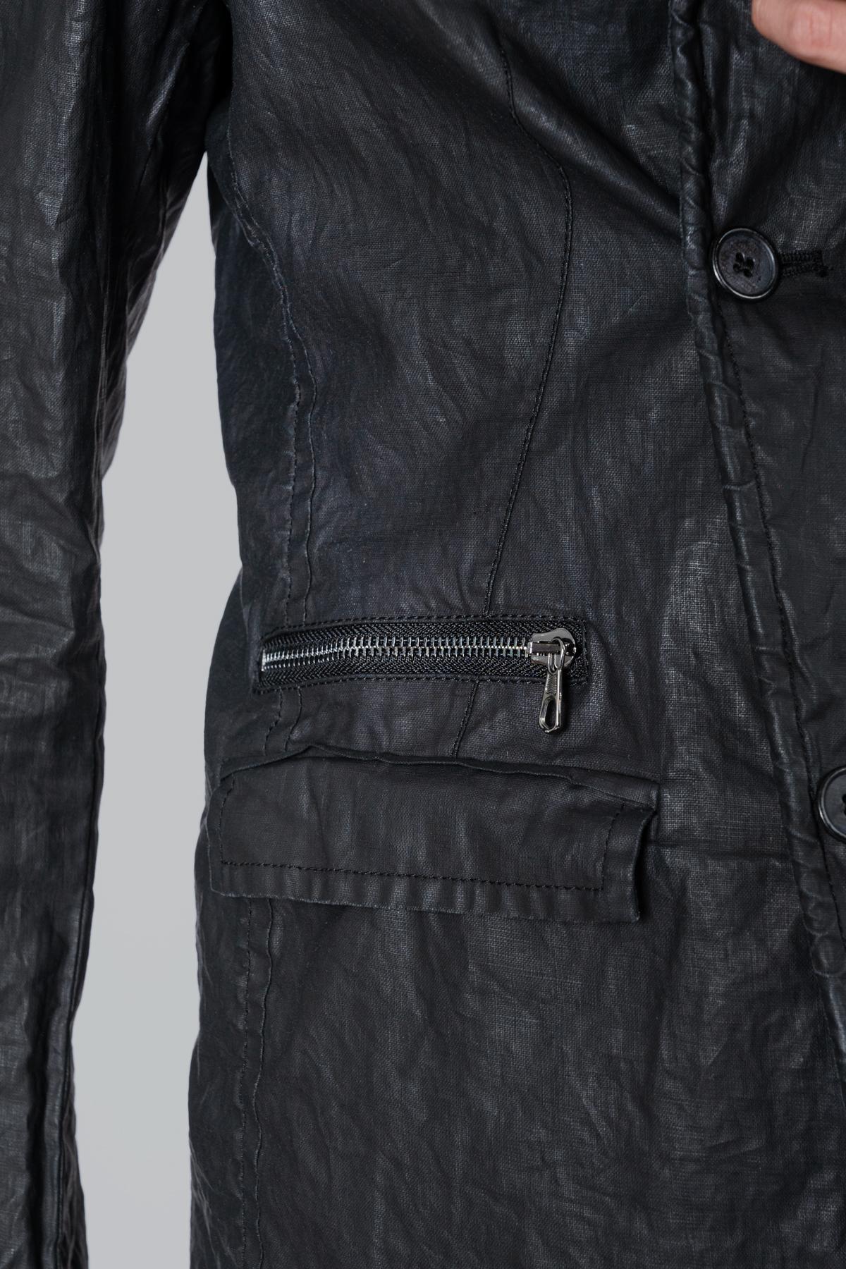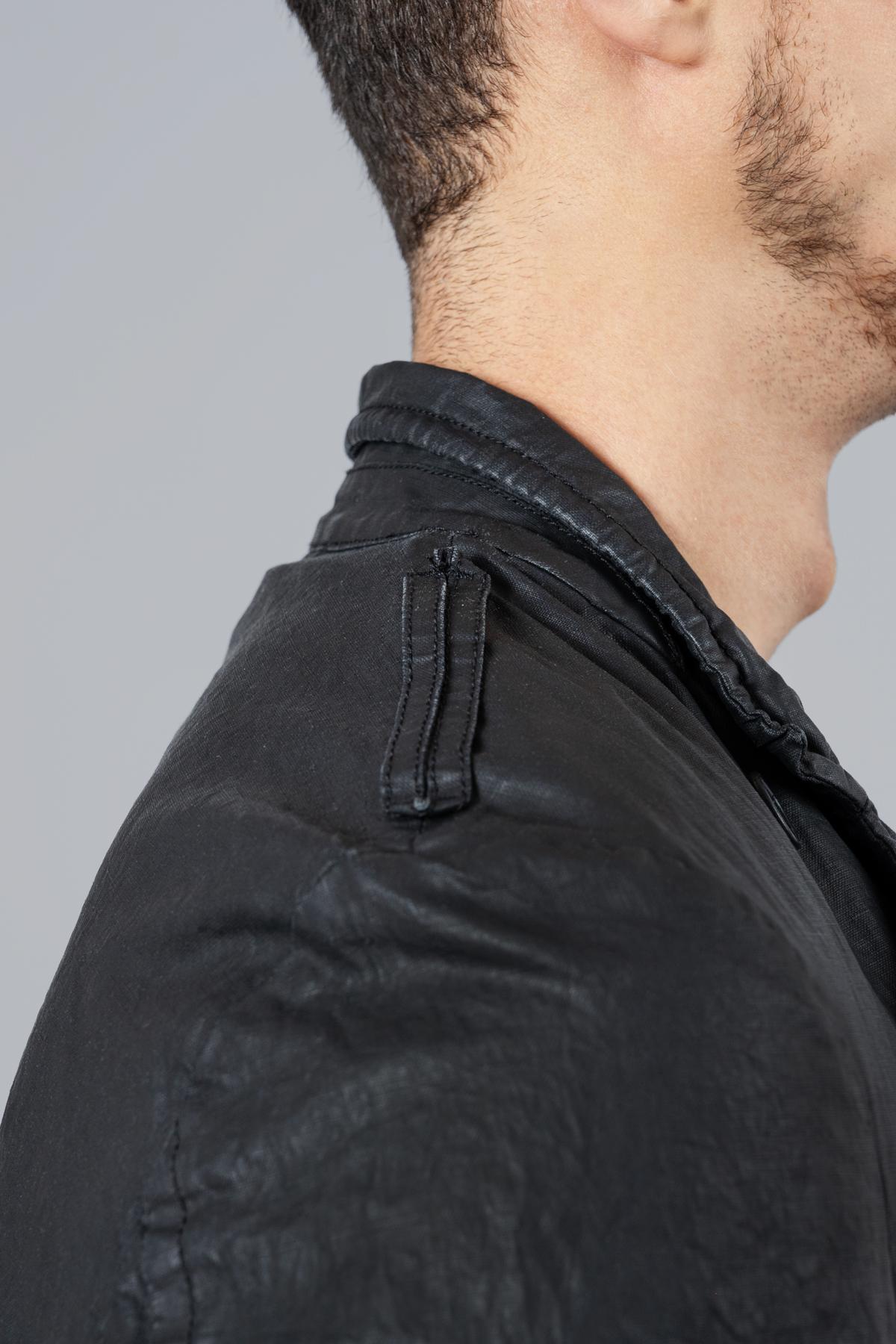 Unlined jacket in resinated linen. Off-center button closure, flap pockets and zip on front on shoulders.Insignia on shoulders.100% Linen flax + Coating ...