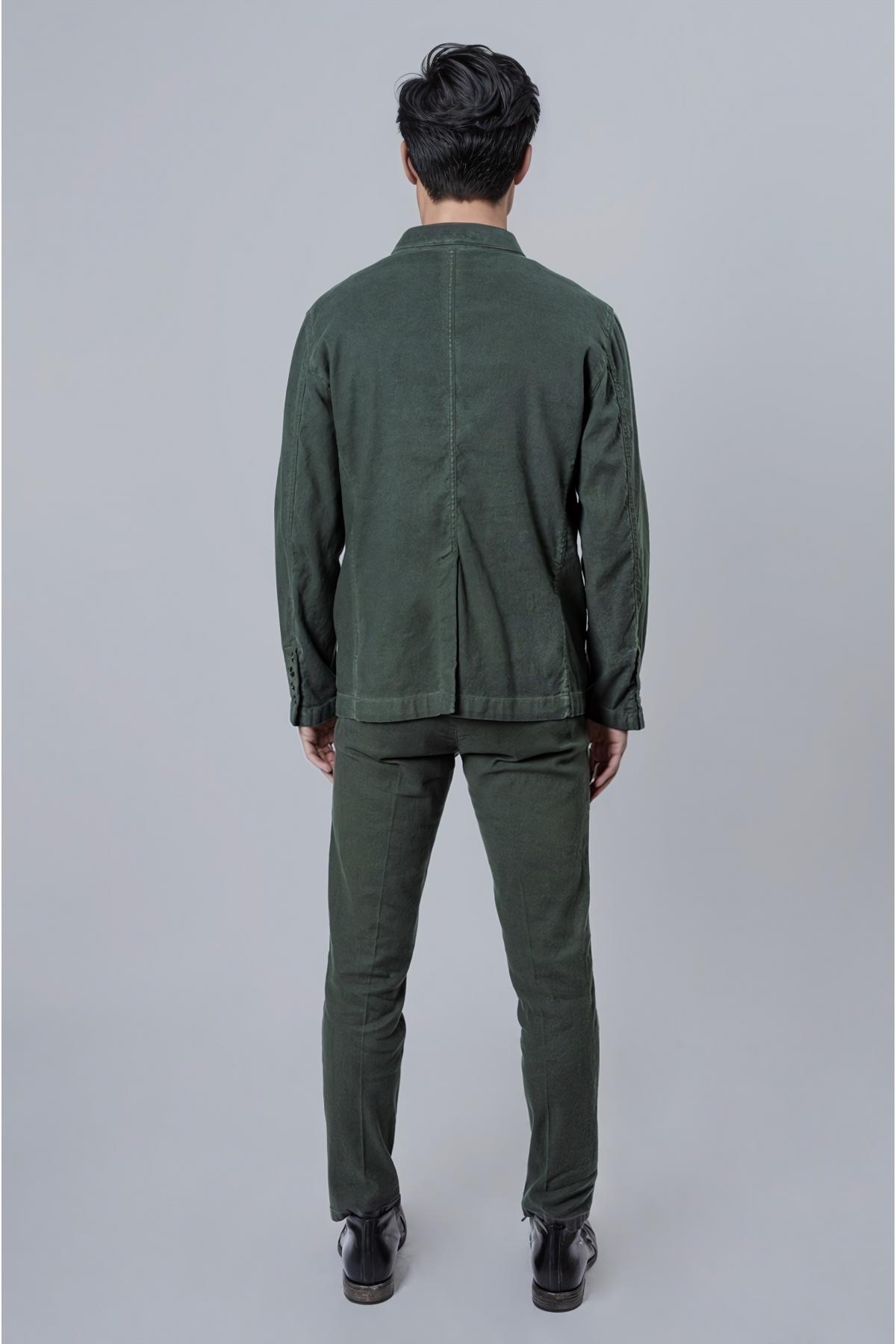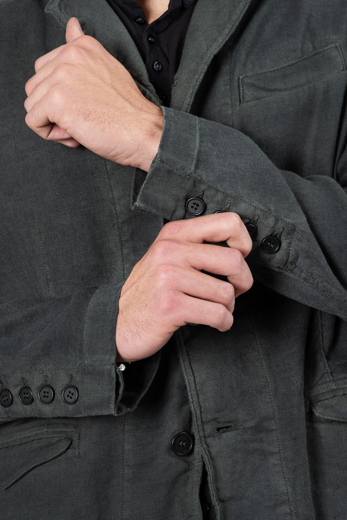 Single-breasted unlined jacket made of hemp blend. Three-button closure with flap pockets.