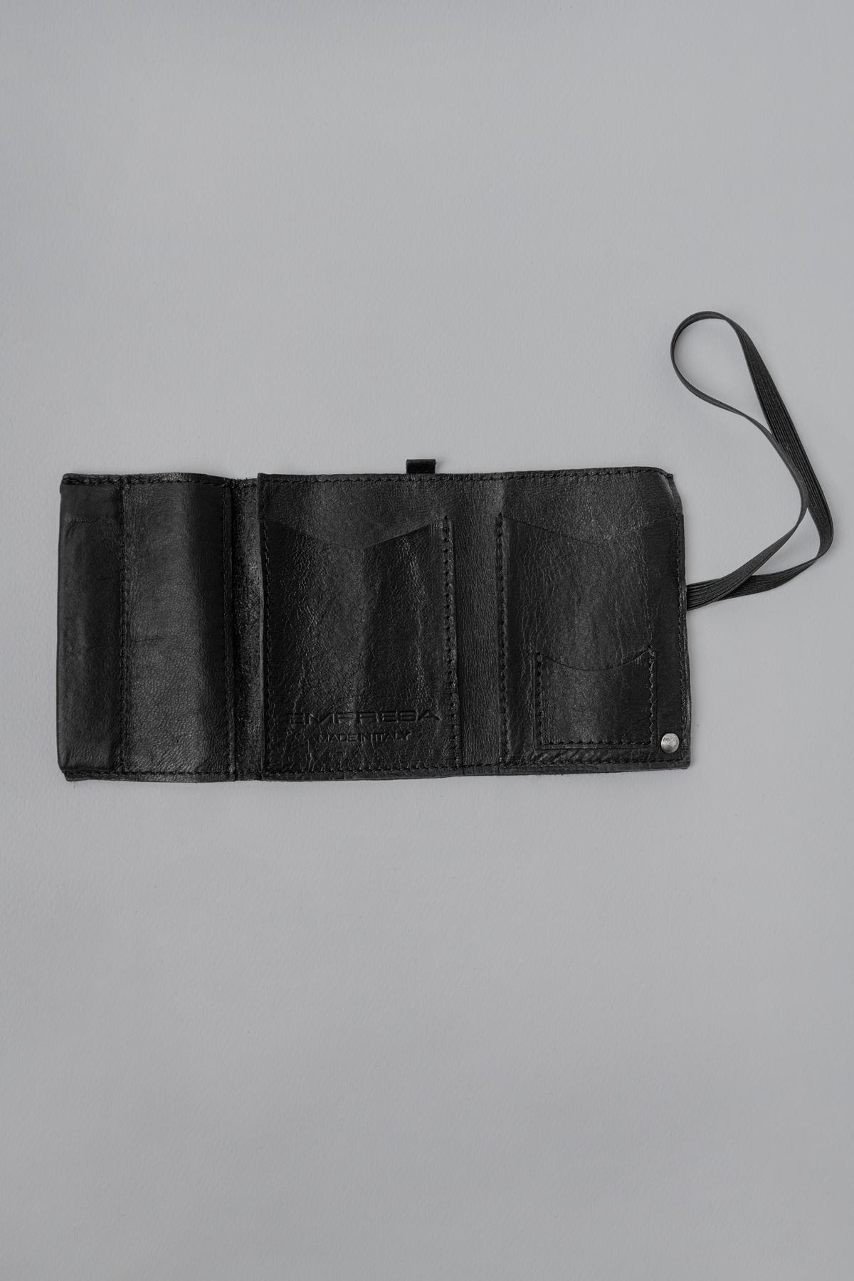 Genuine leather wallet, embellished with a skull-shaped stud. Section for banknotes, coins and card holders. Leather flap for hanging a hook or snap hook. Elastic closure.