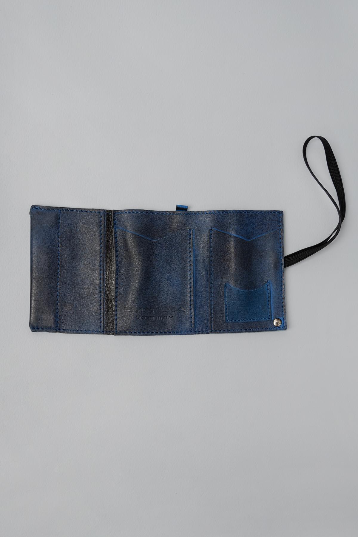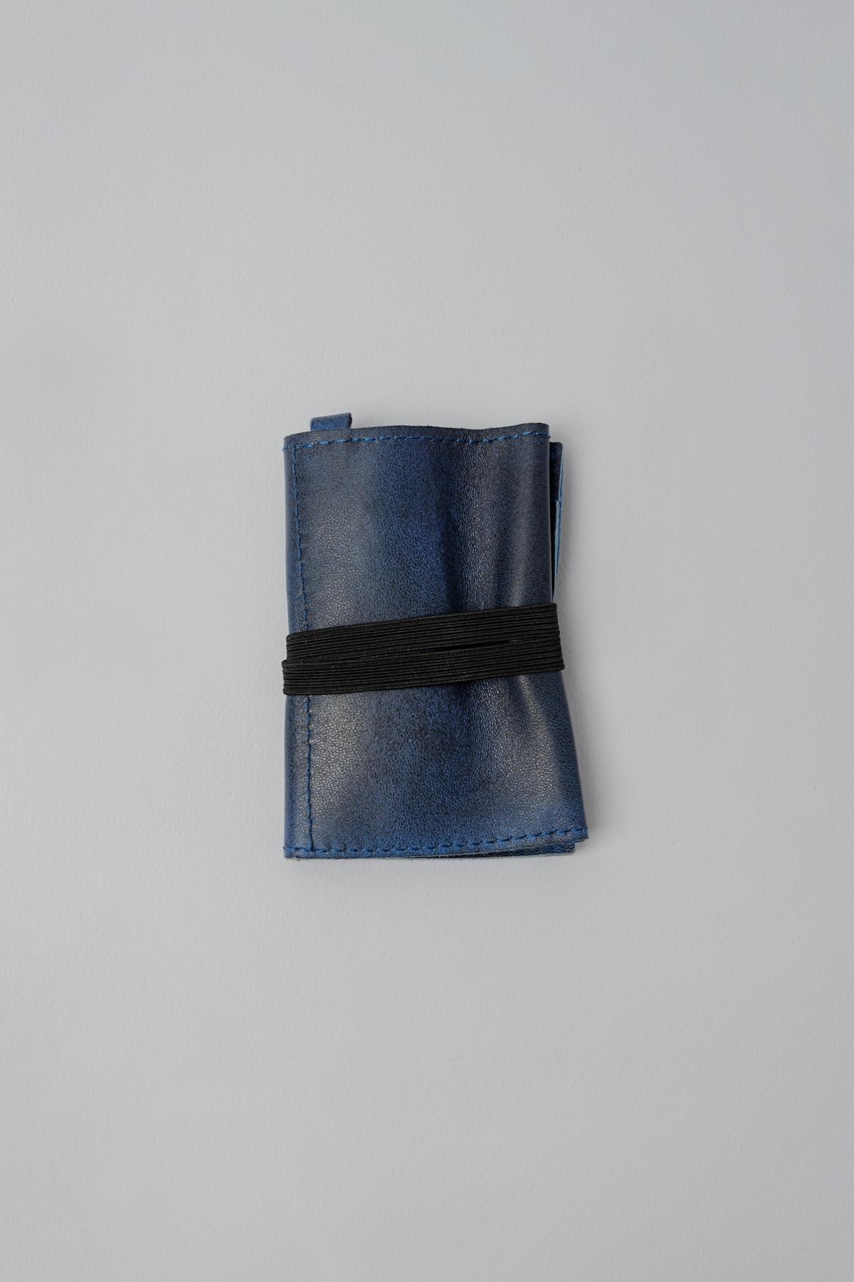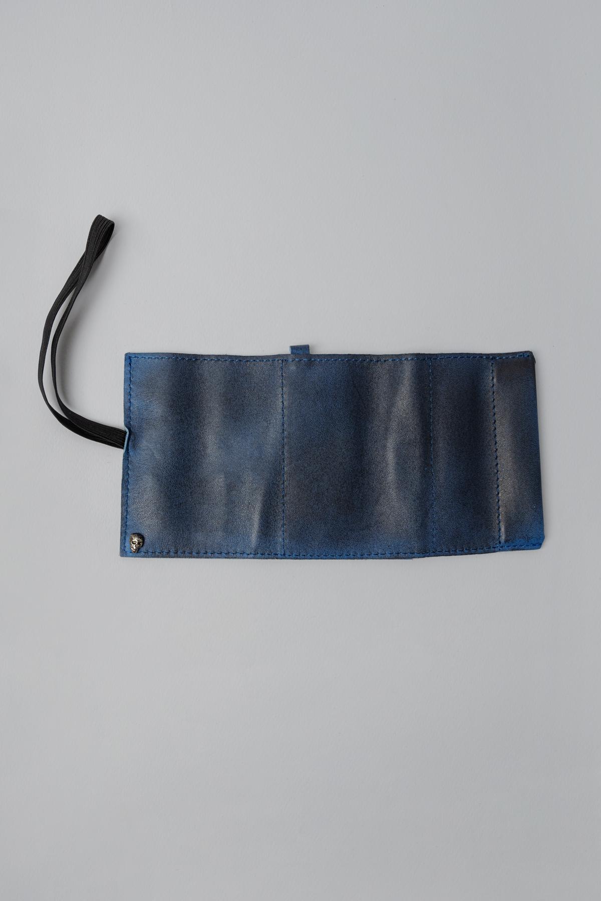 Genuine leather wallet, embellished with a skull-shaped stud. Section for banknotes, coins and card holders. Leather flap for hanging a hook or snap hook. Elastic closure.