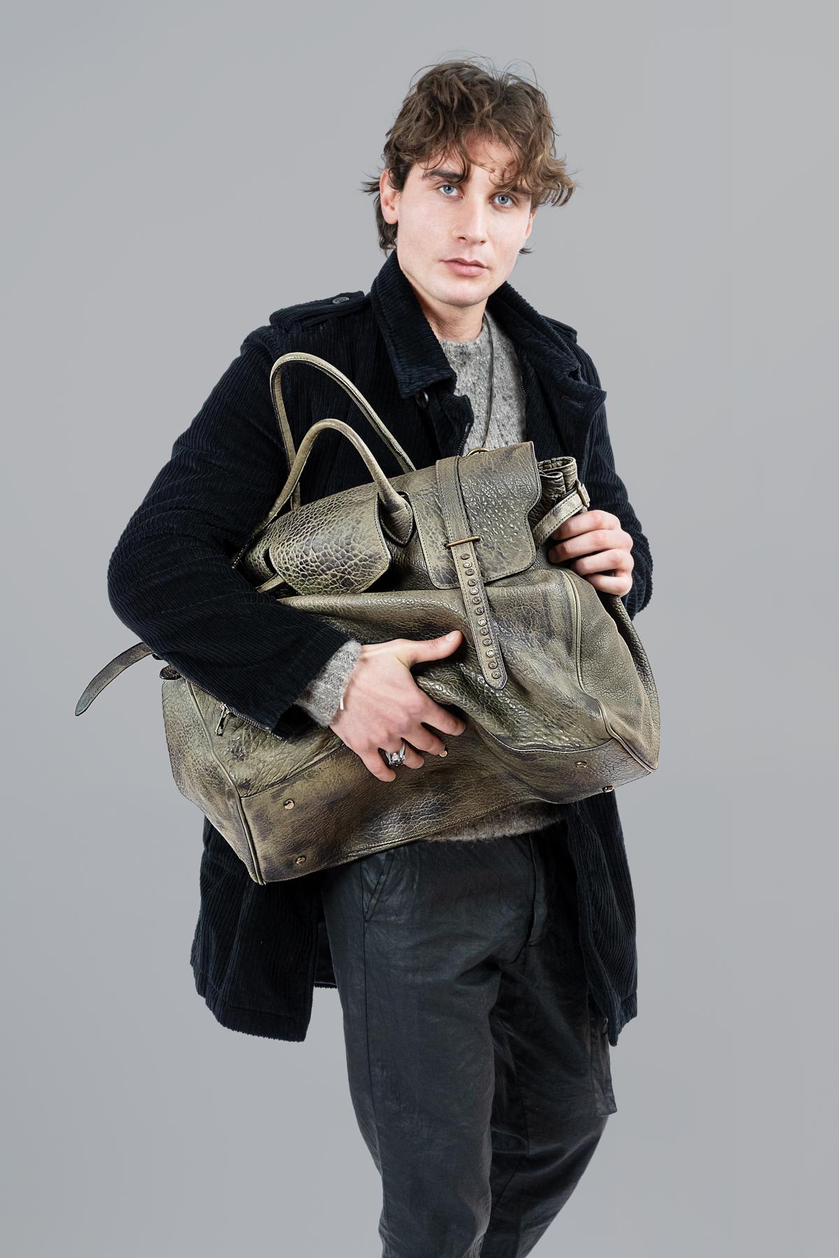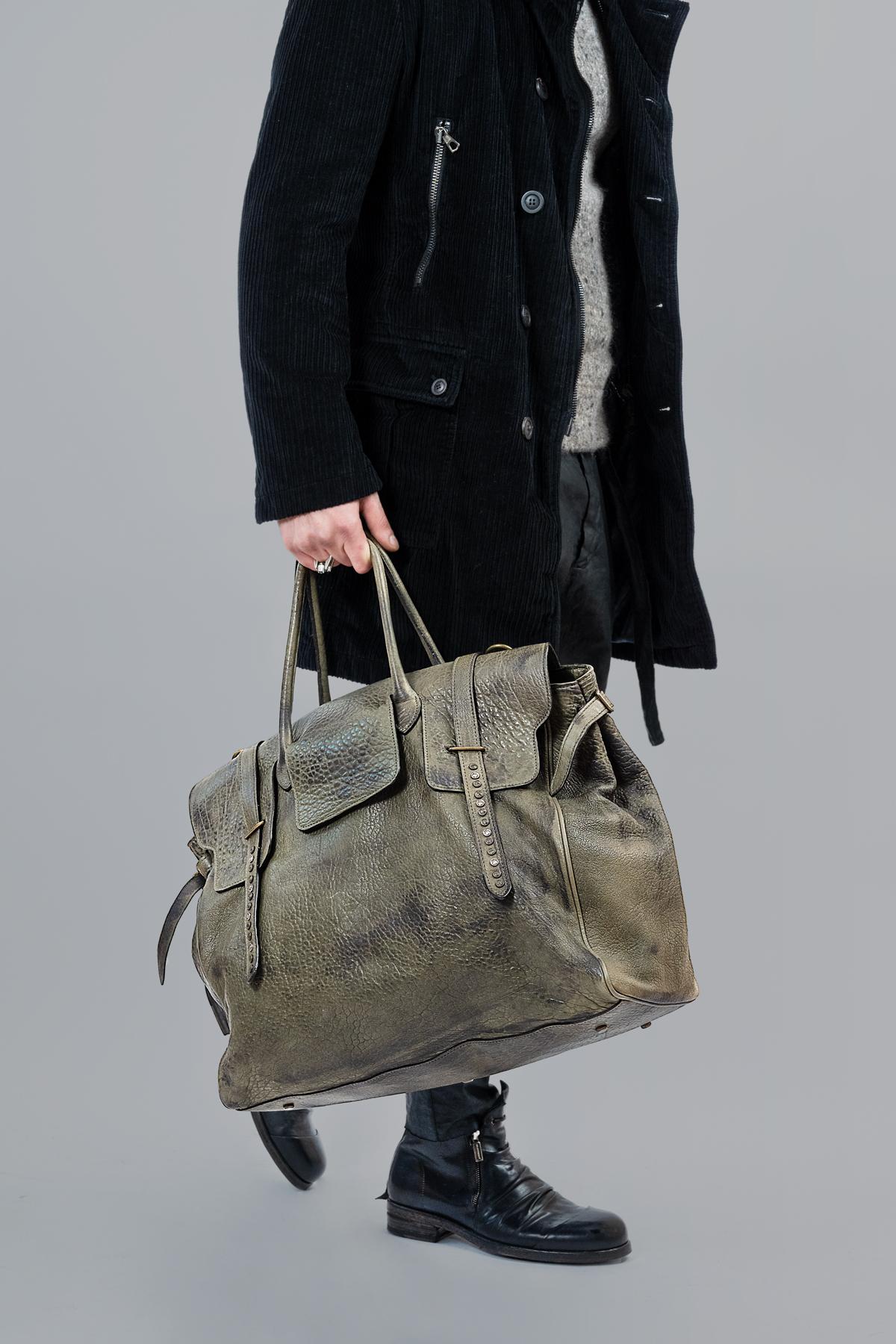 Leather travel bag. Buckle closure and studded ties. Removable leather shoulder strap.