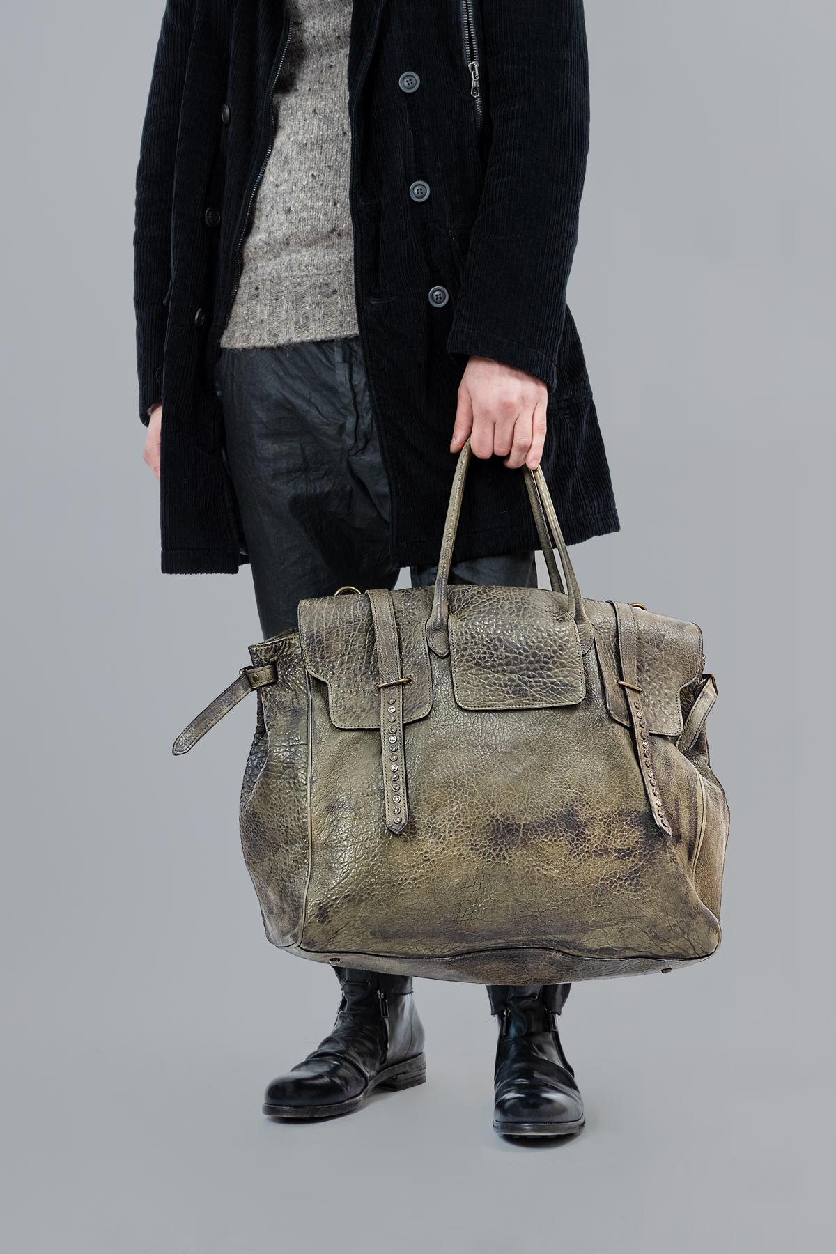 Leather travel bag. Buckle closure and studded ties. Removable leather shoulder strap.This item, being a handmade product, may have variations in the colors of the applie ...