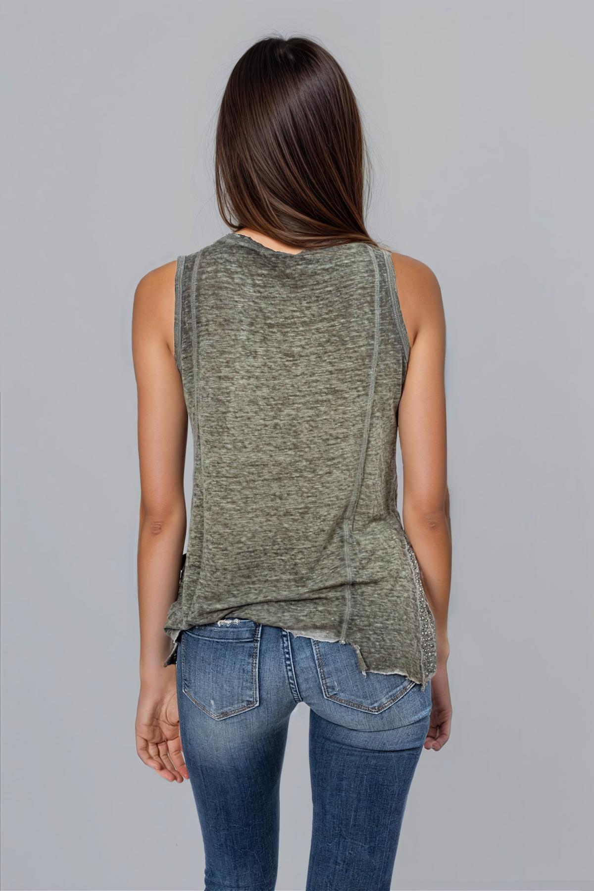 Tank top with asymmetrical cut and off-center buttons. Application of studs on the bottom. Raw cut hem. Inside poem print