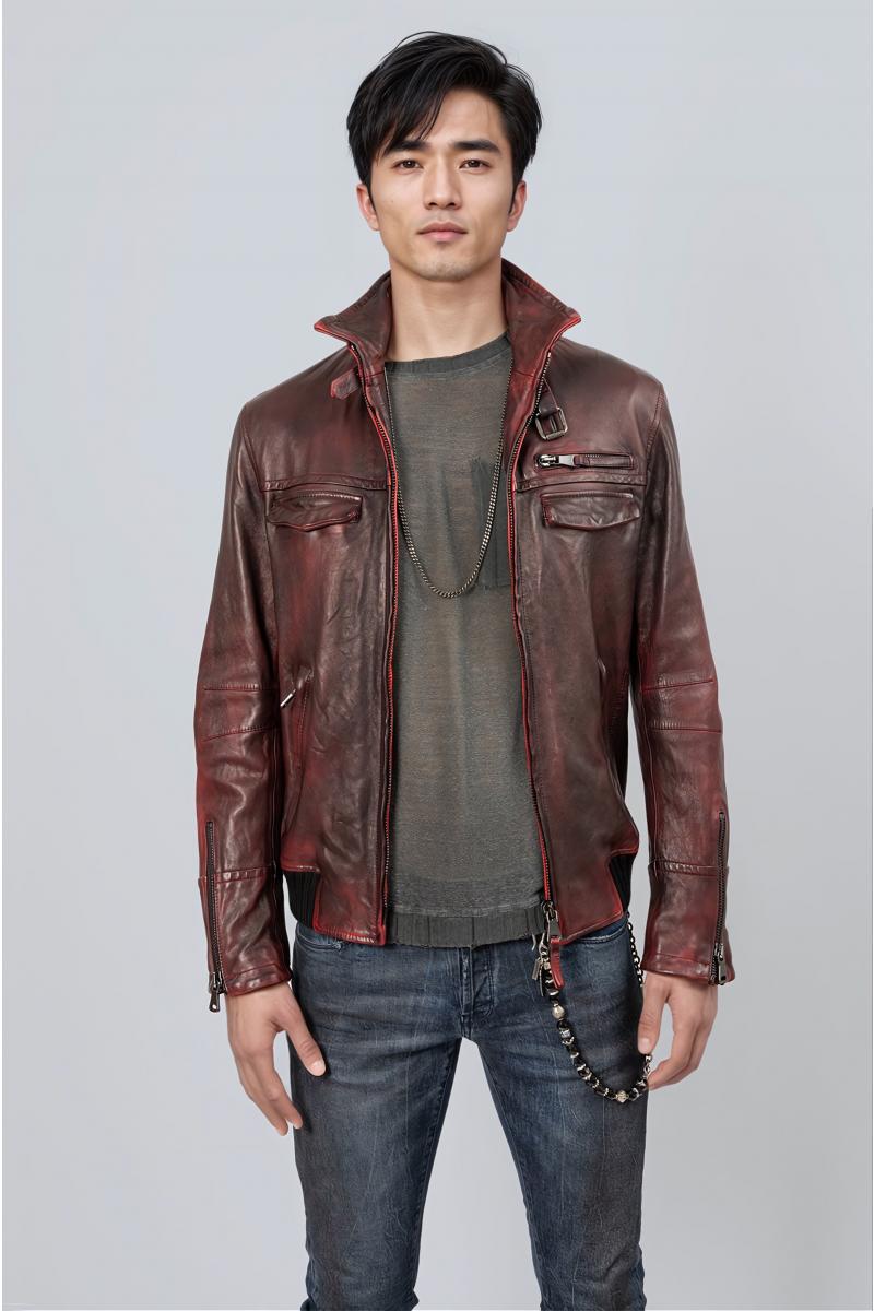 Giacca in pelle foderata. Chiusura centrale con zip e elastico sui fianchi. Due tasche a pattina e tre tasche con chiusura zip sul davanti. Collo con cinturino. Chiusura zip sulle maniche.
