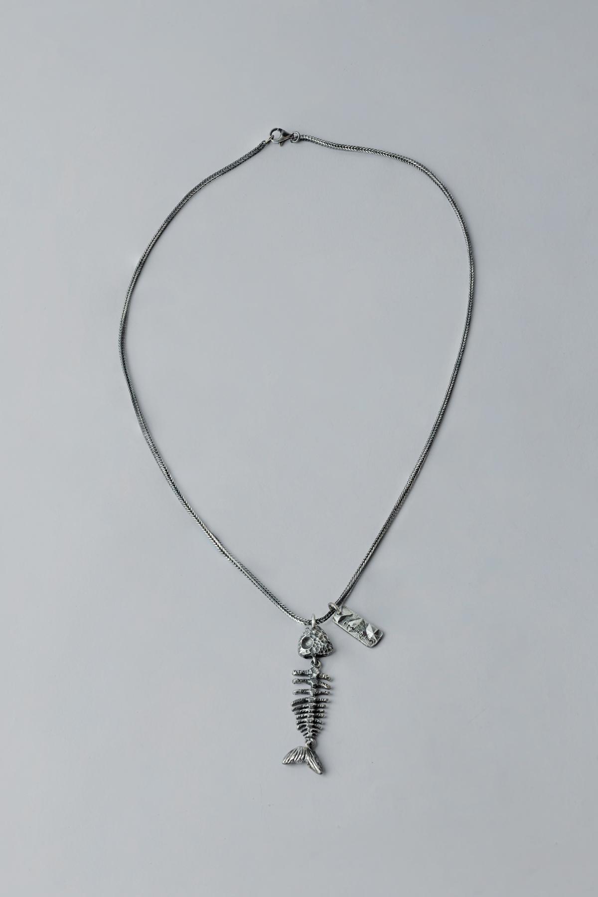 Silver necklace with fishbone pendant. Lobster clasp closure.