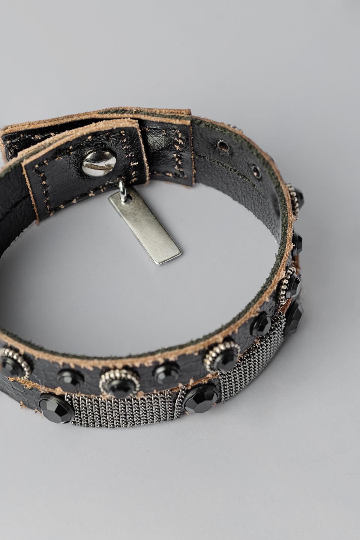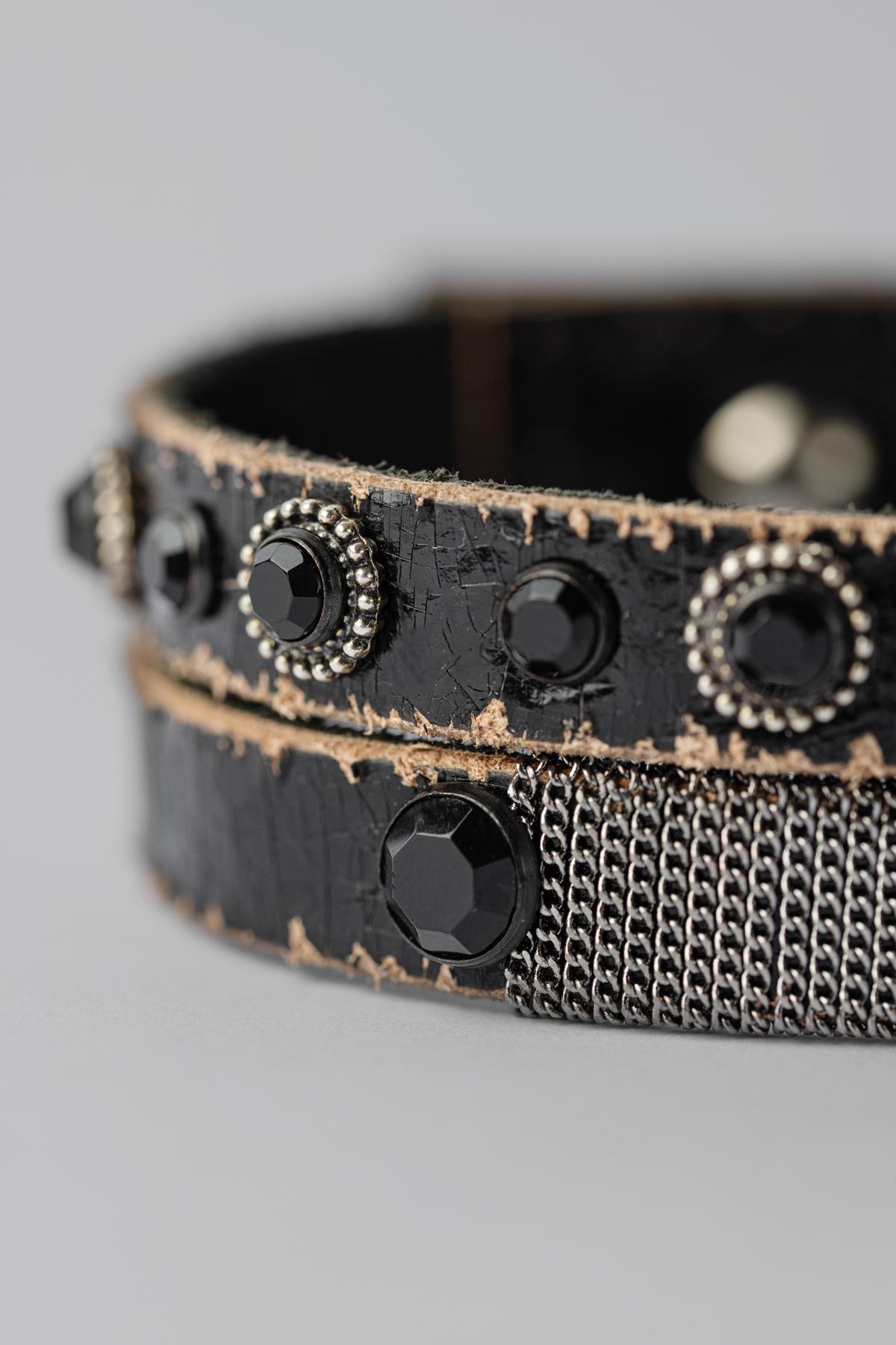Double bracelet in ruined effect leather. Application of onyx stone and metal wires. Button closure with through hole.