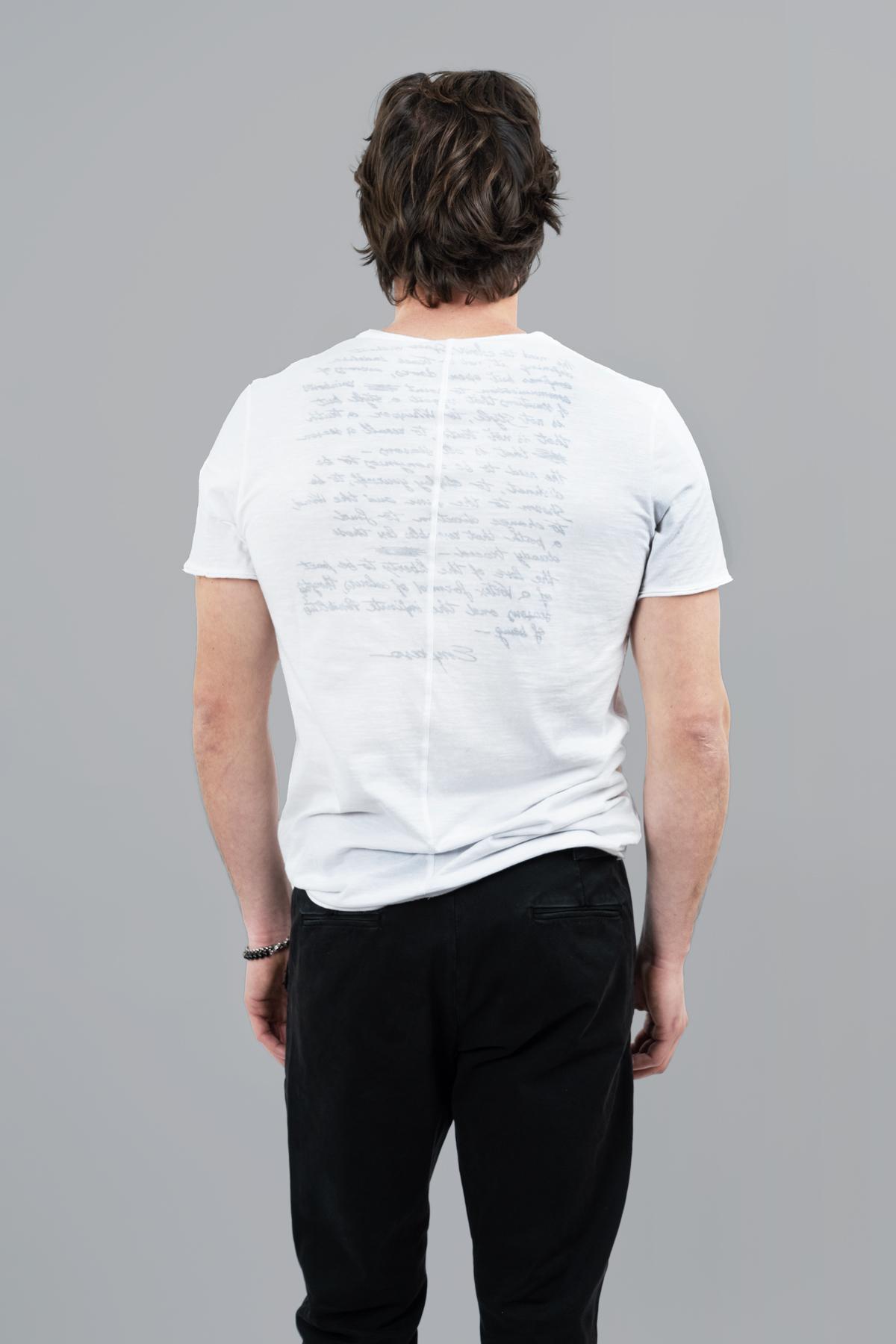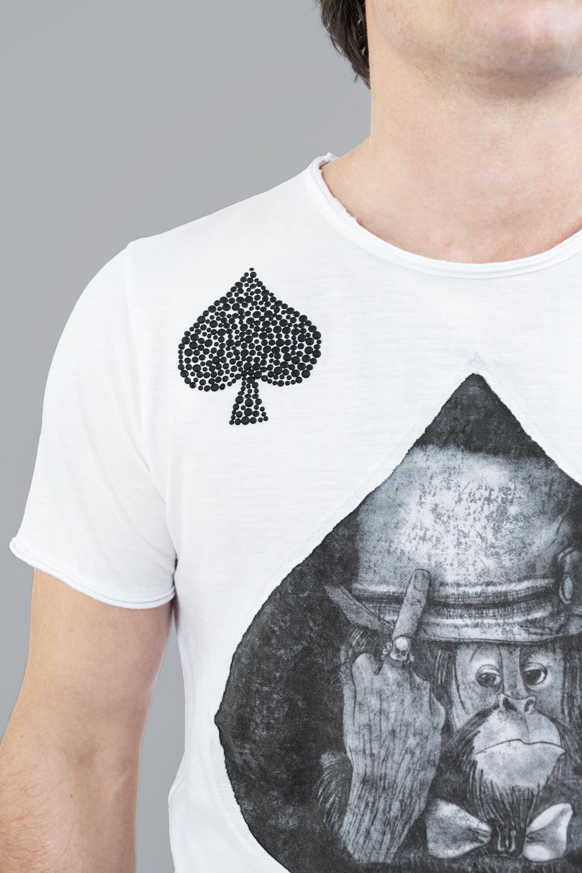Short-sleeved T-shirt. Print with monkey and spades with studs. Inside print with poetry. Raw cut hem.