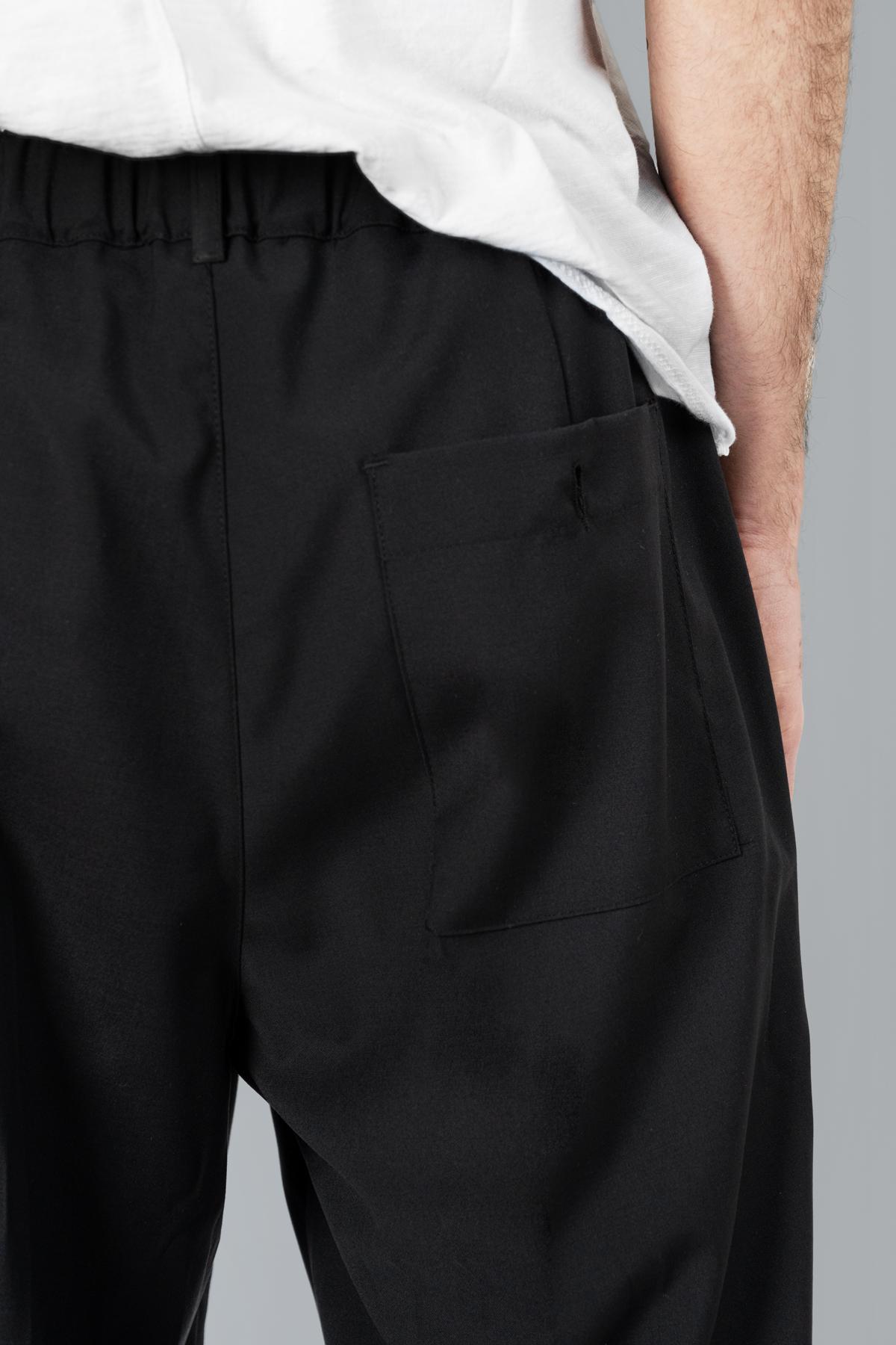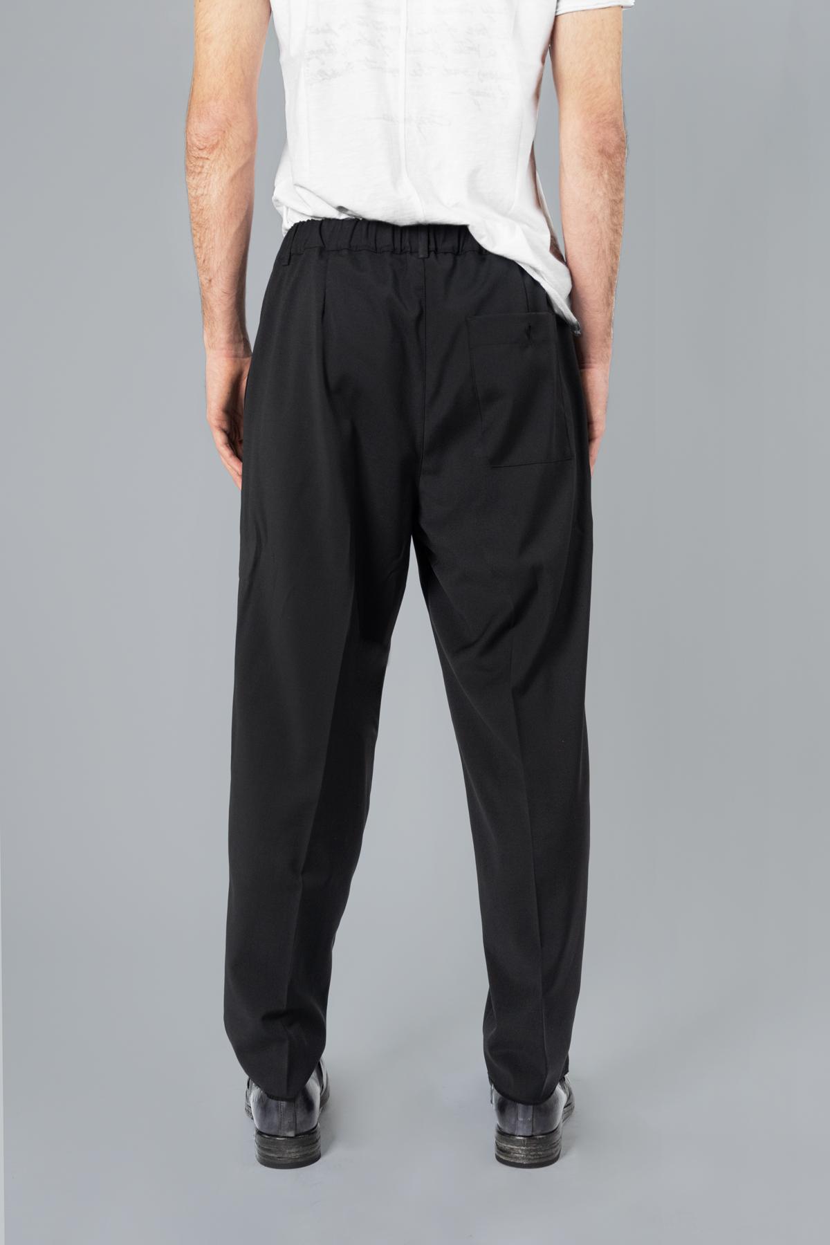 Wool blend pants with pleat. Elastic waistband, raw cut hem and back pocket with button.