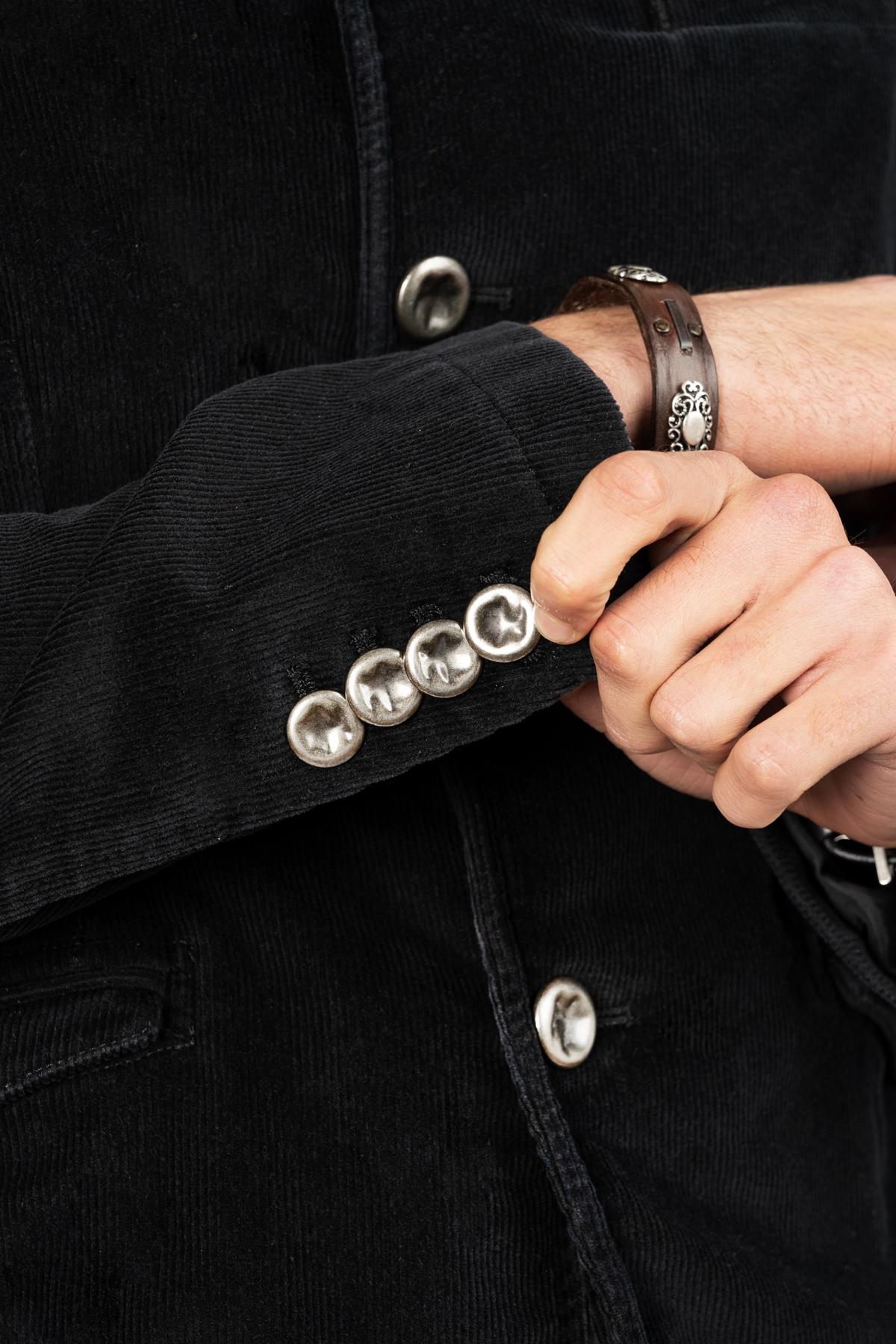 Black stone washed corduroy jacket with hammered metal buttons. Inner lining with poetry print.