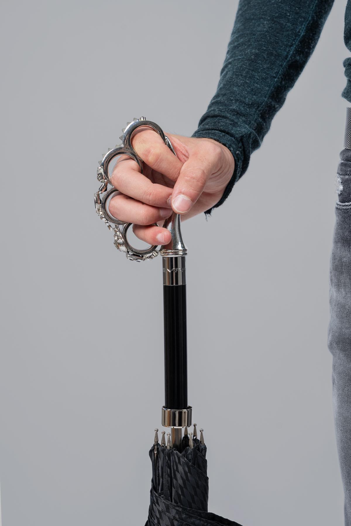 Black umbrella with geometric pattern. Knuckle-shaped handle with embedded black stones and engraved skulls.