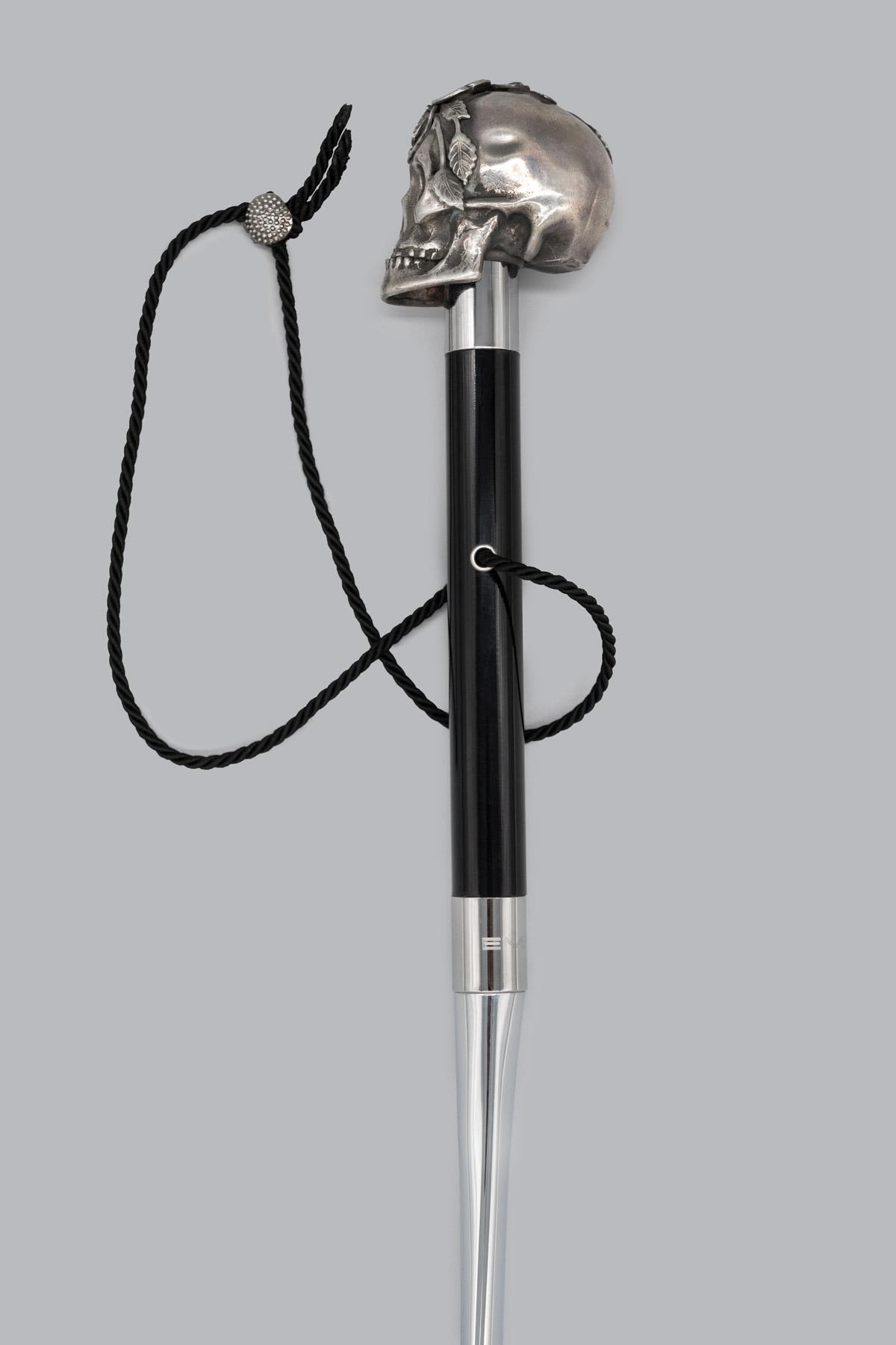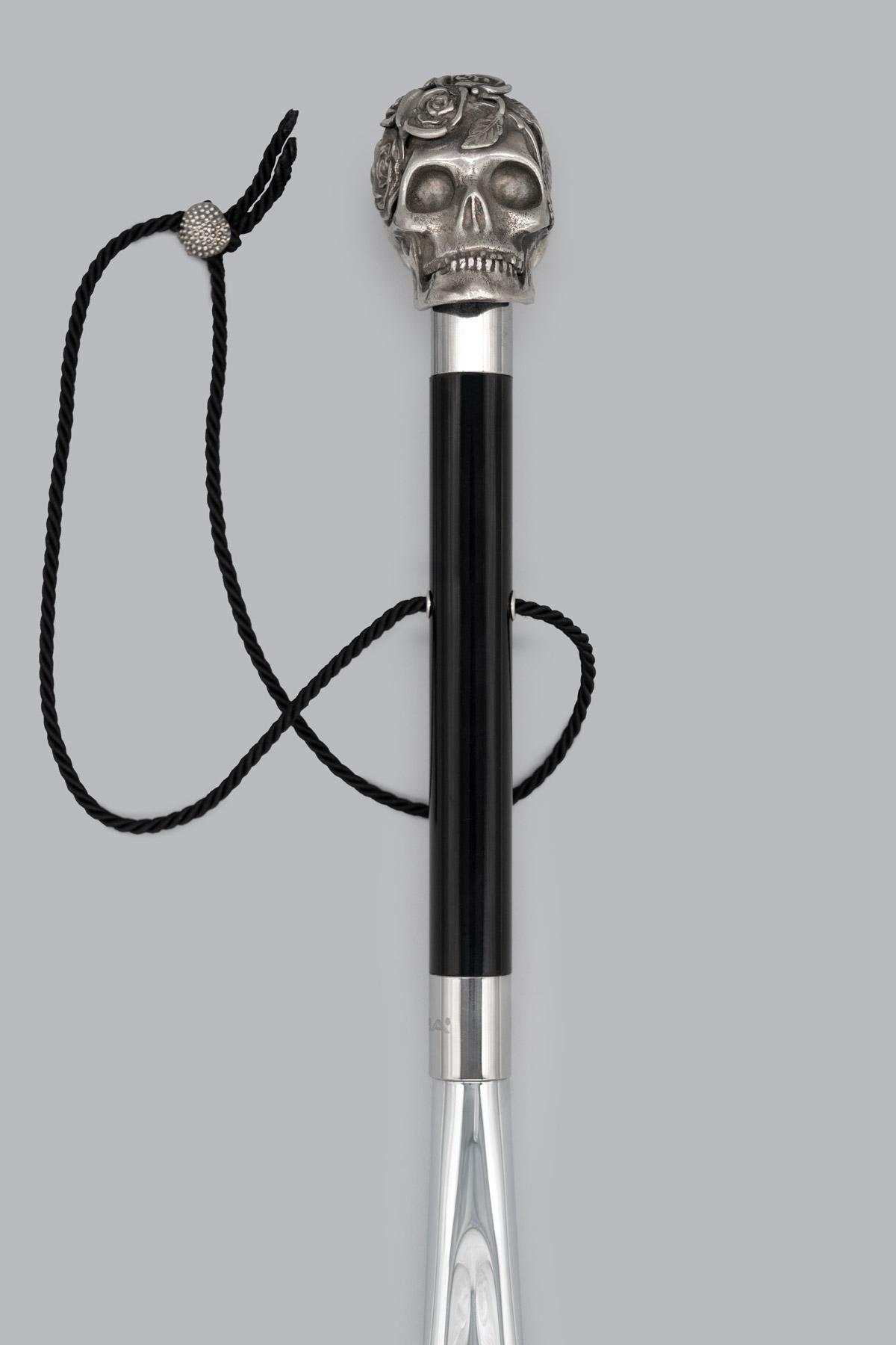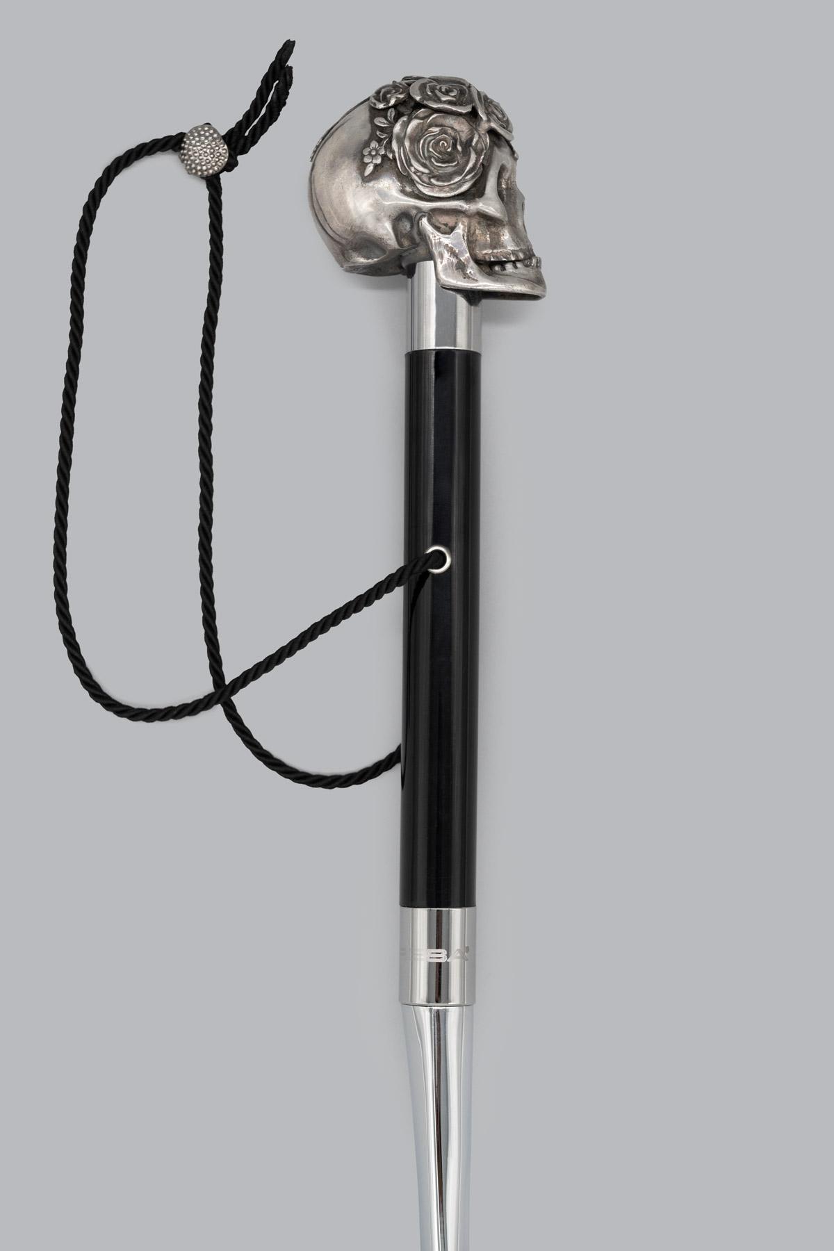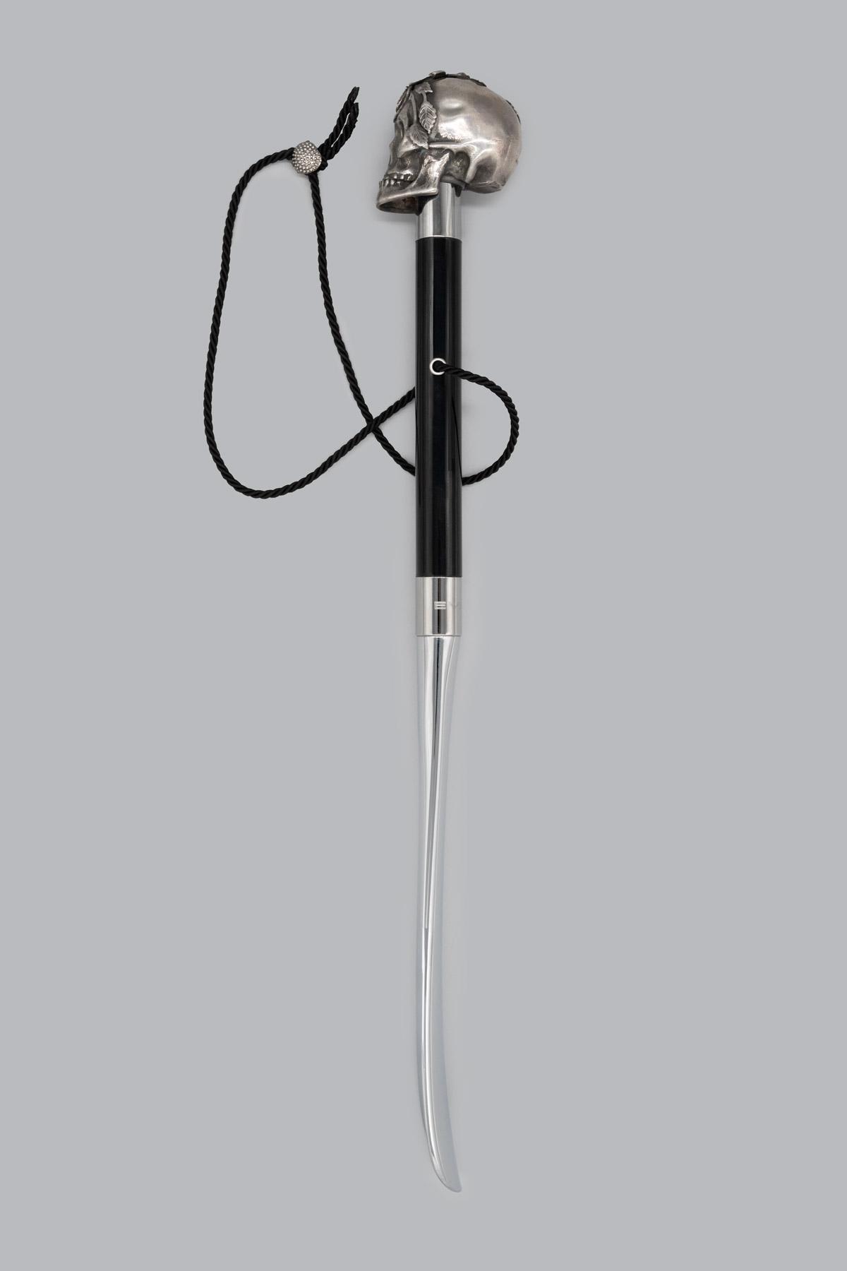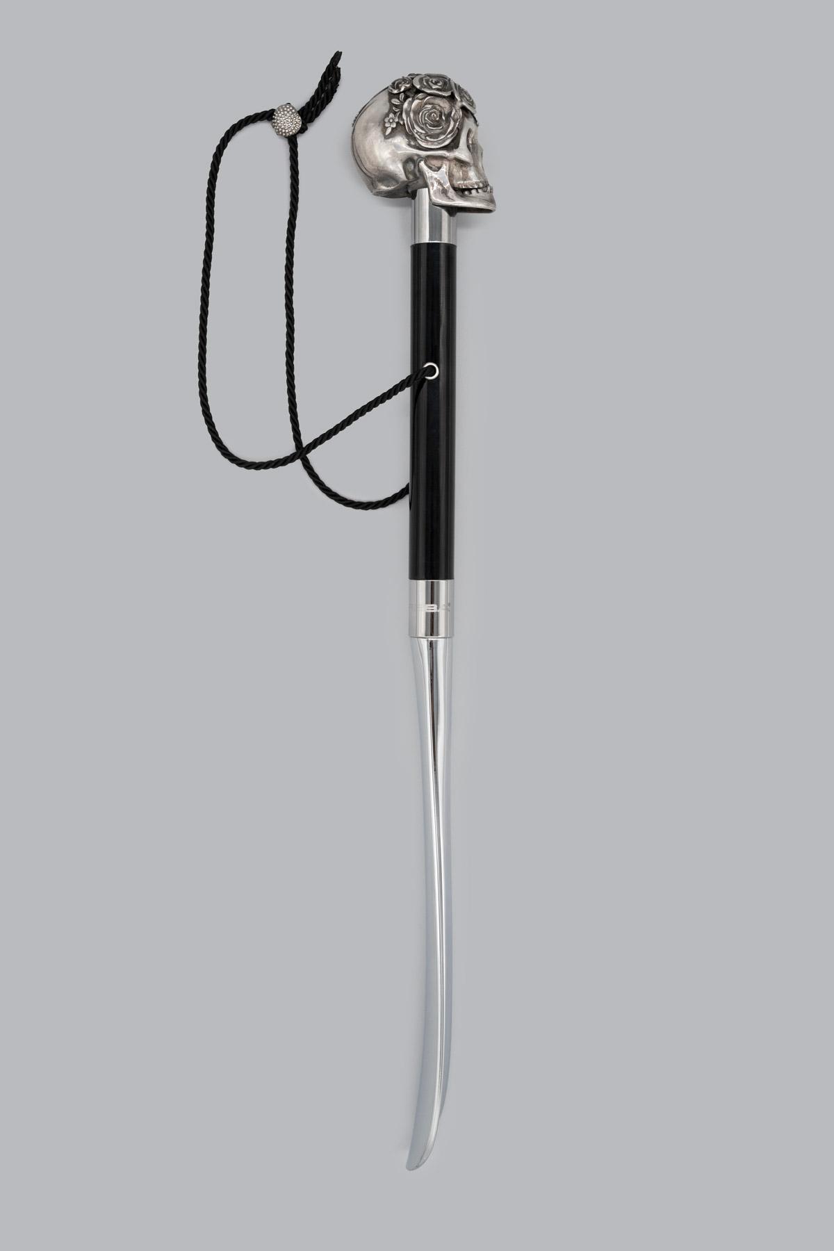 Shoehorn with skull-shaped handle with engraved roses. Silver-coloured paddle.