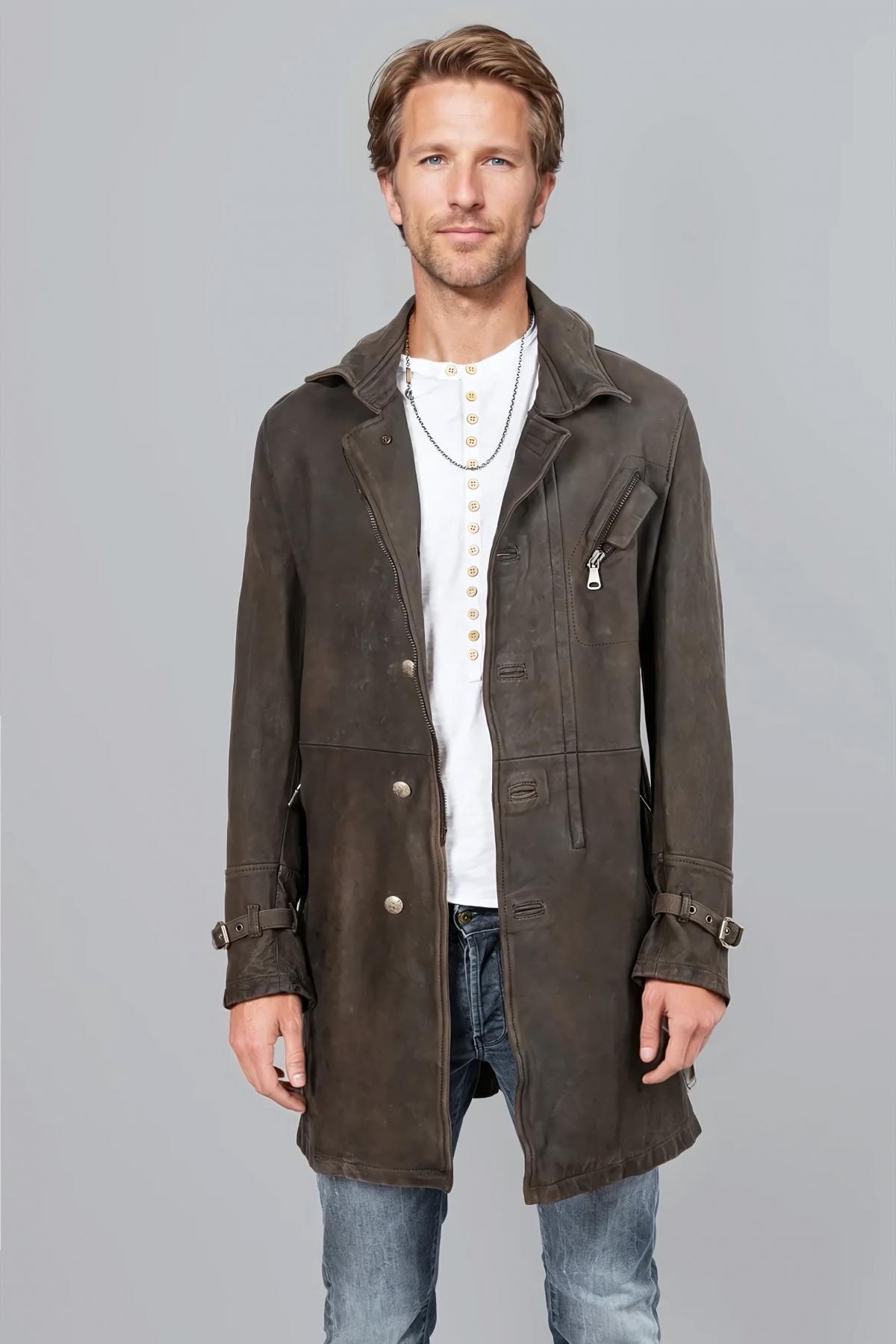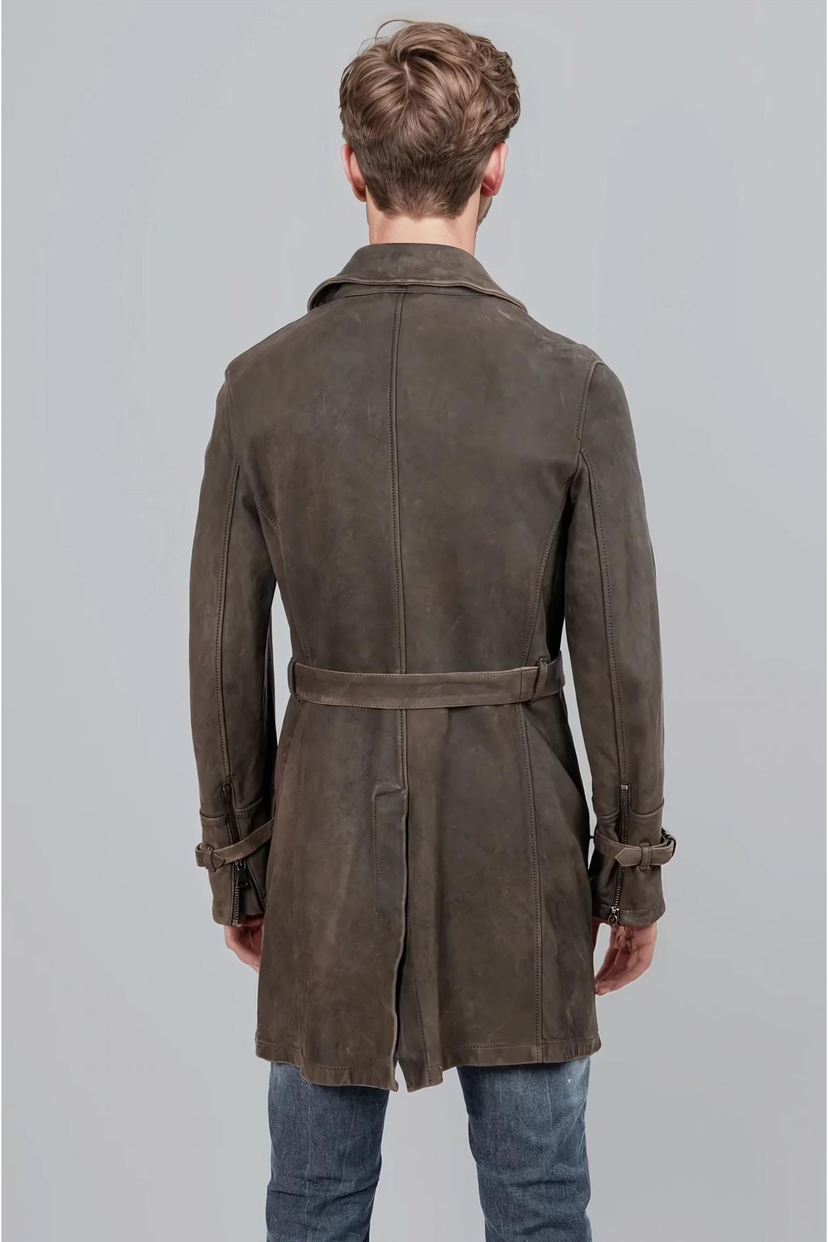 Leather trench coat, brown dabbed black. Zipper and metal button closure, waist belt with metal buckle with skulls.100% Nabuk Leather ...