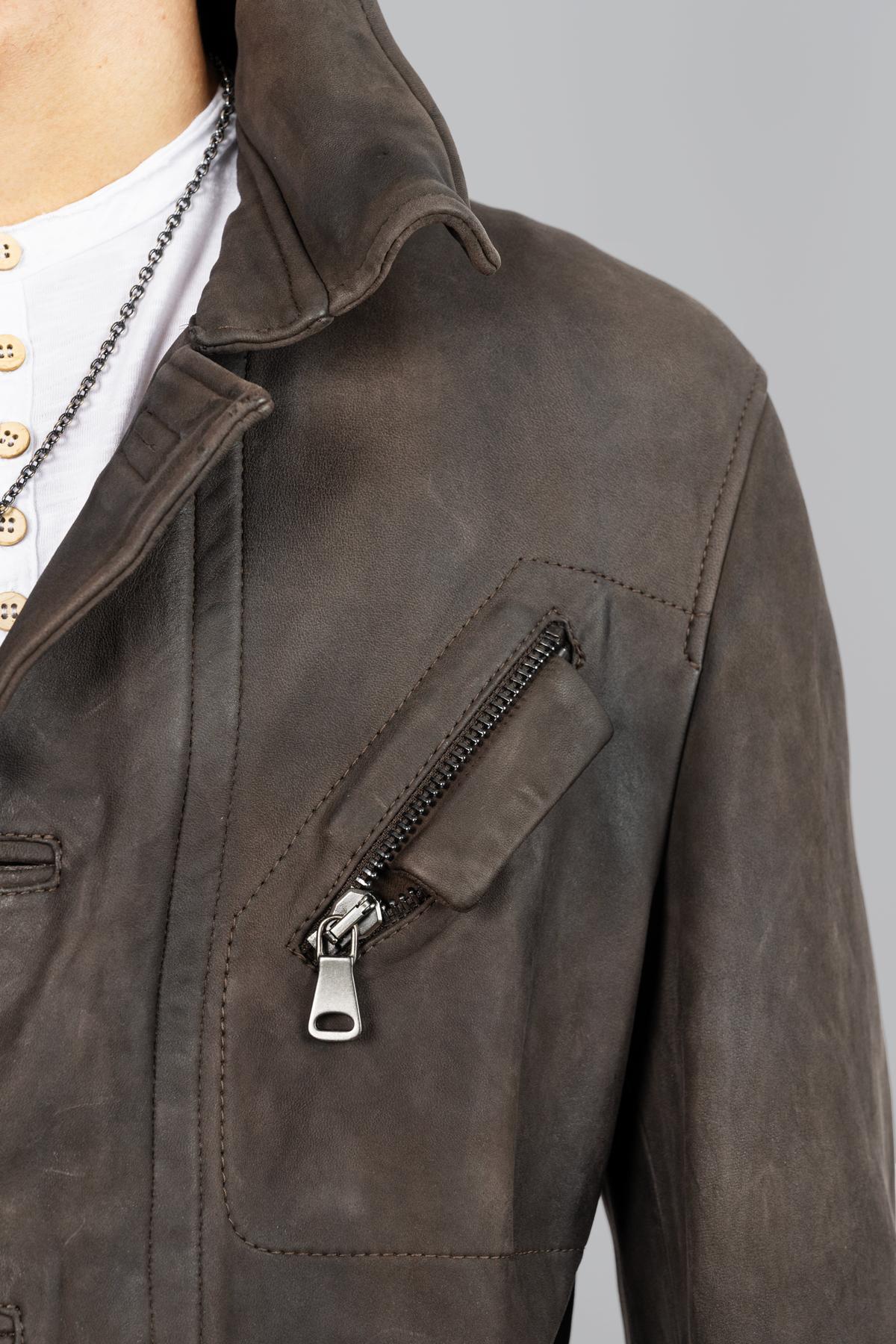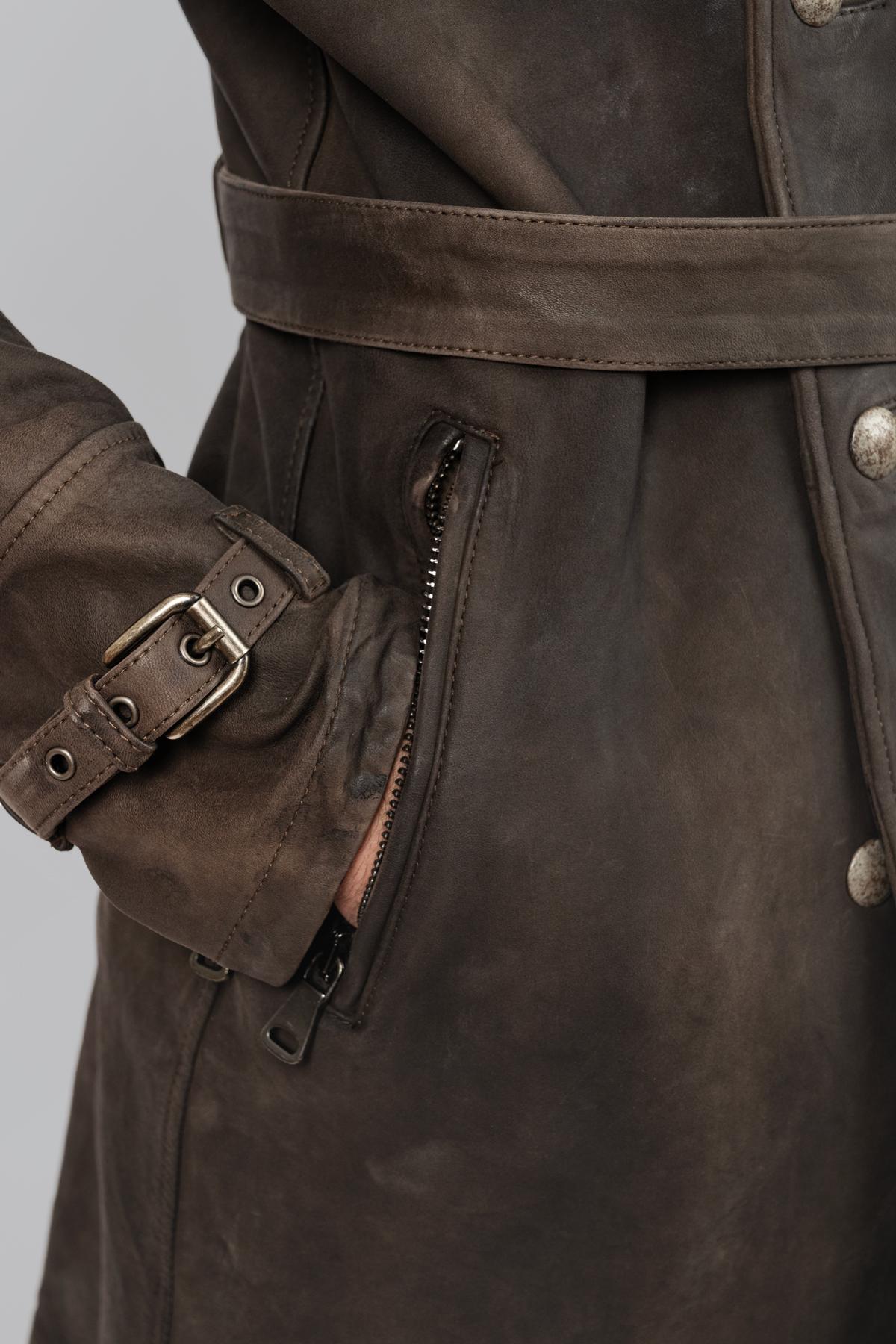 Leather trench coat, brown dabbed black. Zipper and metal button closure, waist belt with metal buckle with skulls.