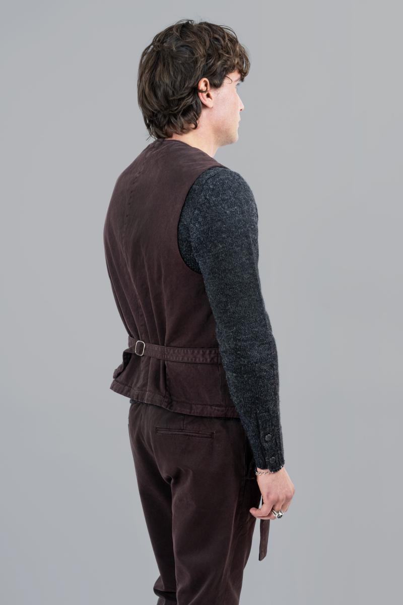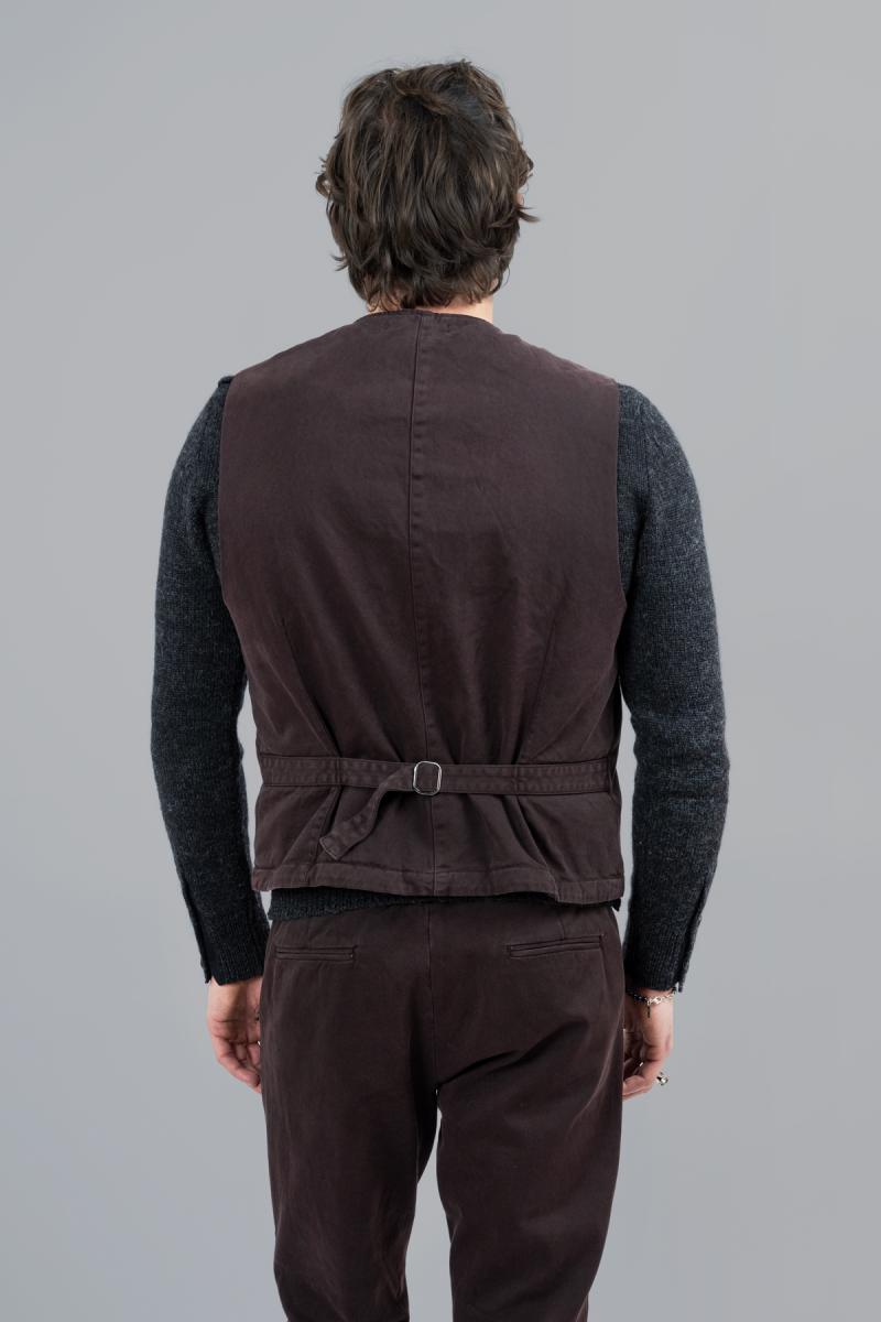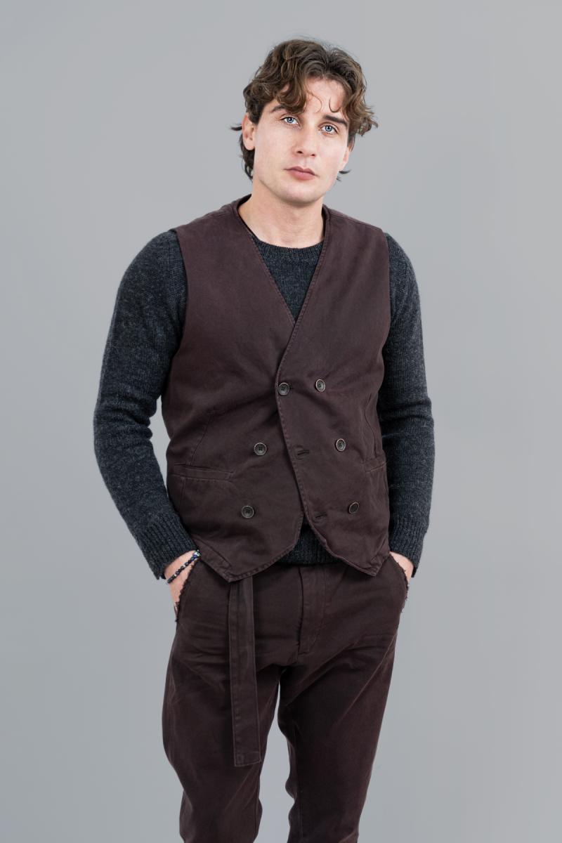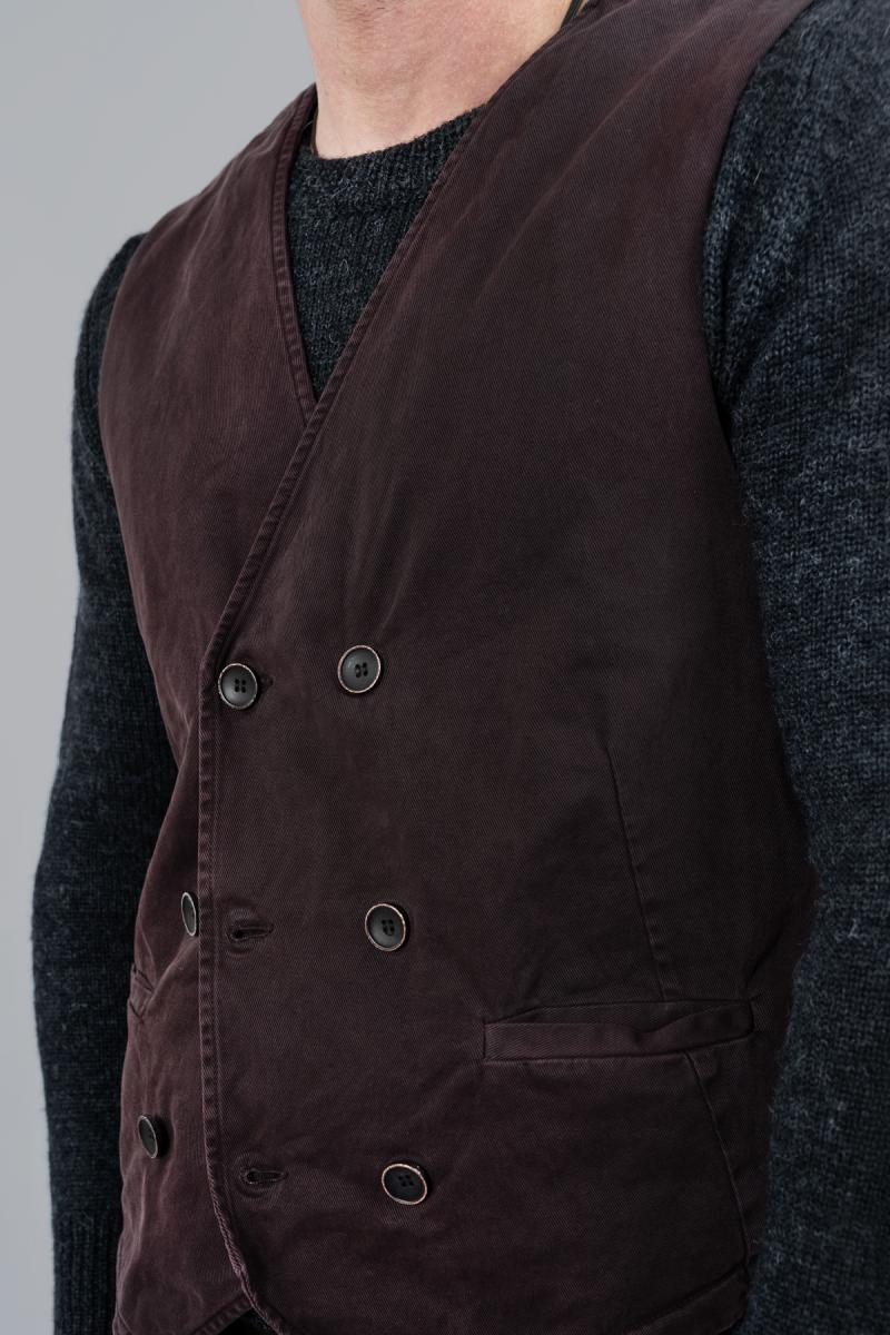 Double-breasted vest with six buttons.Front welt pockets. Adjustable back strap.