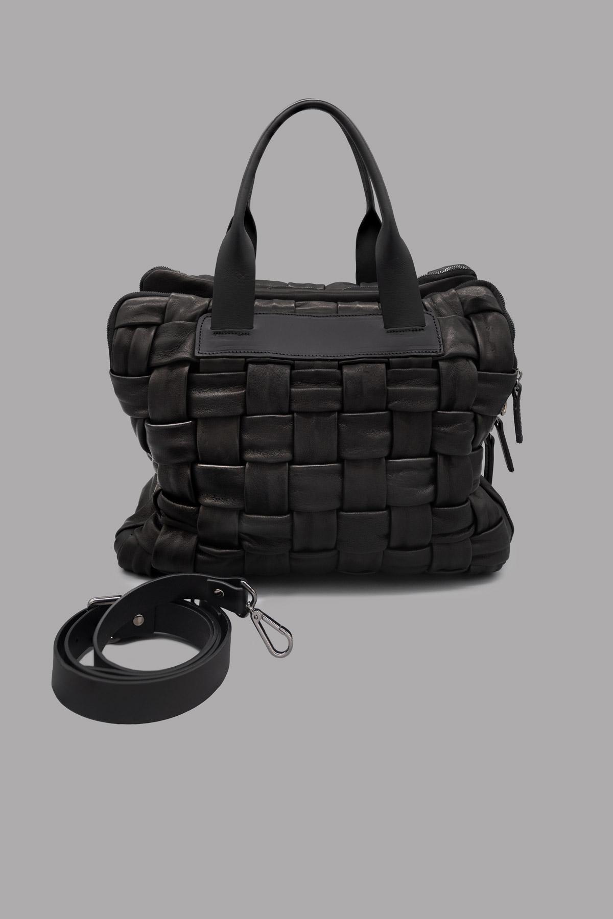 24-hour bag in woven leather with double handles. Three internal compartments with zip closures. Adjustable and removable shoulder strap.
