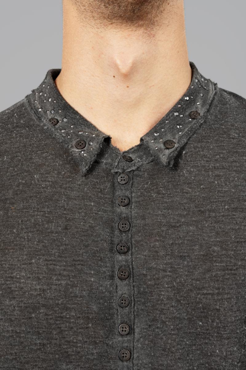 Long-sleeved polo t-shirt. Buttons in the center and on sleeves. Studs on collar and inner poem print.