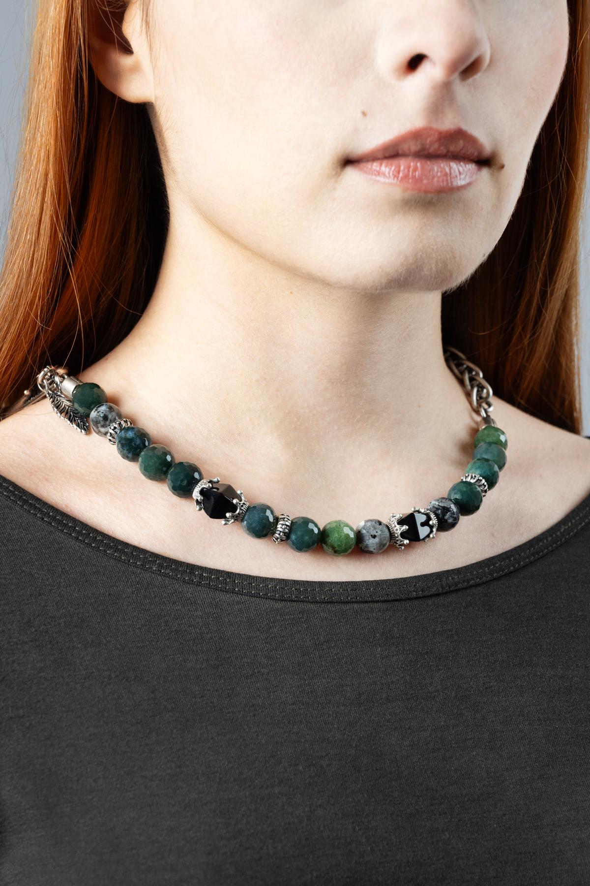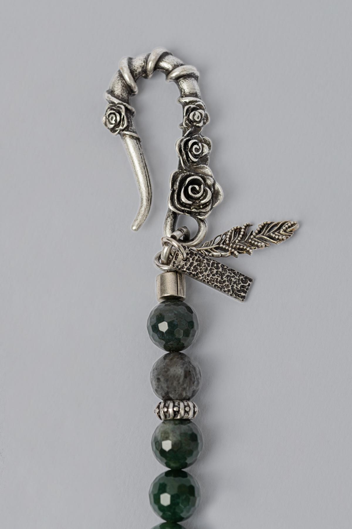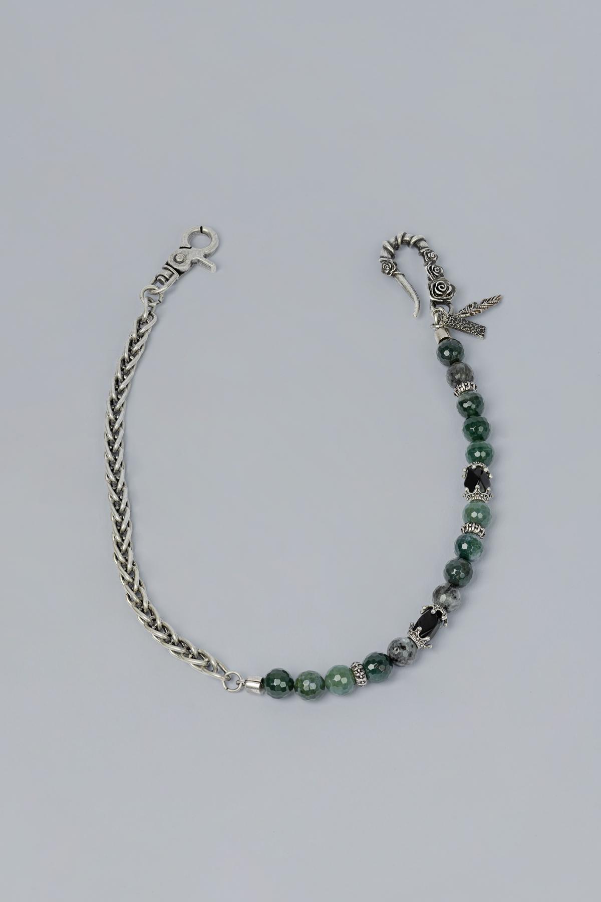 Trouser chain with green natural stones. Hook with engraved roses and feather pendant. Can also be worn as a necklace.