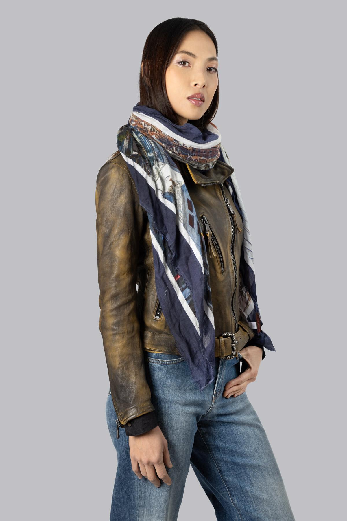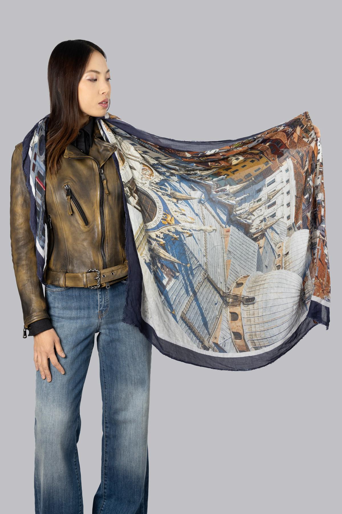 Scarf with a print of the city of Venice. Raw-cut hem.
