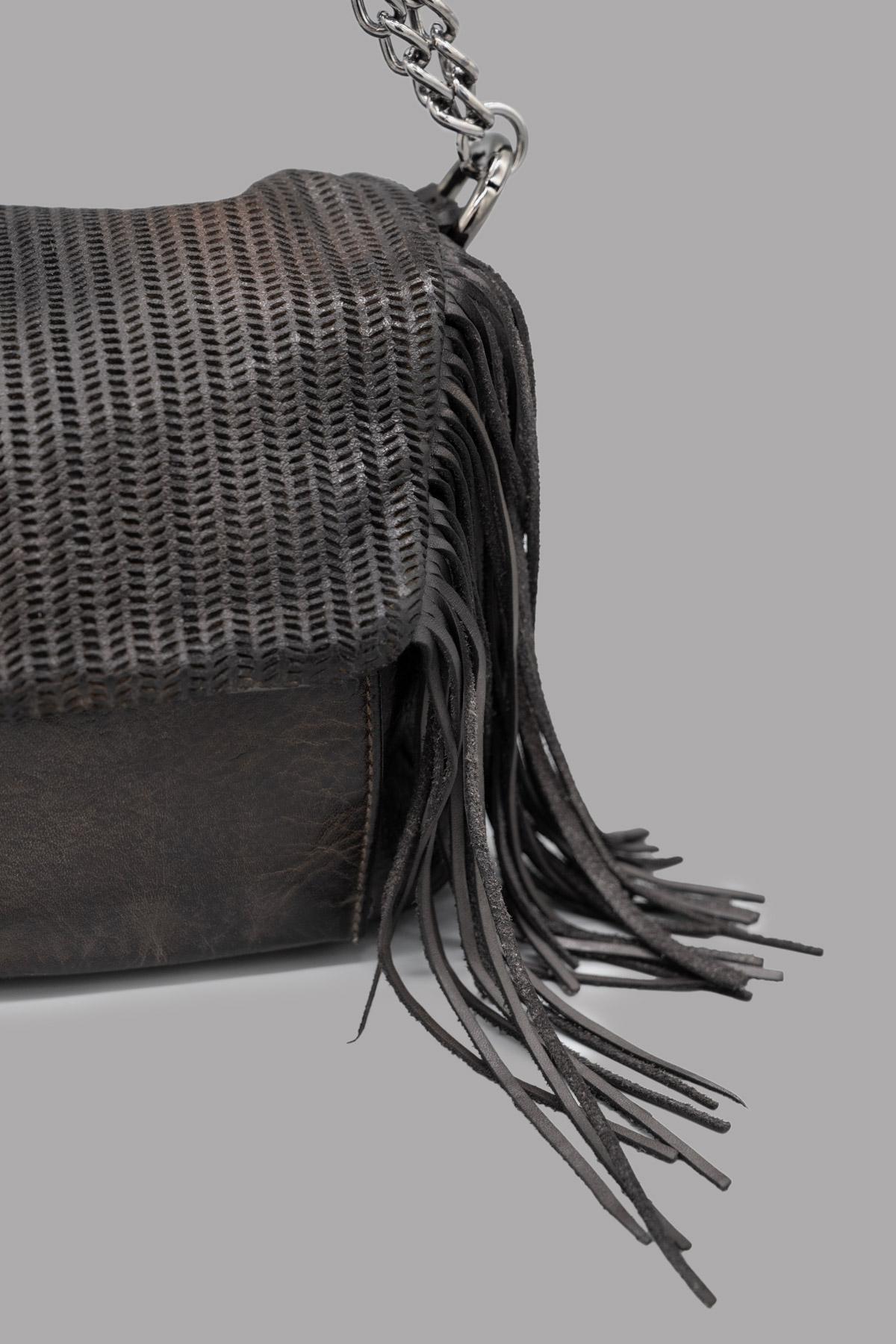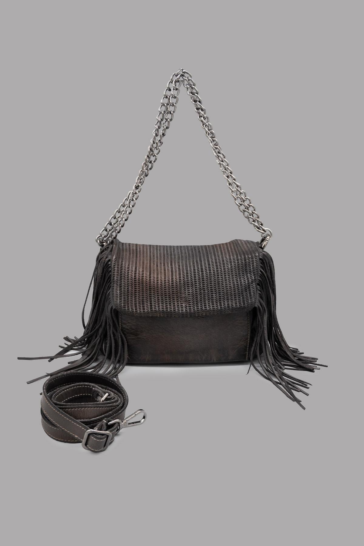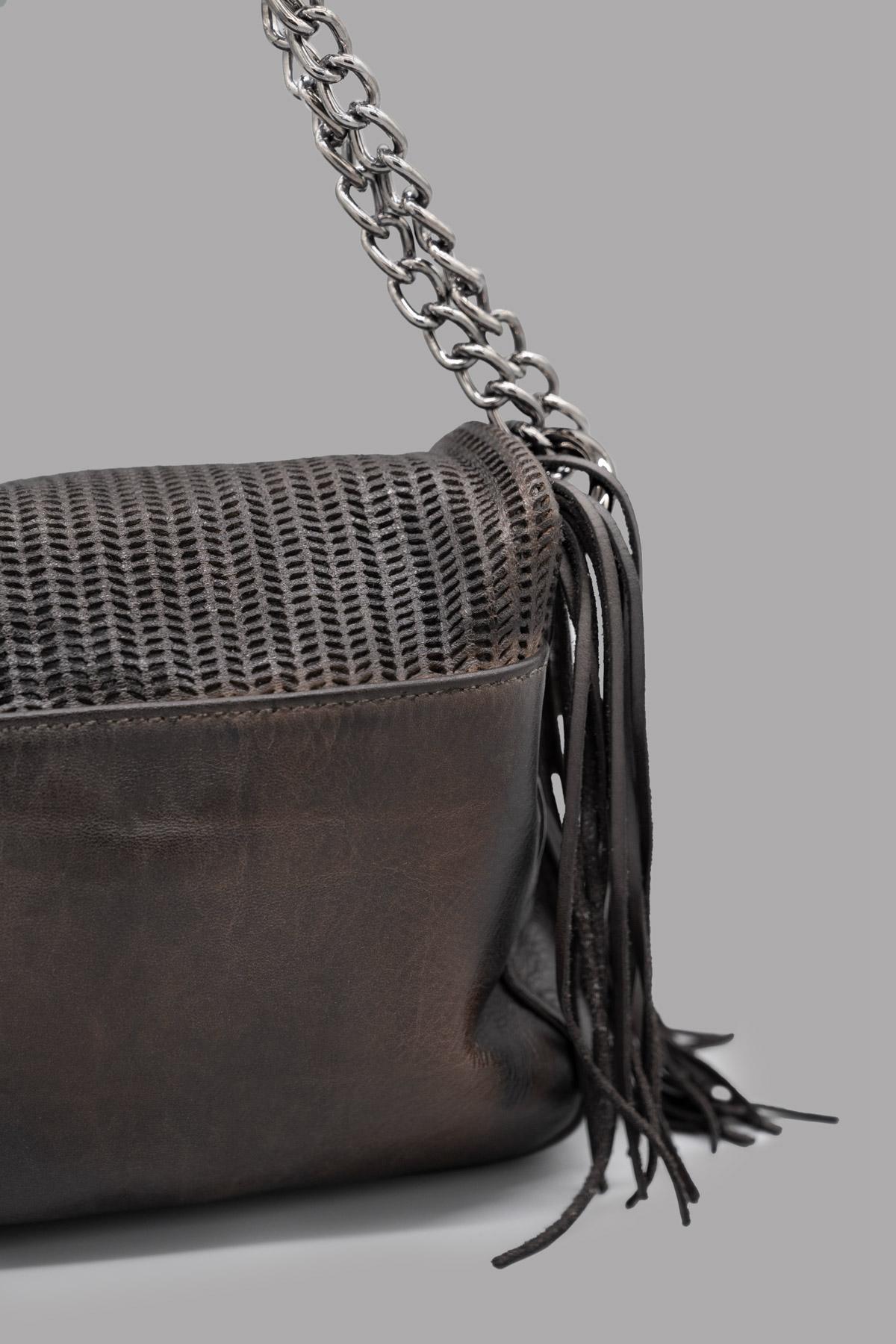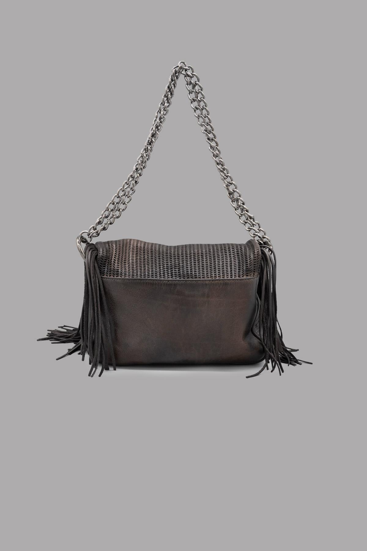 Lasered leather shoulder bag with fringes. Three internal compartments with button closure. Removable chain handle. Equipped with adjustable shoulder strap.