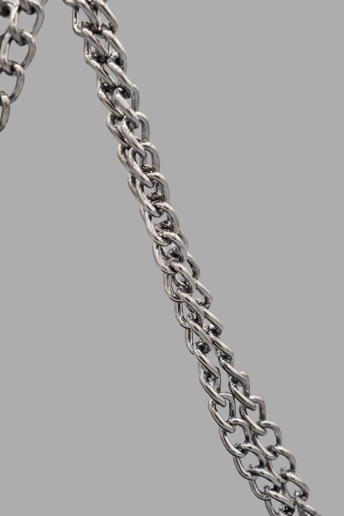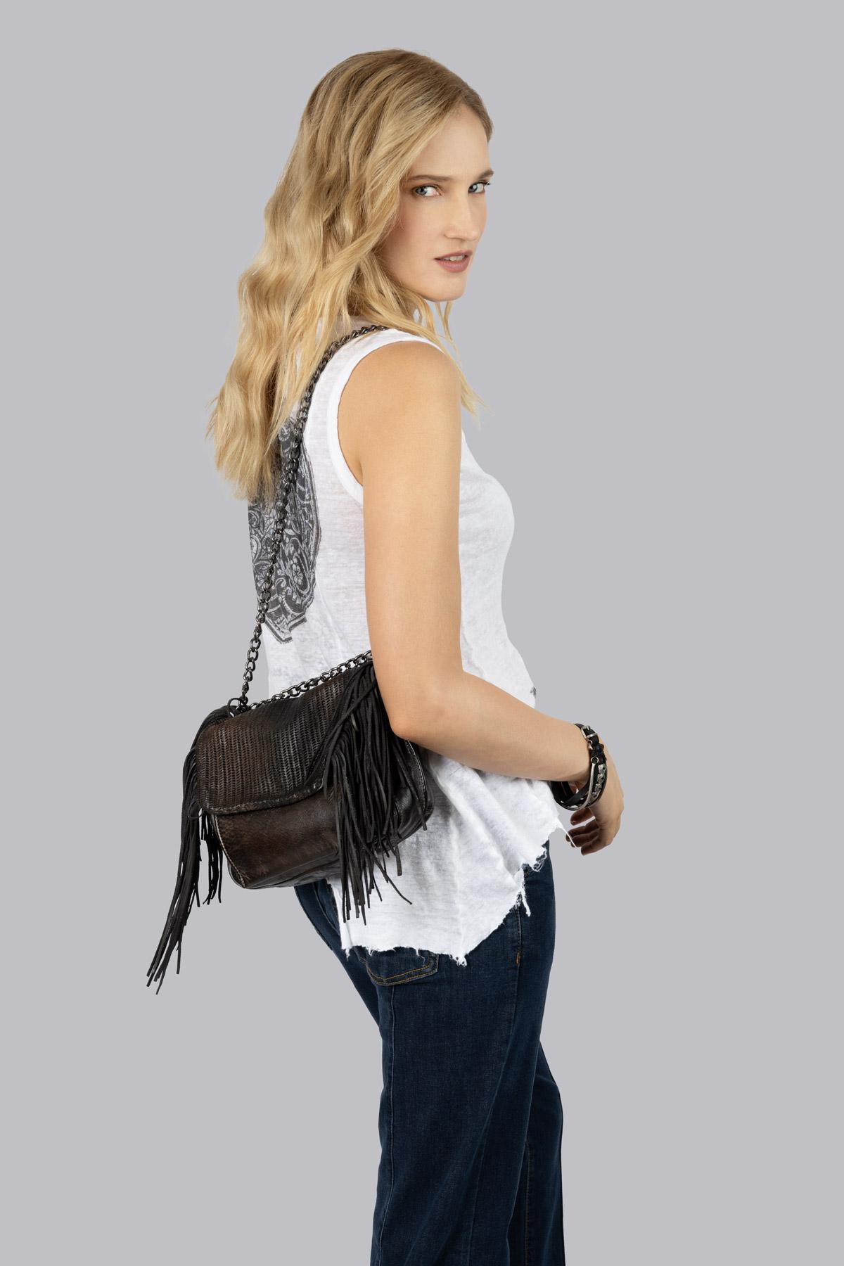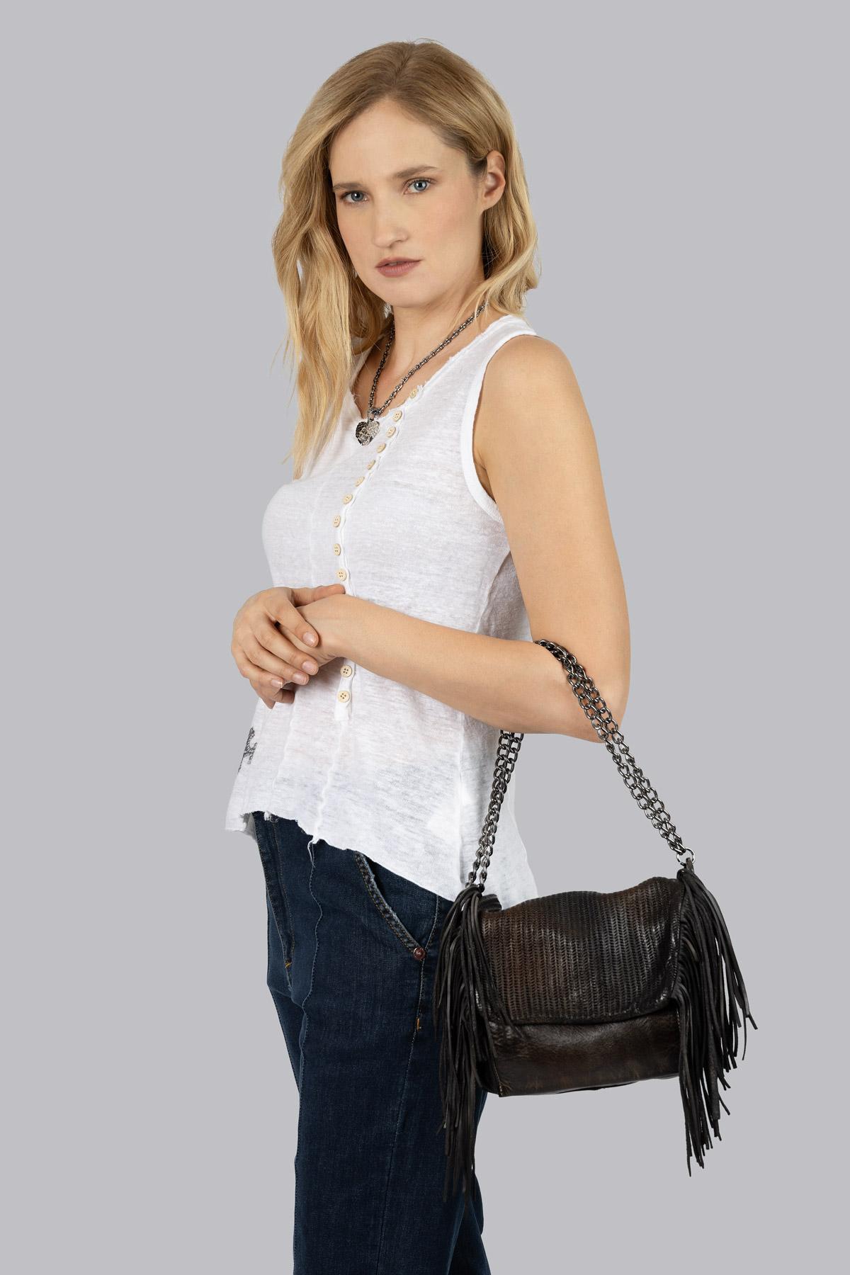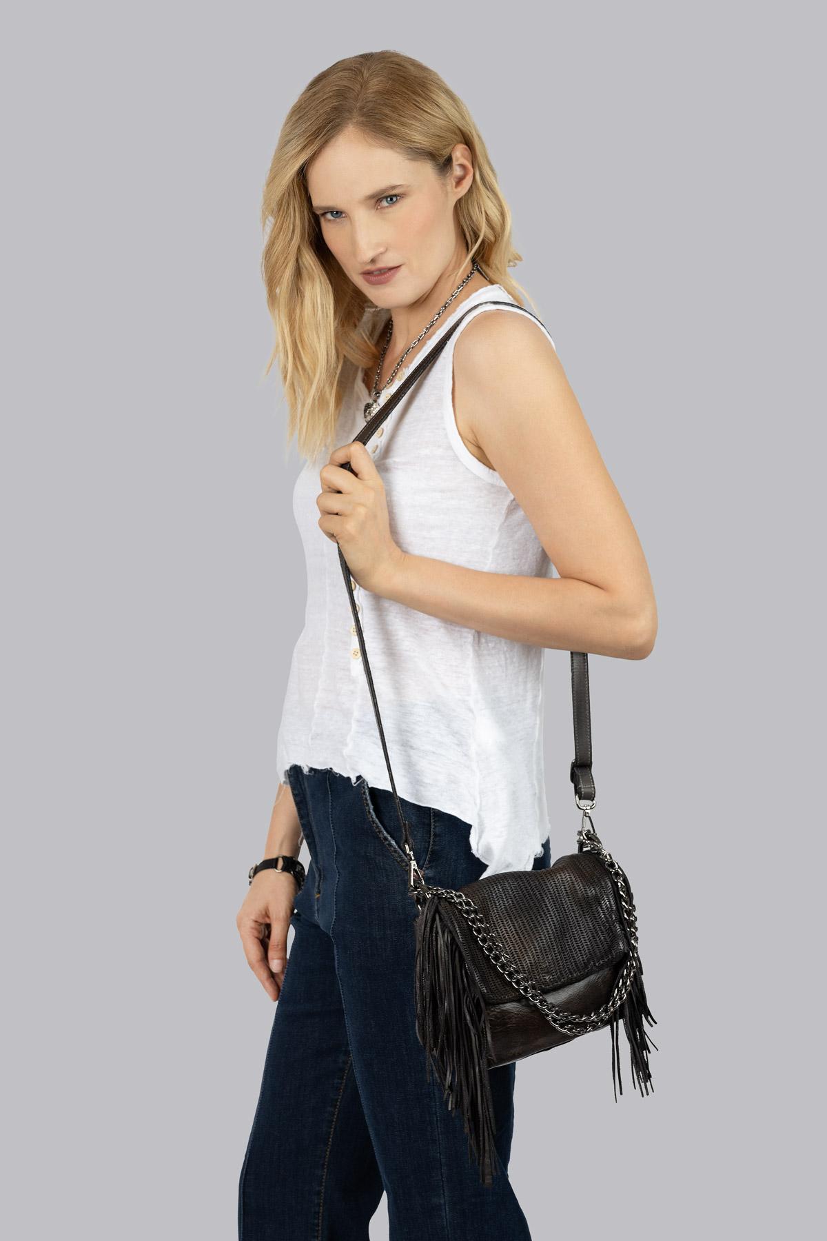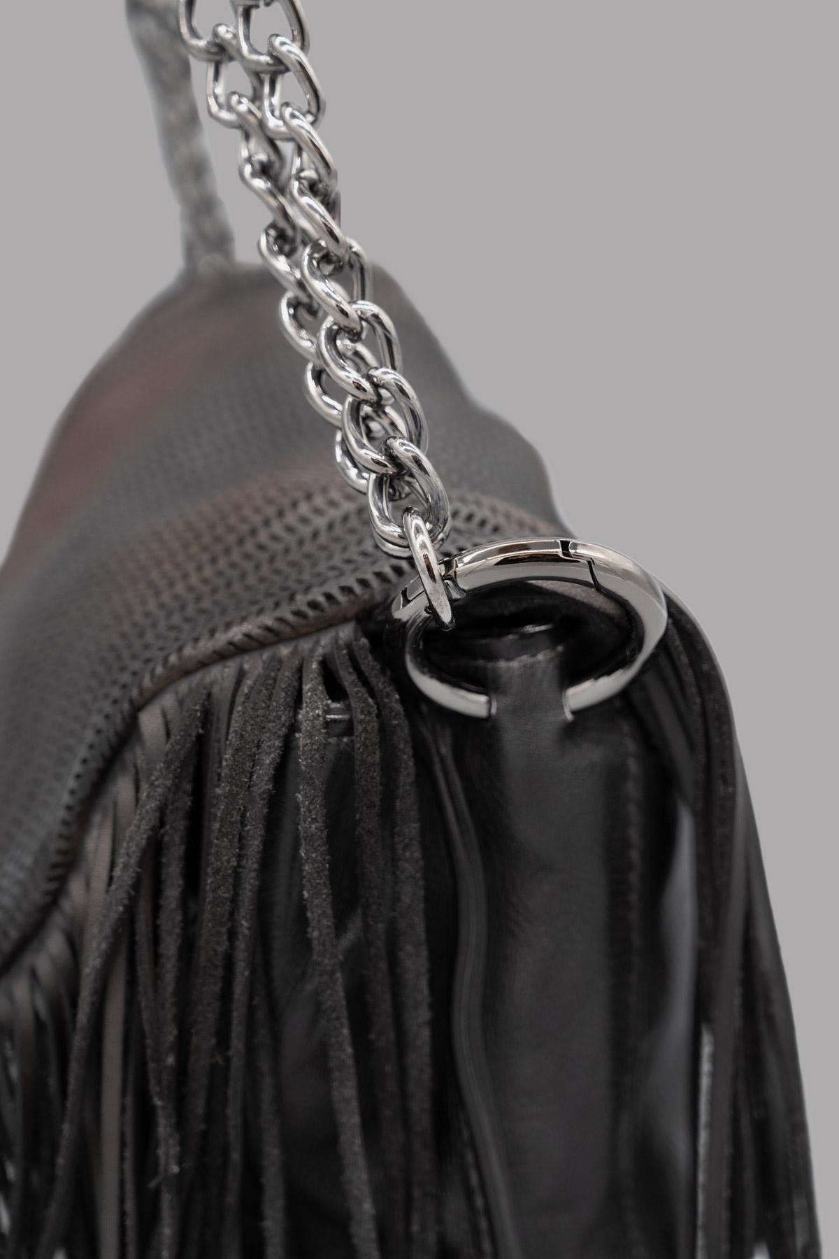 Lasered leather shoulder bag with fringes. Three internal compartments with button closure. Removable chain handle. Equipped with adjustable shoulder strap.