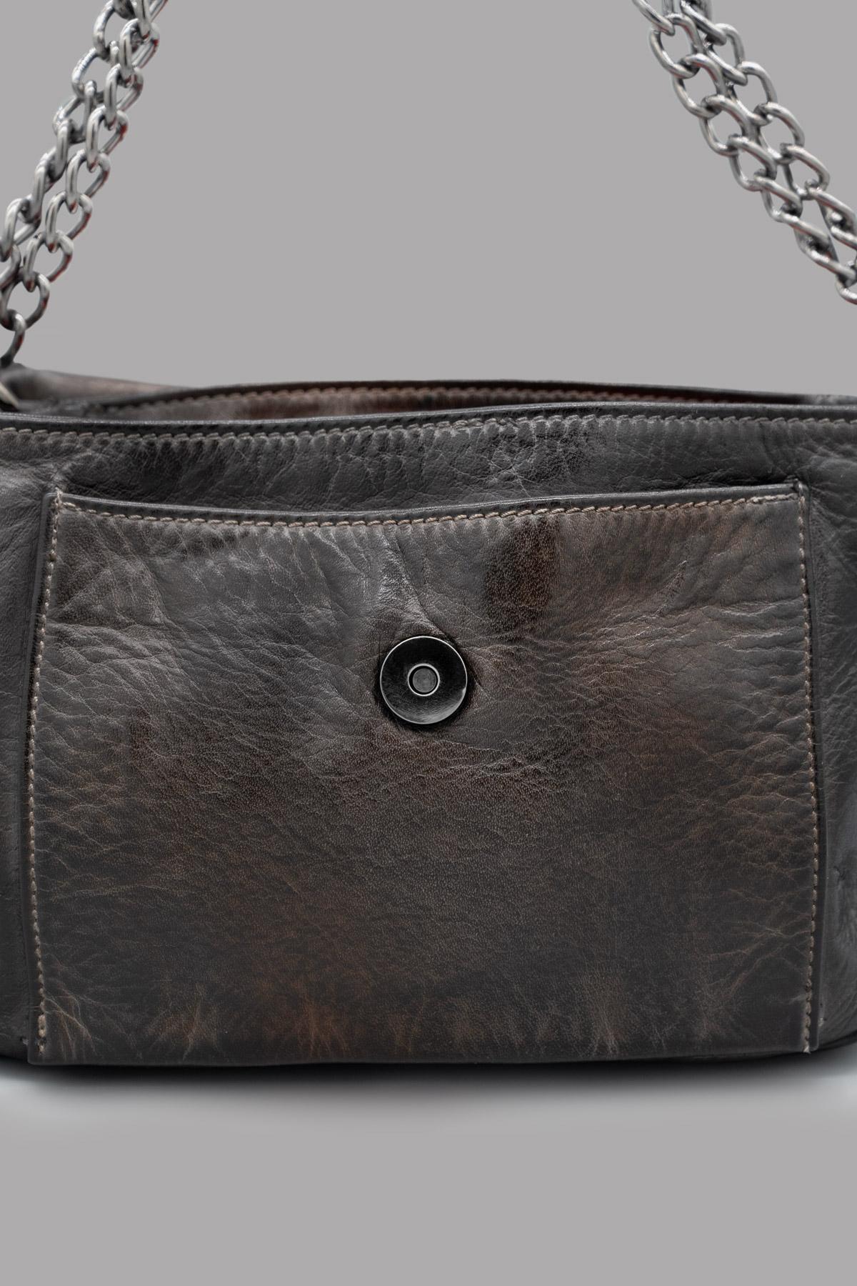 Lasered leather shoulder bag with fringes. Three internal compartments with button closure. Removable chain handle. Equipped with adjustable shoulder strap.Calf LeatherMe ...