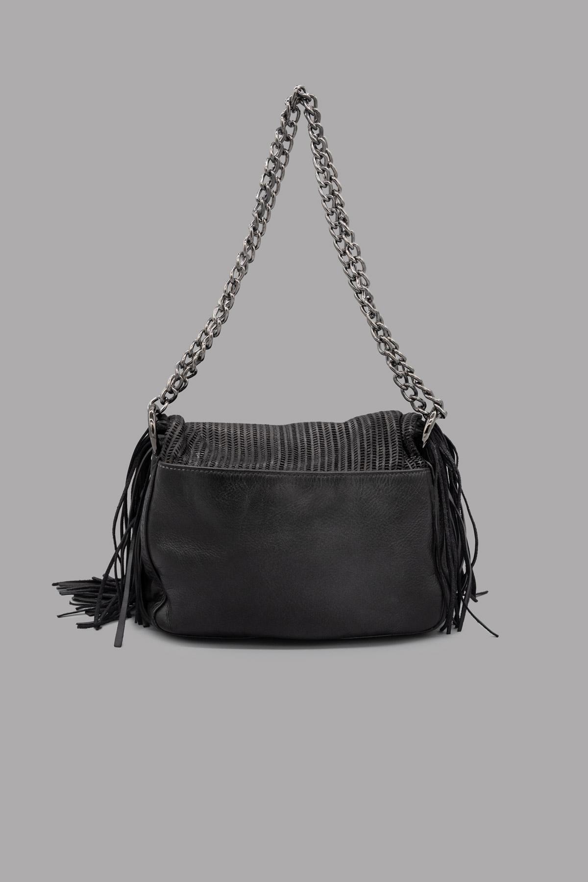 Lasered leather shoulder bag with fringes. Three internal compartments with button closure. Removable chain handle. Equipped with adjustable shoulder strap.Calf LeatherMe ...