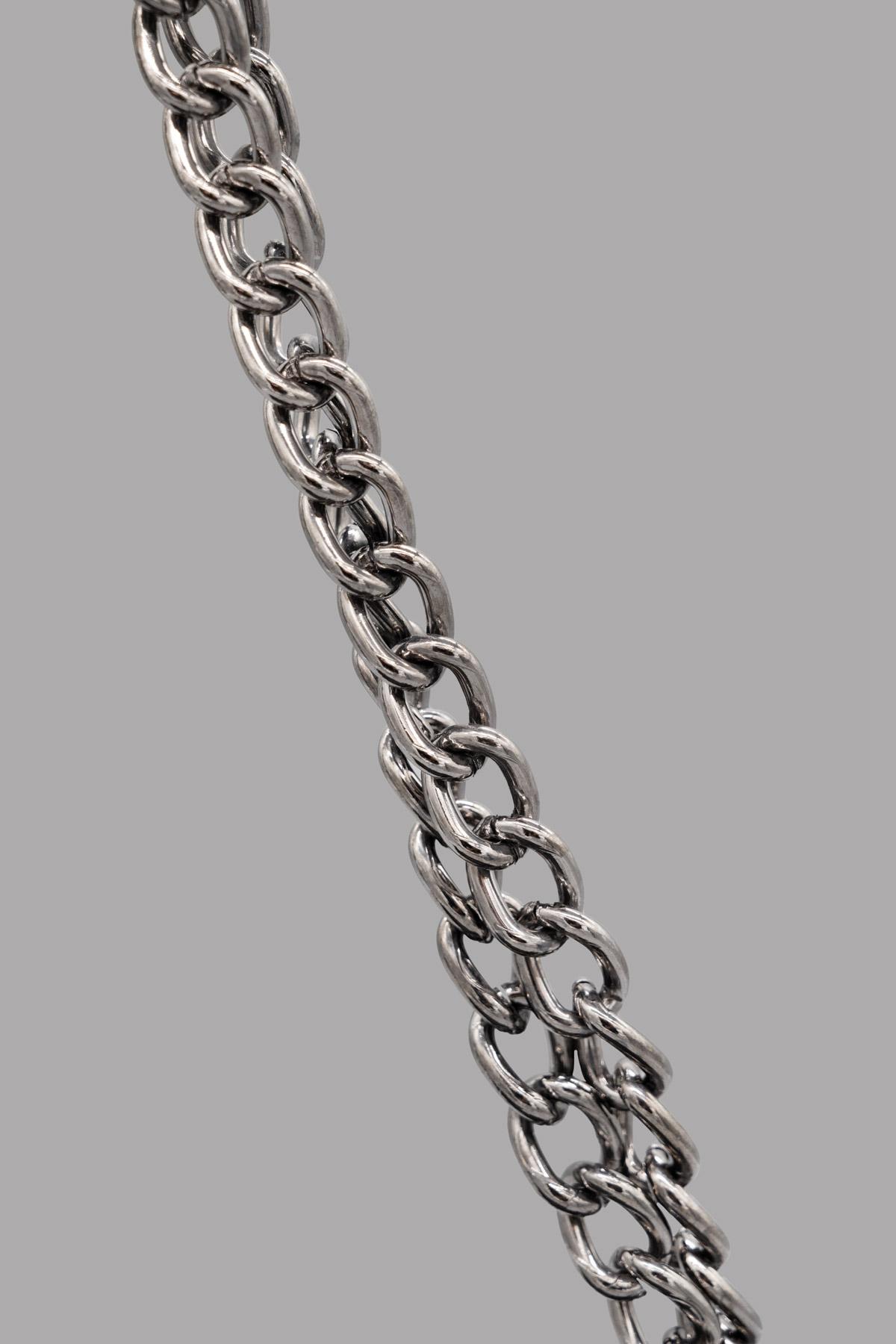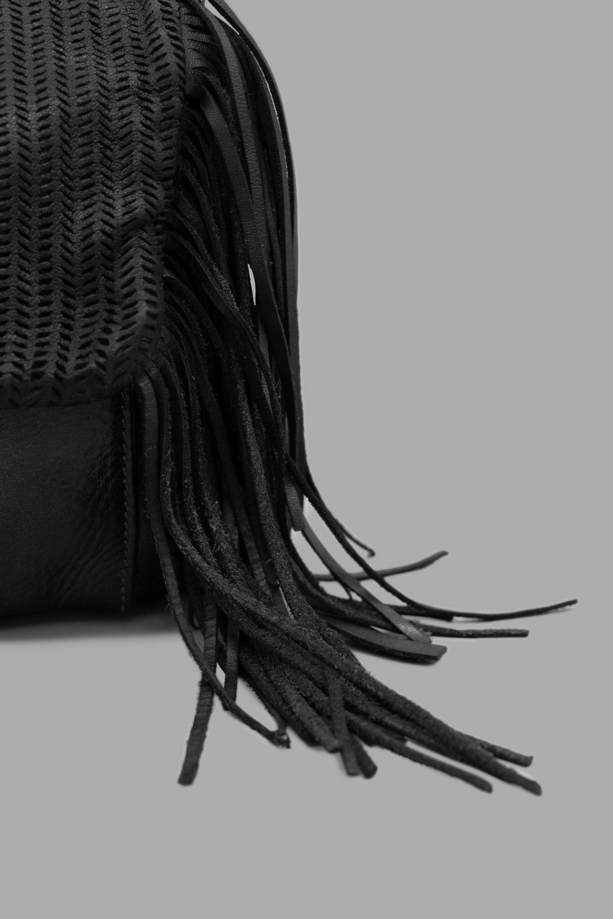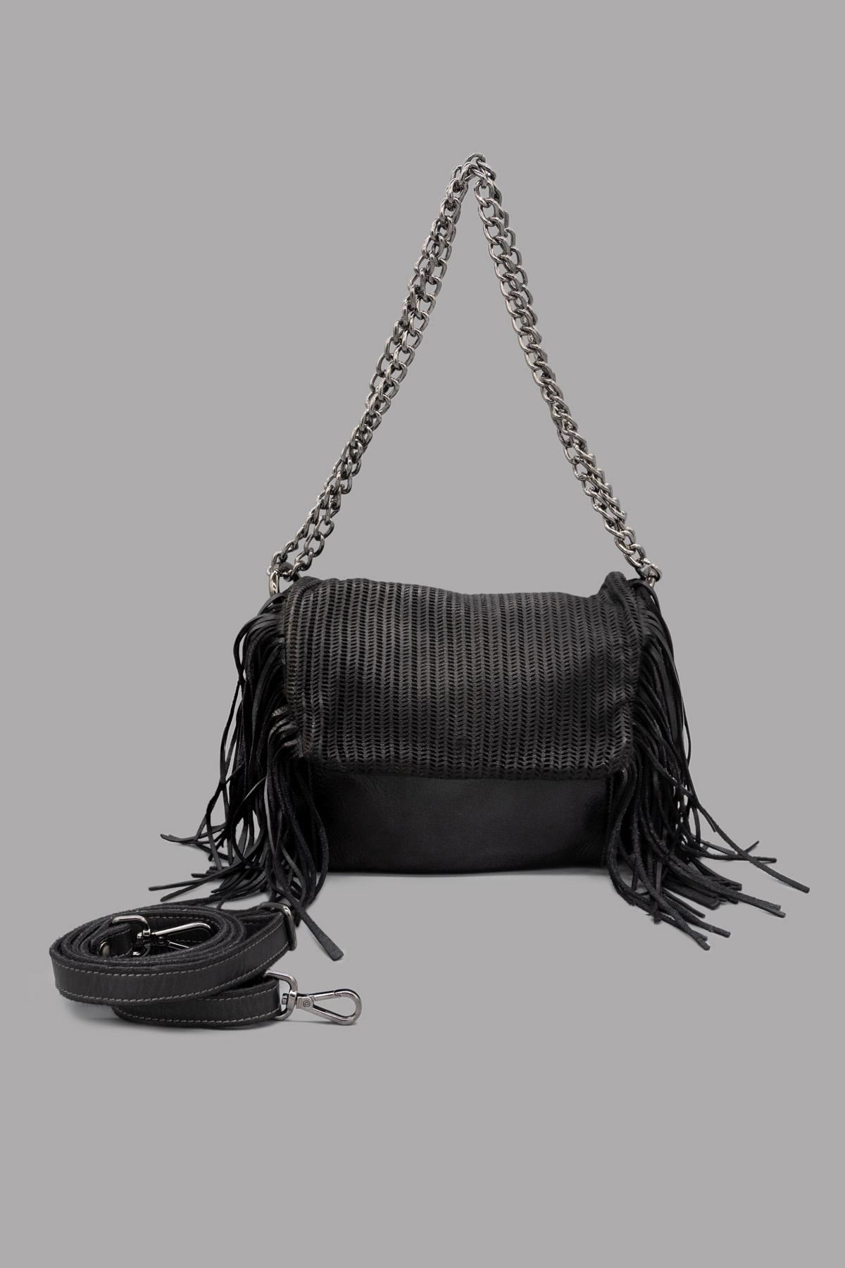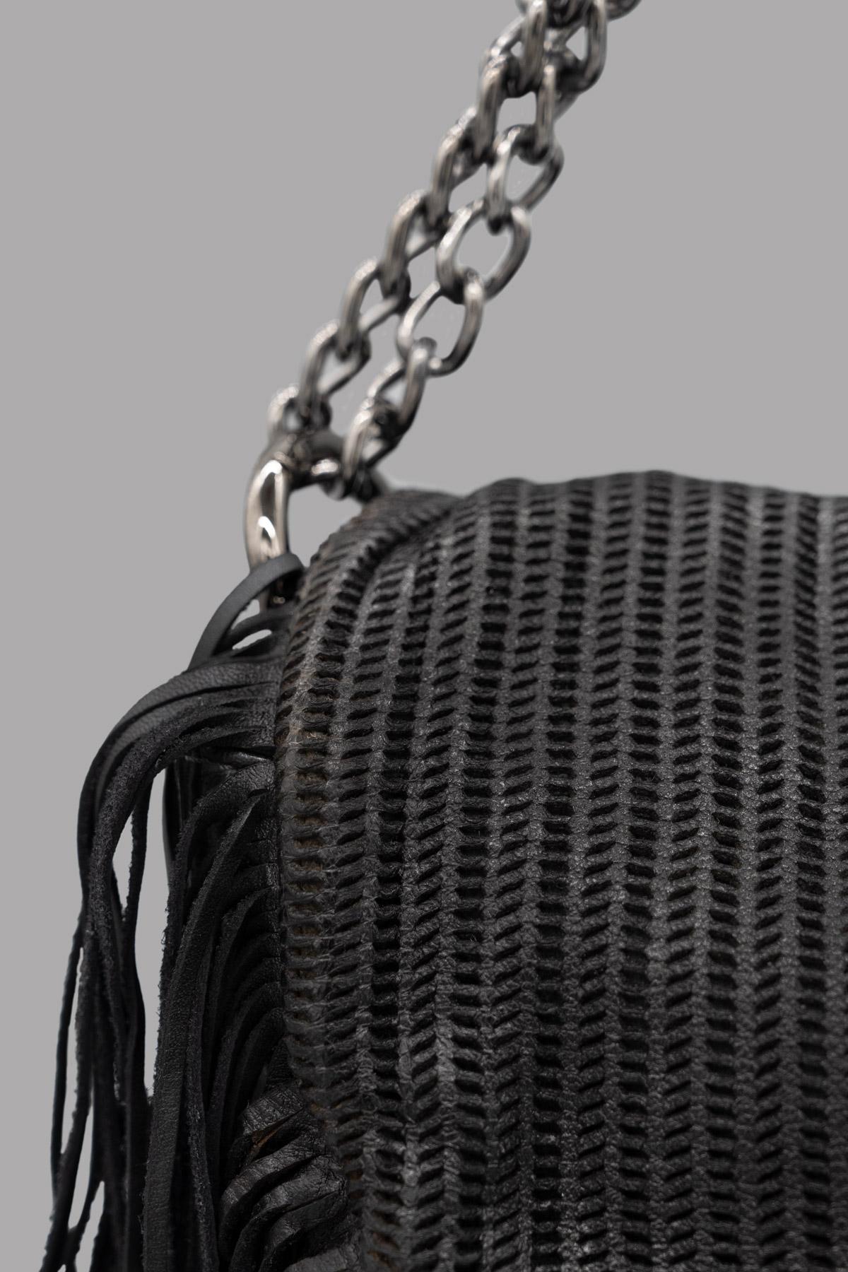 Lasered leather shoulder bag with fringes. Three internal compartments with button closure. Removable chain handle. Equipped with adjustable shoulder strap.