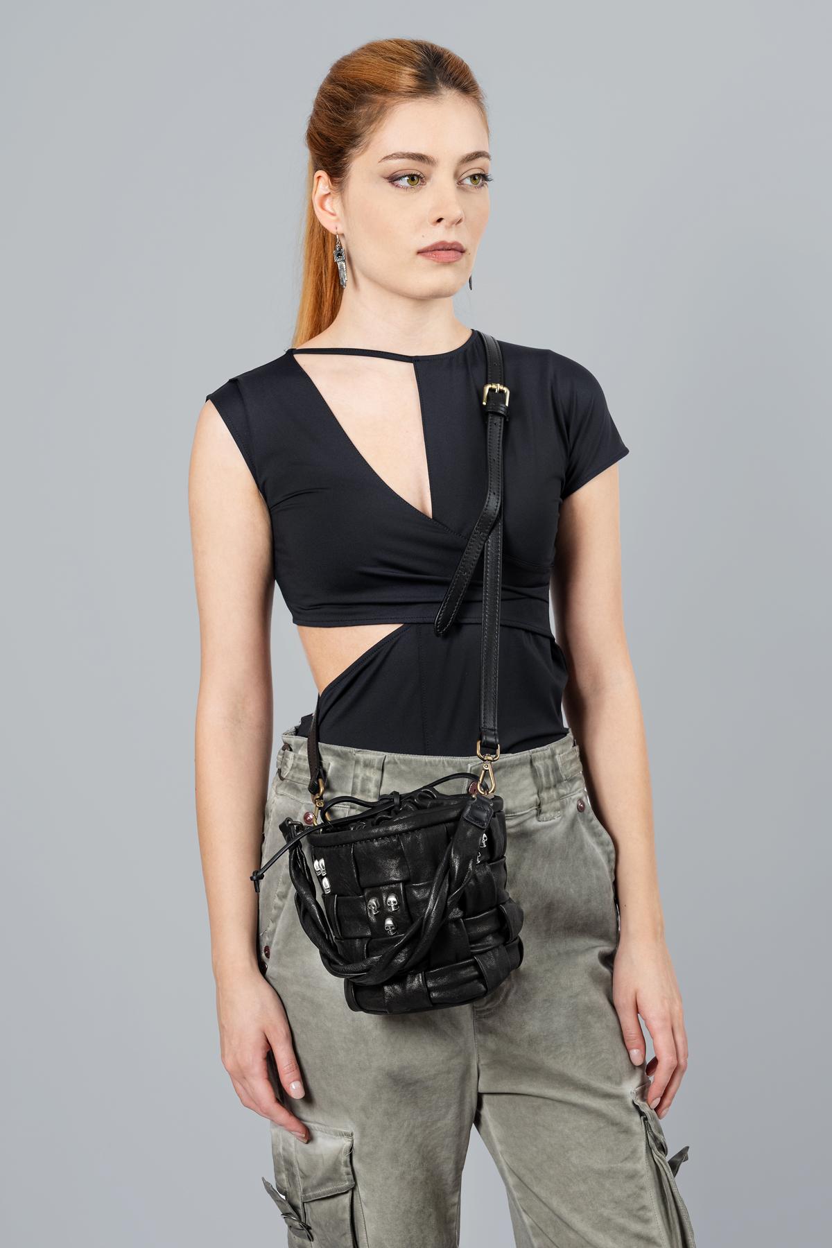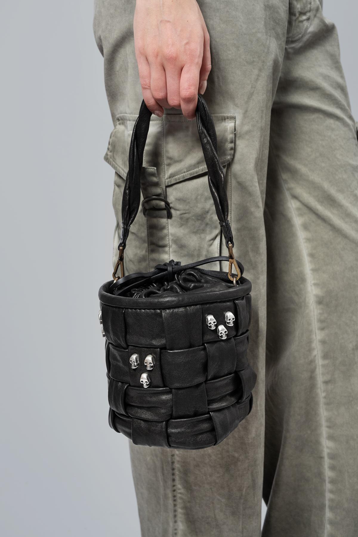 Hand-woven leather bucket bag embellished with skull-shaped studs. It features a braided handle, leather lace fastening and removable shoulder strap for maximum versatili ...