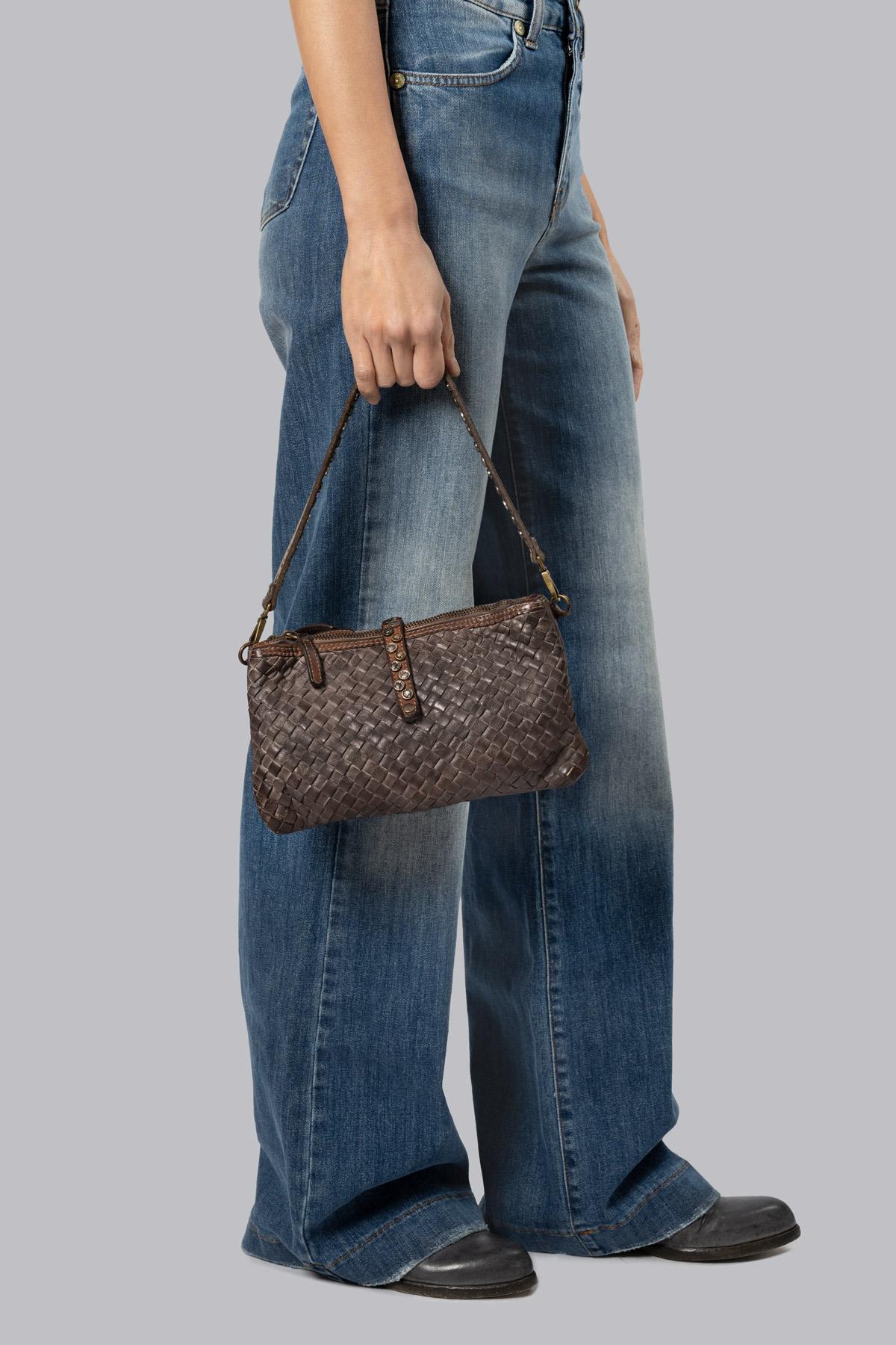Hand-woven leather shoulder bag. Three compartments with zip, strap and studded handle. Adjustable shoulder strap.100% Genuine LeatherMeasurements: Length: 10.2inch ...