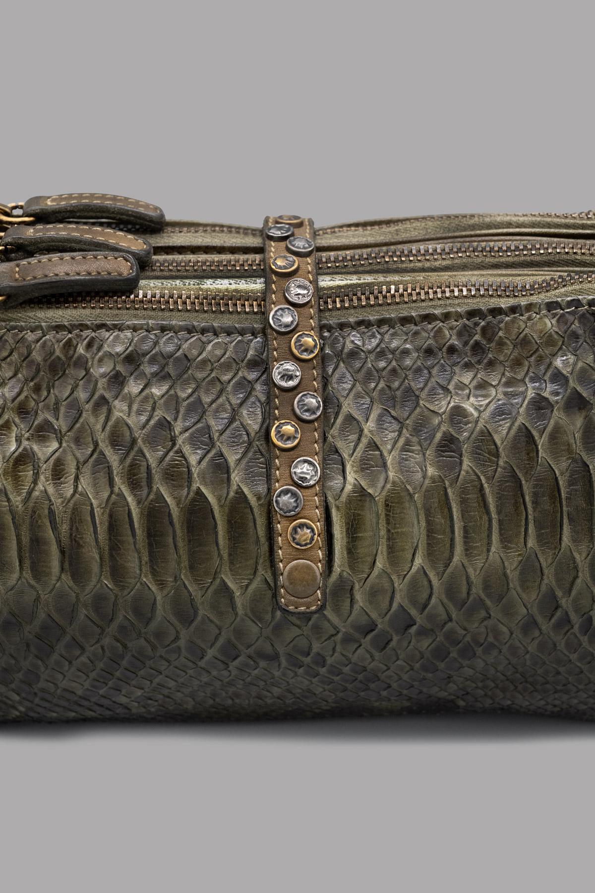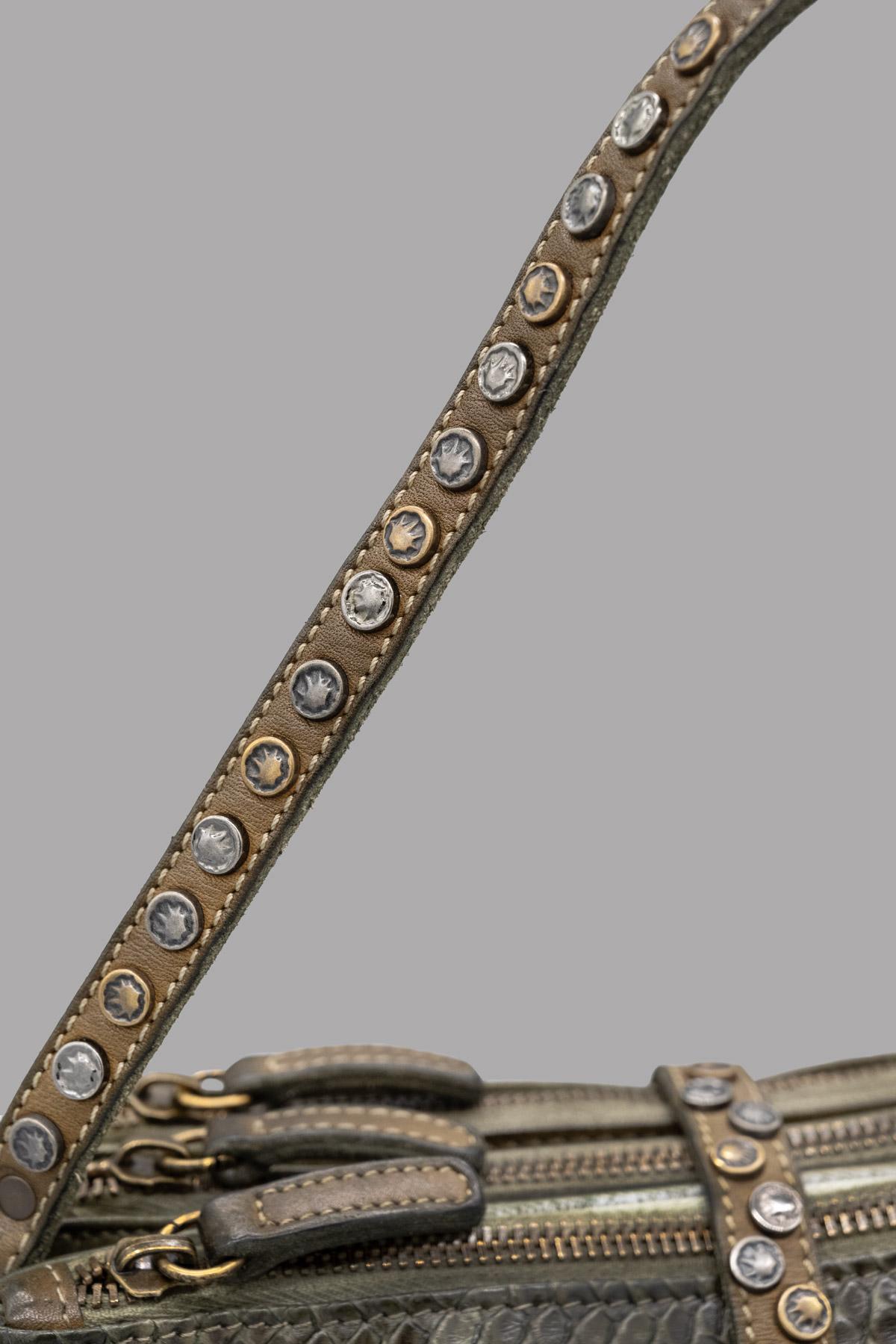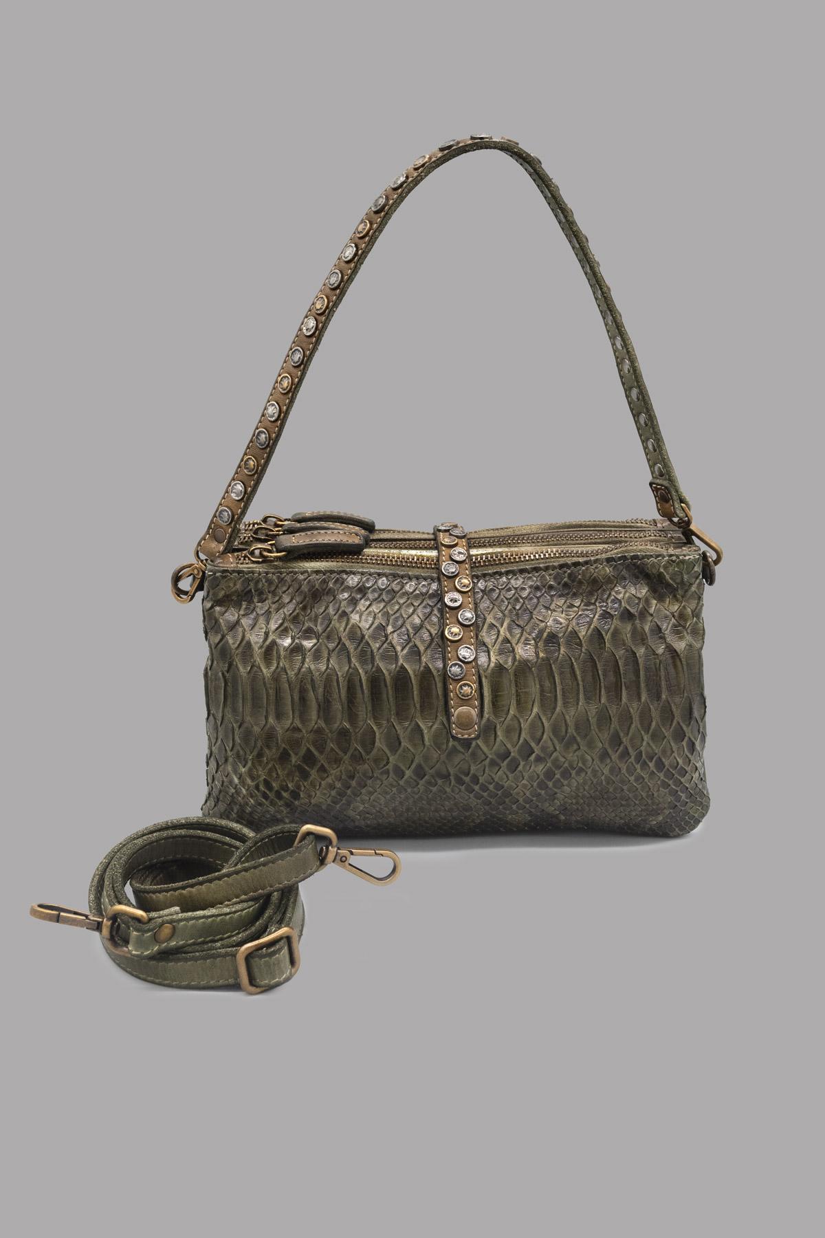 Python leather shoulder bag. Three compartments with zip. Studded strap and handle. Adjustable shoulder strap.