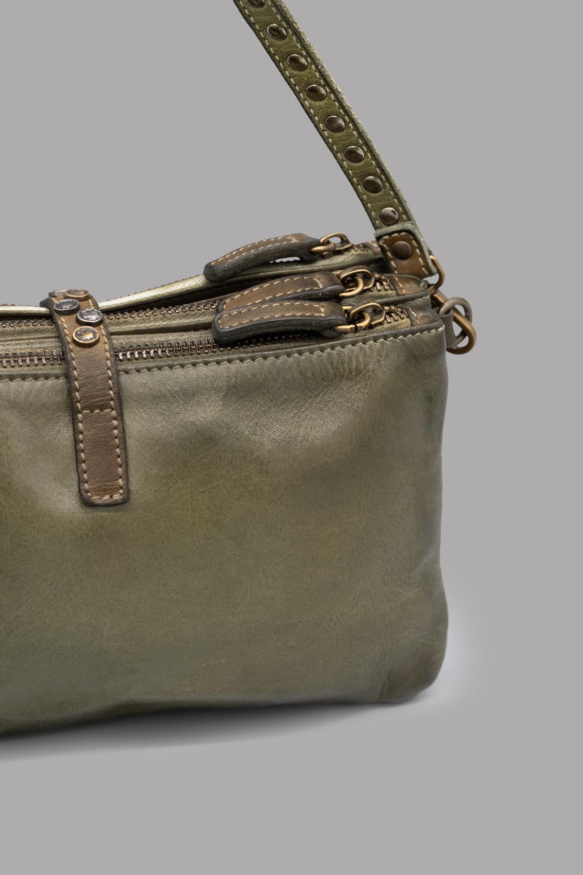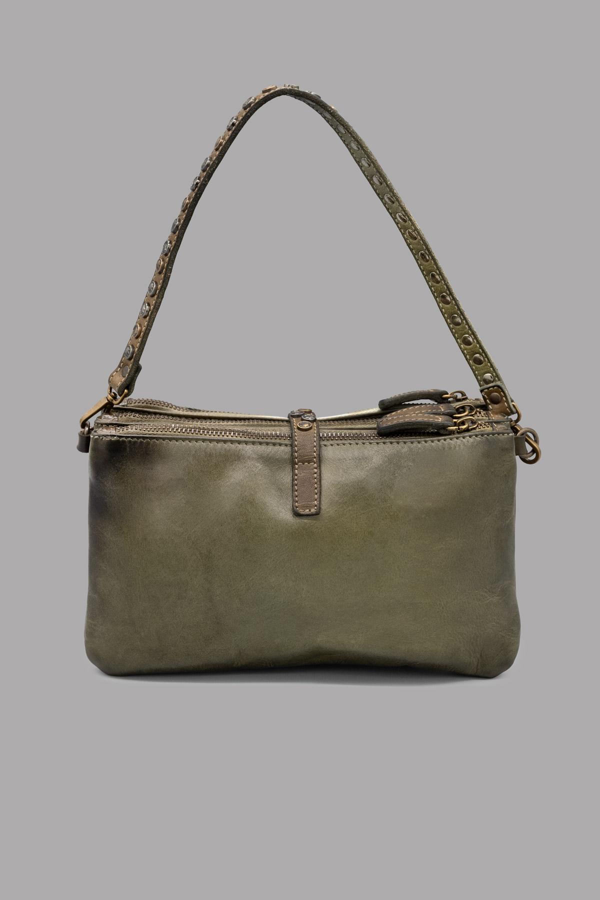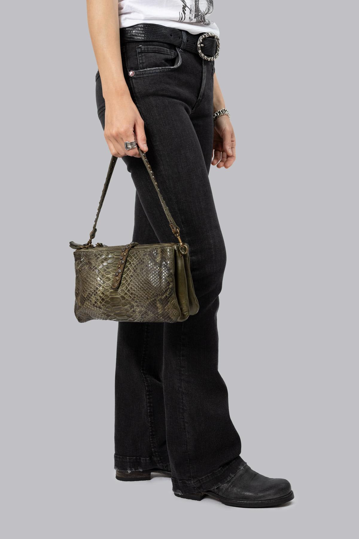 Python leather shoulder bag. Three compartments with zip. Studded strap and handle. Adjustable shoulder strap.