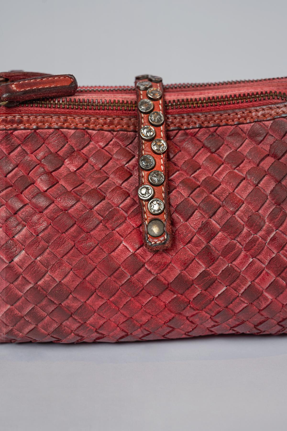 Hand-woven leather shoulder bag. Three compartments with zip, strap and studded handle. Adjustable shoulder strap.