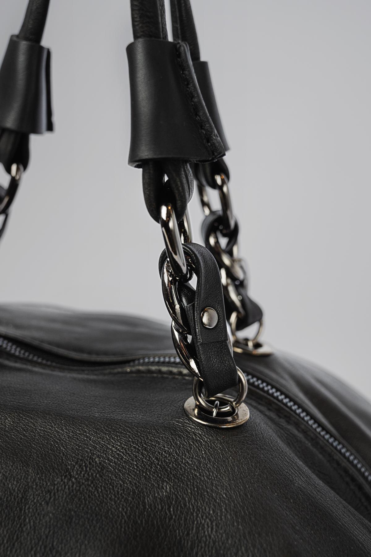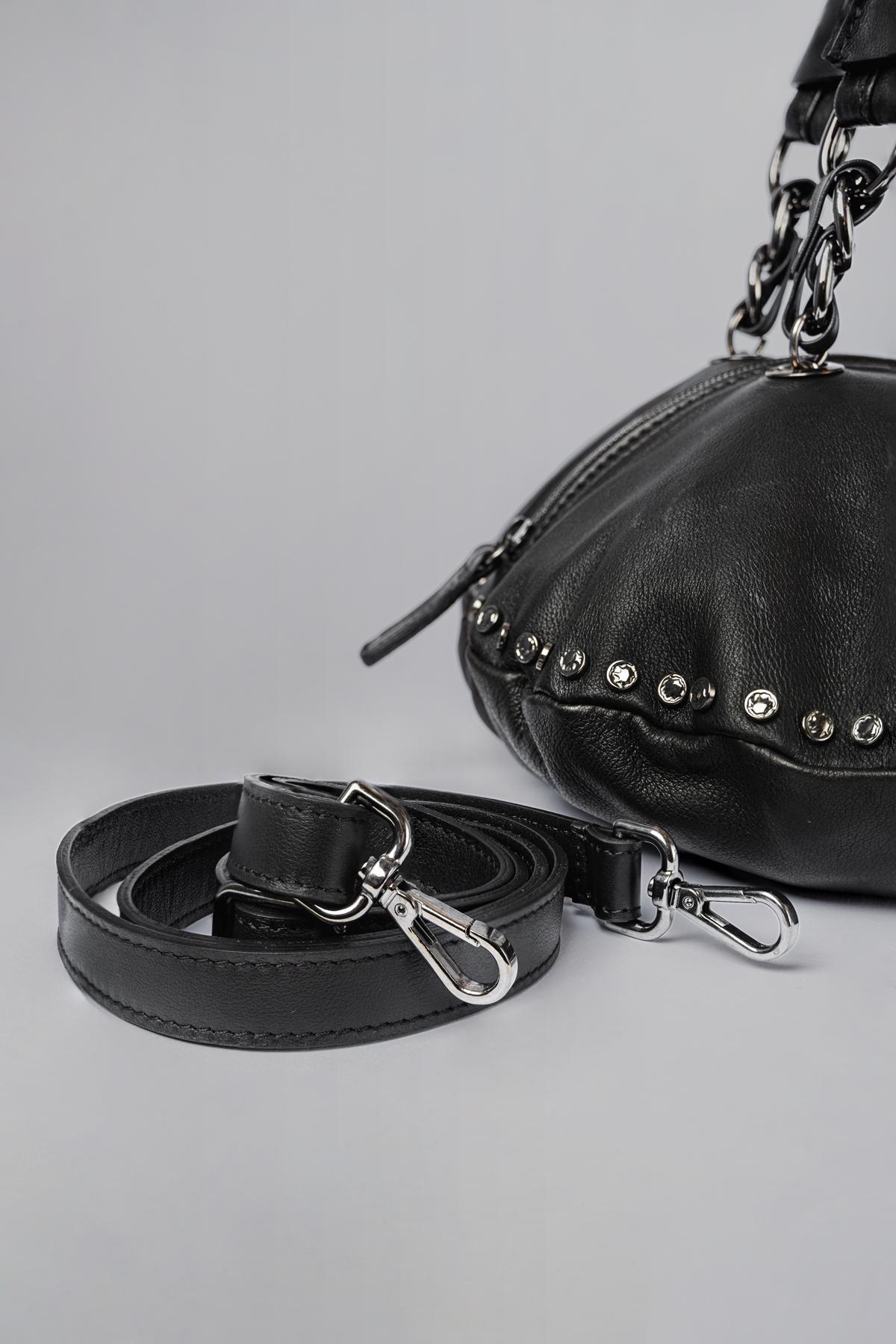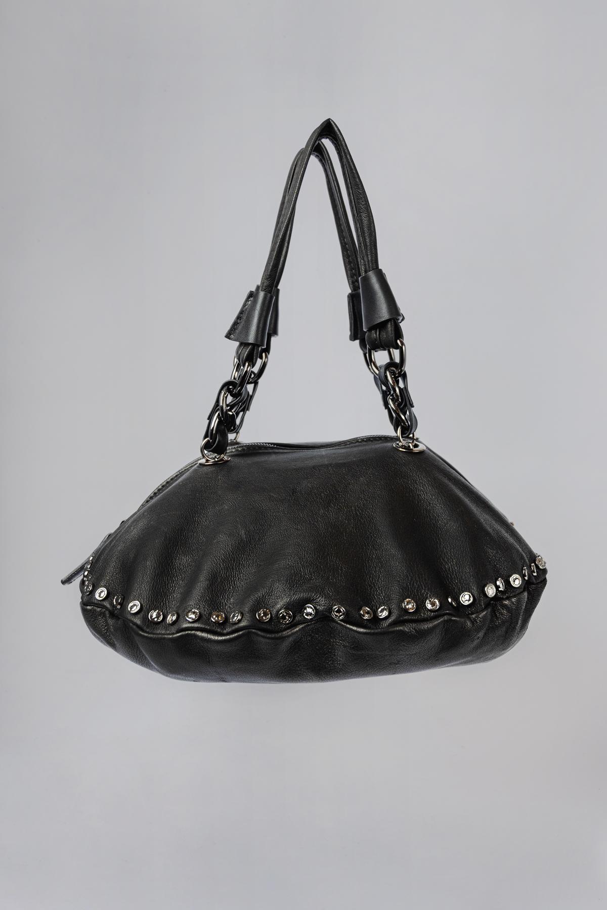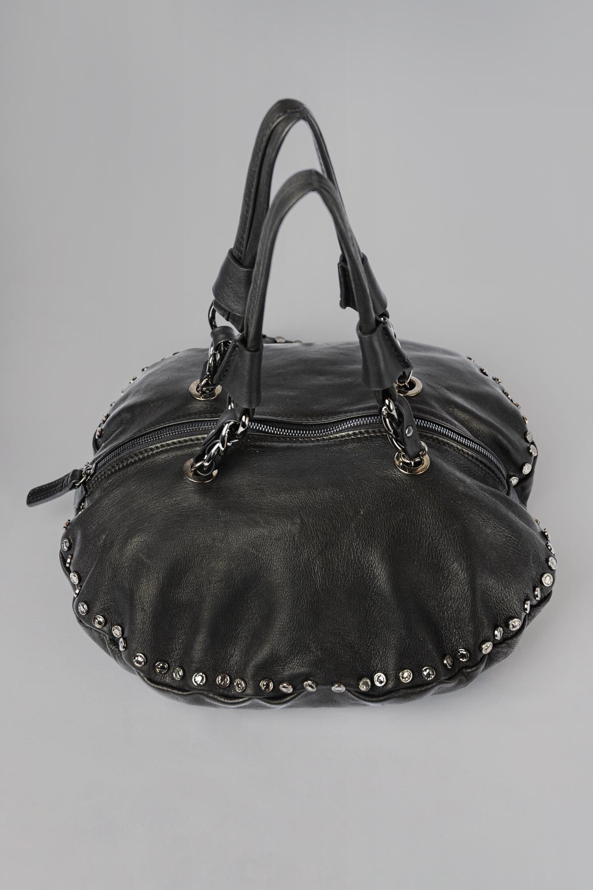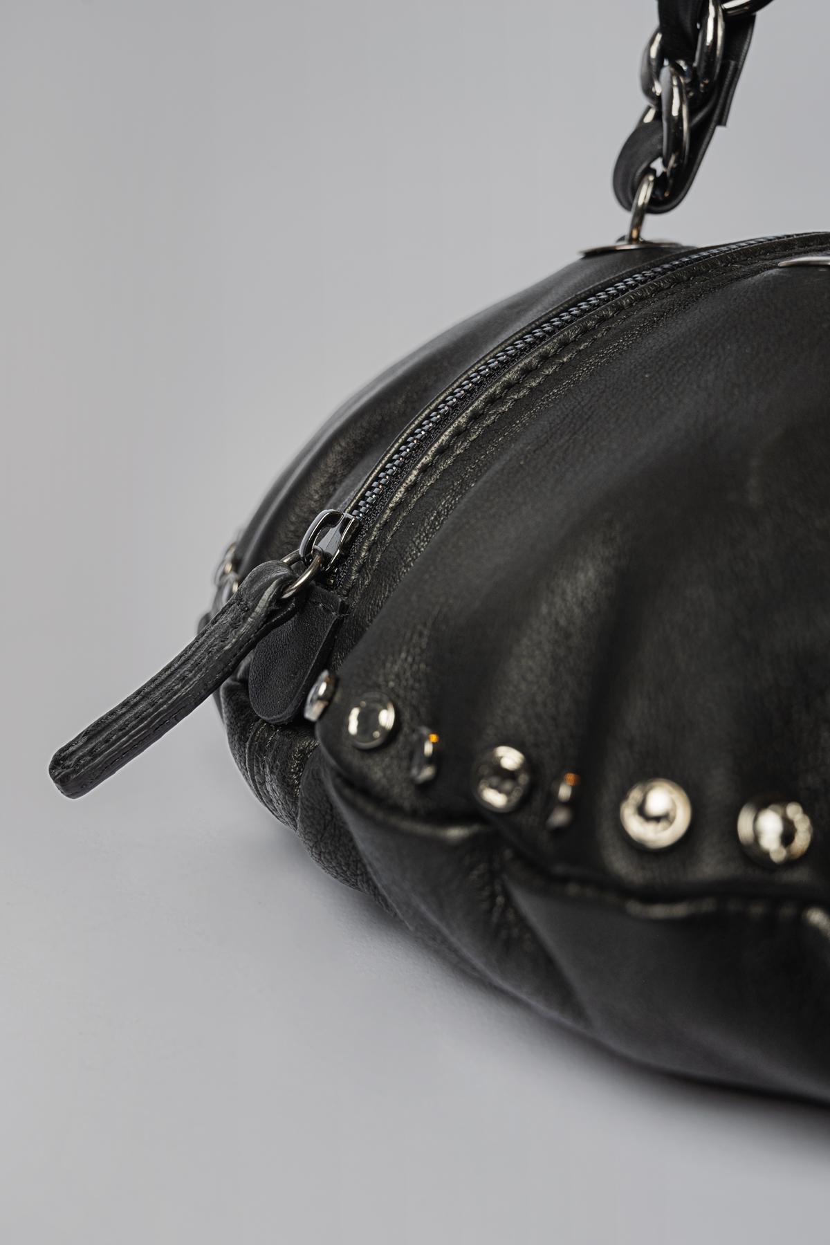 Leather bag with circular design, embellished with studs. Central zip fastening. Chain and leather handles. Removable and adjustable shoulder strap.This item, being a han ...