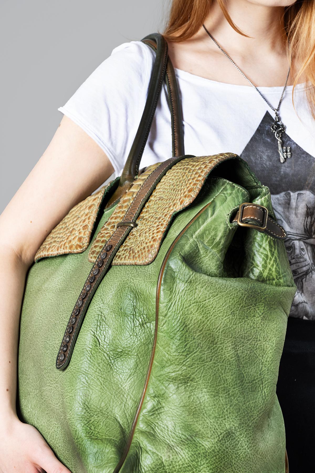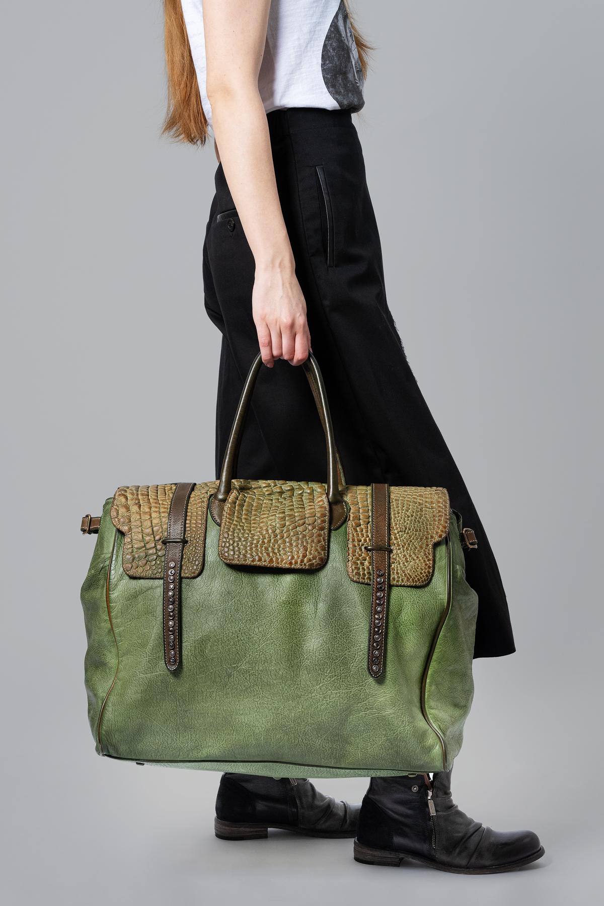 Leather travel bag. Buckle closure and studded ties. Removable leather shoulder strapThis item, being a handmade product, may have variations in the colors of the applied ...