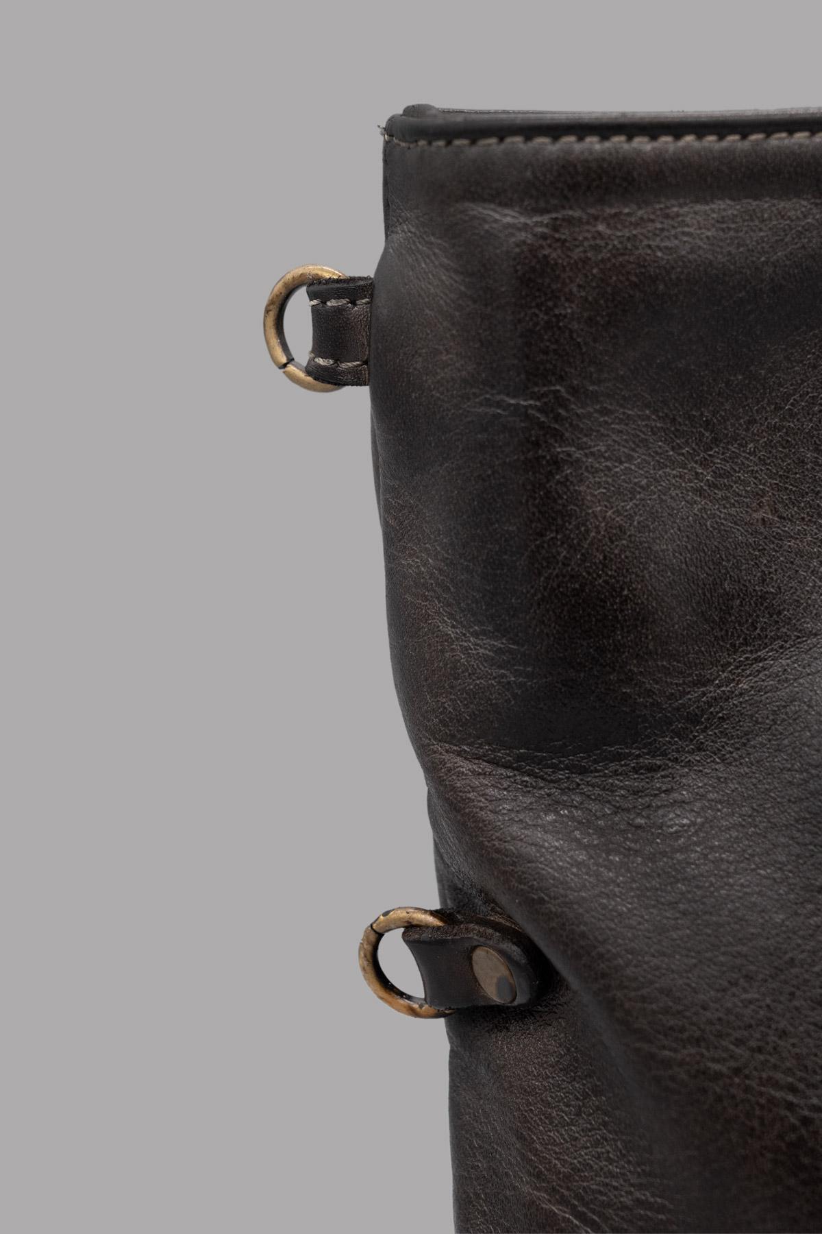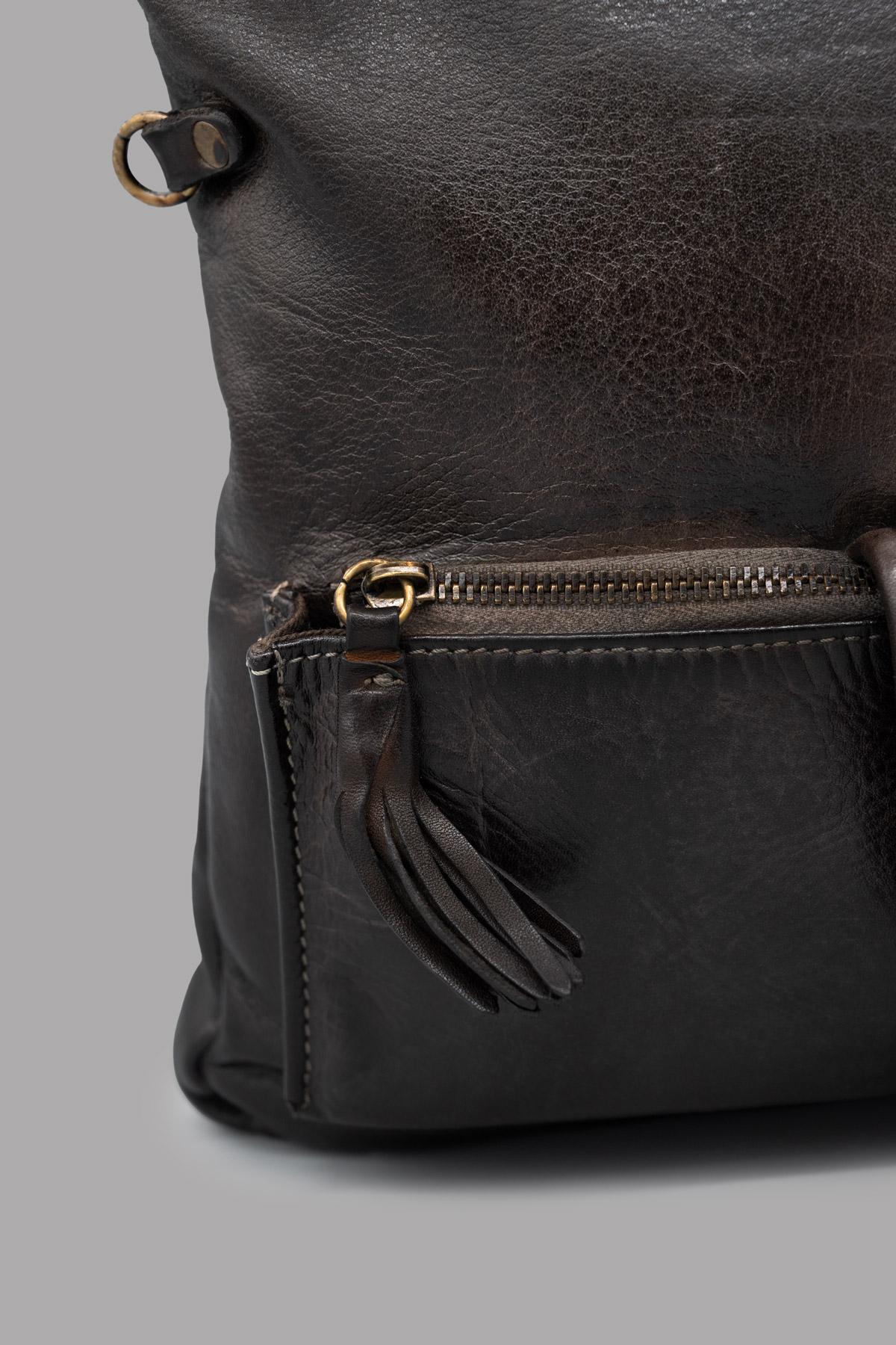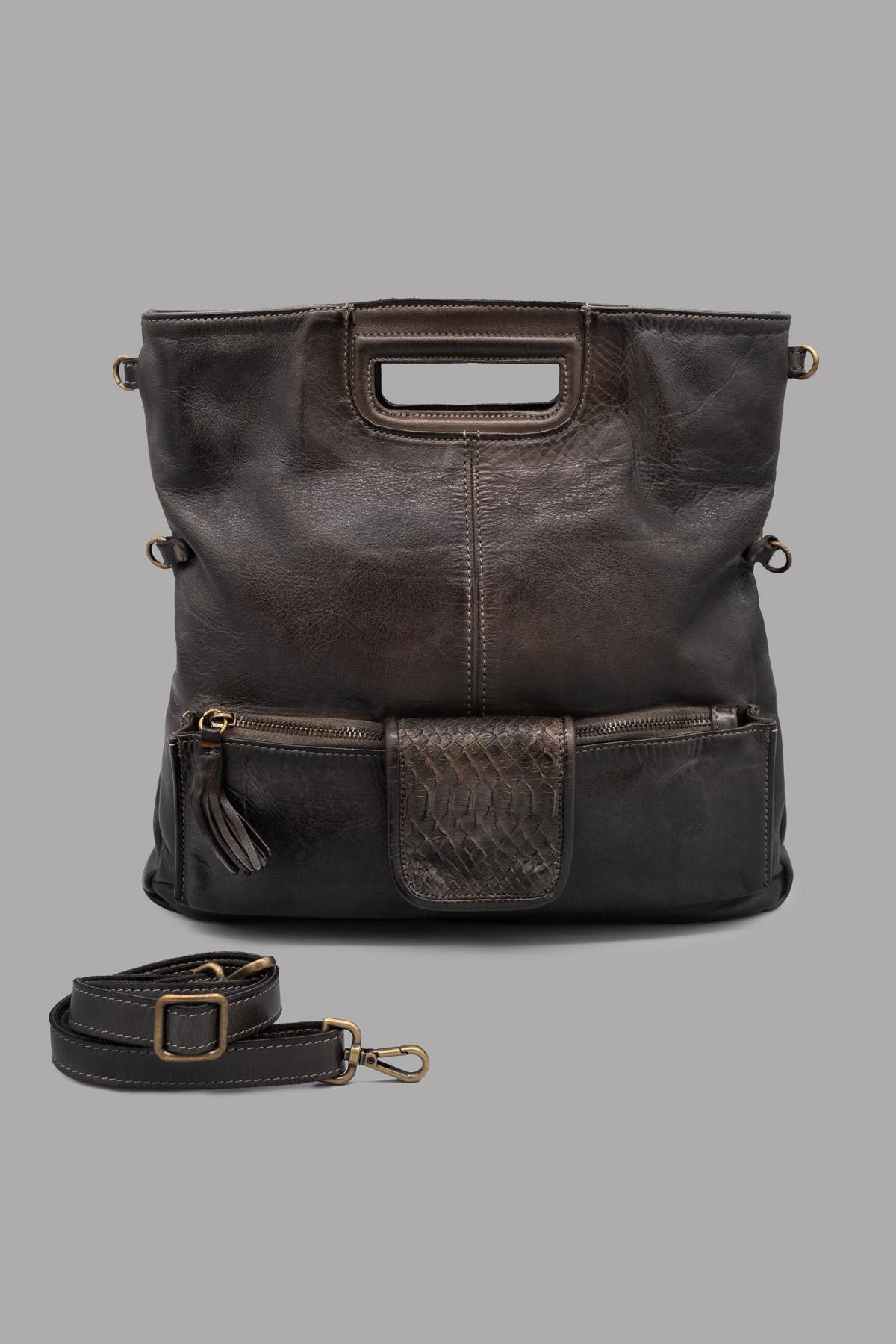 Hand-buffed genuine leather bag. Main zip closure. External pocket with zip closure and python leather flap with button. Practical and versatile, it can be carried by hand, as a cross-body bag, or as a clutch by folding the bag over itself. Adjustable and removable shoulder strap.