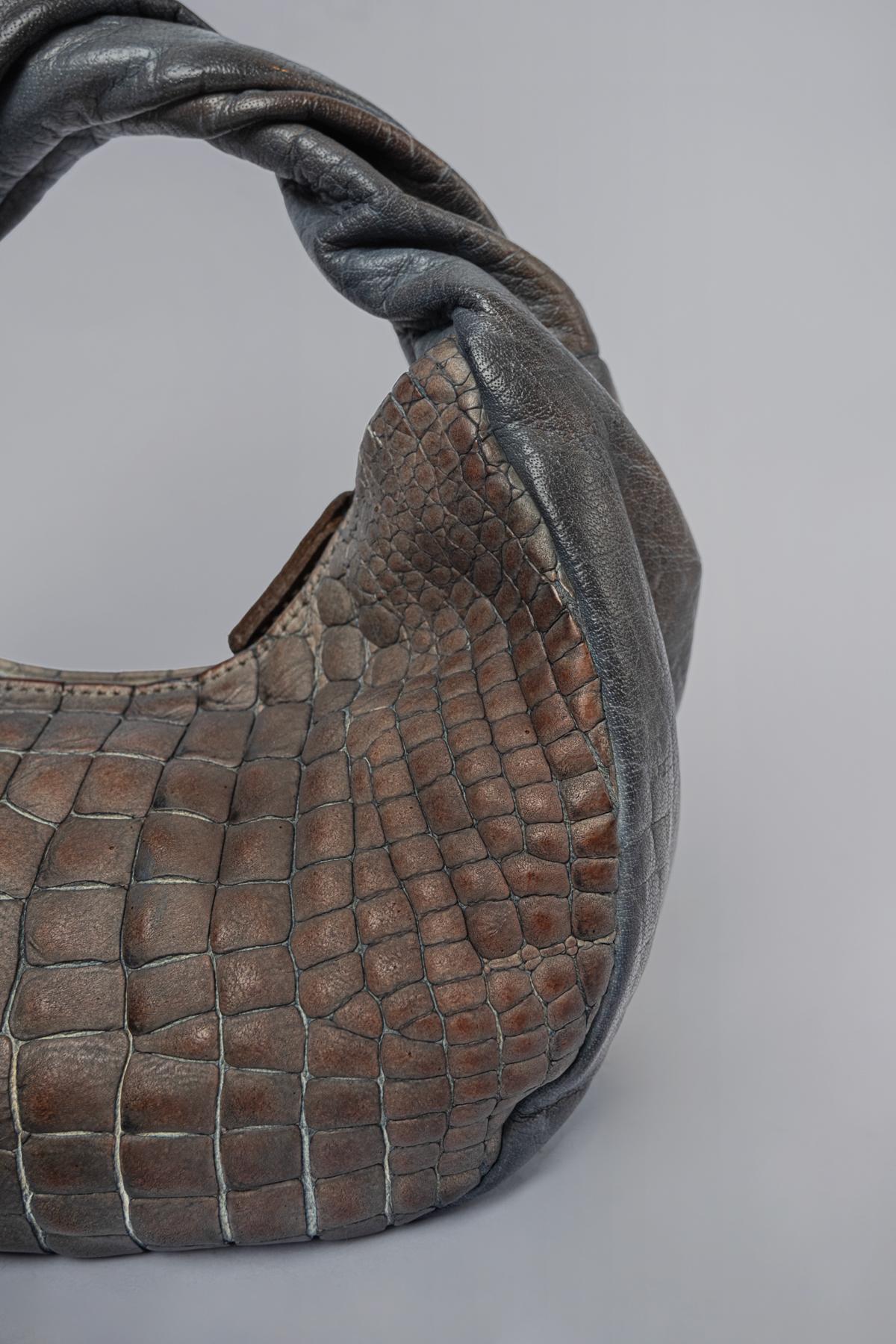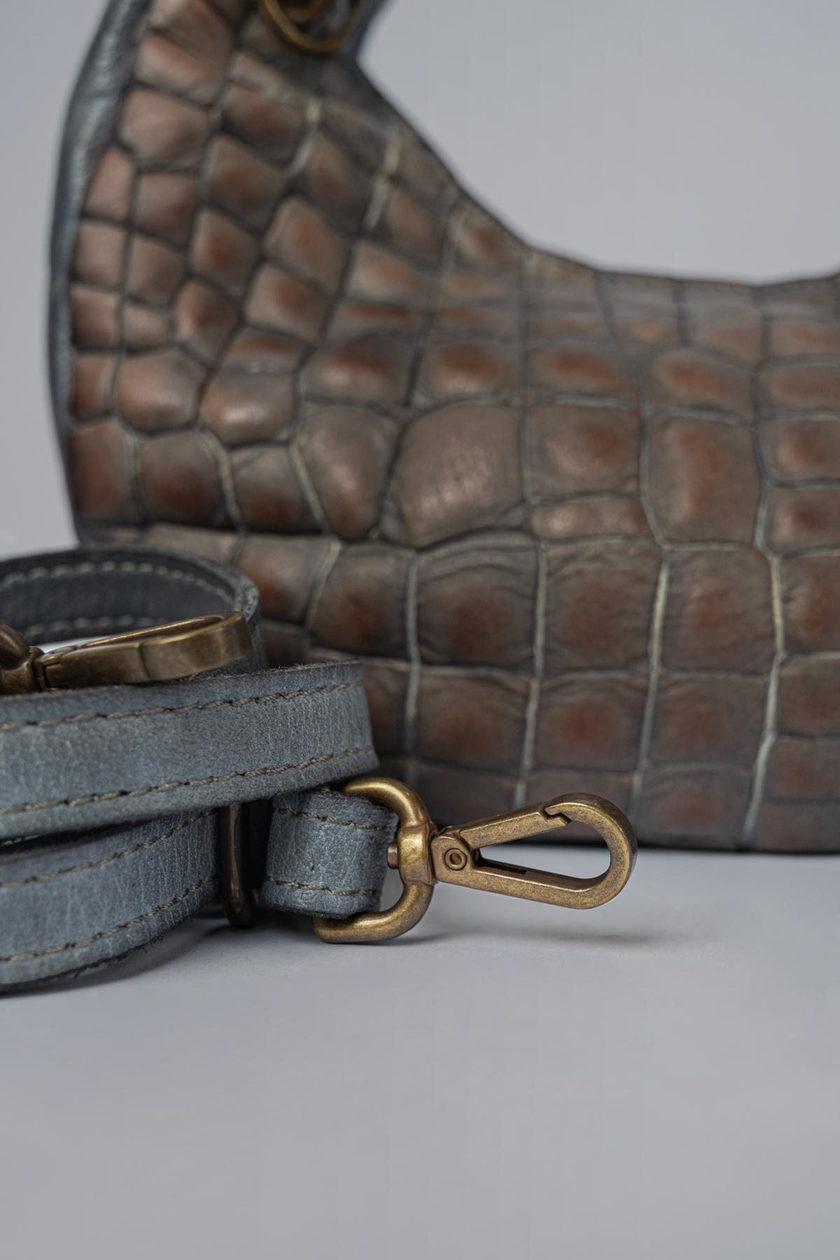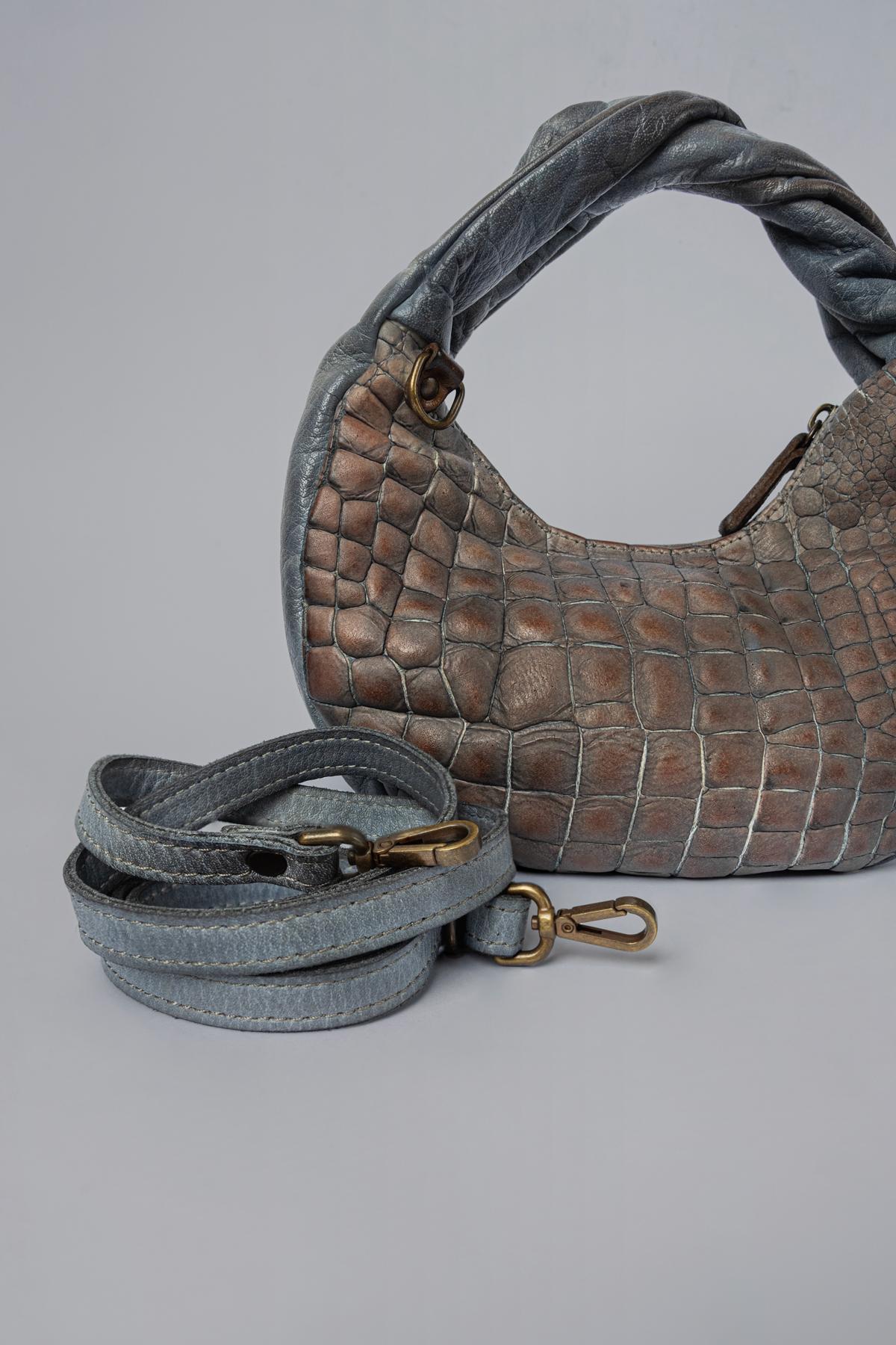 Soft leather shoulder bag with crocodile texture. Zip closure. Removable shoulder strap.