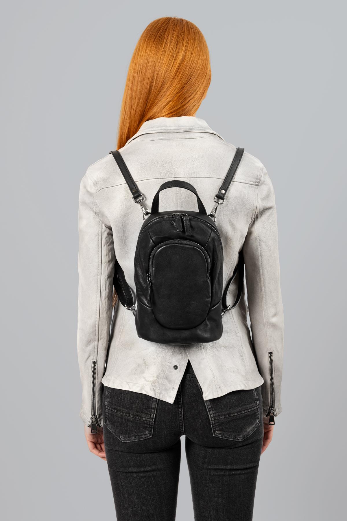 Genuine leather backpack with a double compartment and practical zip fastening. Adjustable and removable straps.