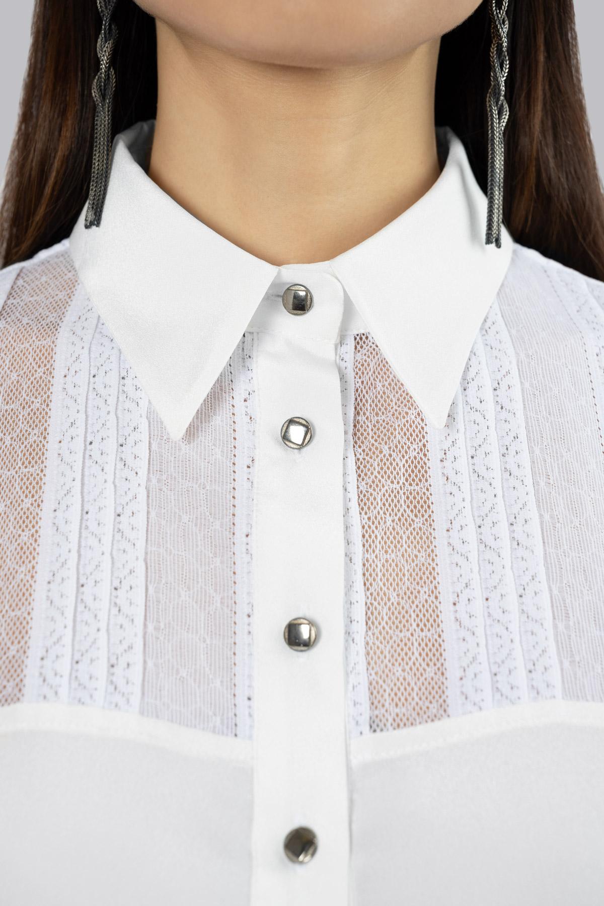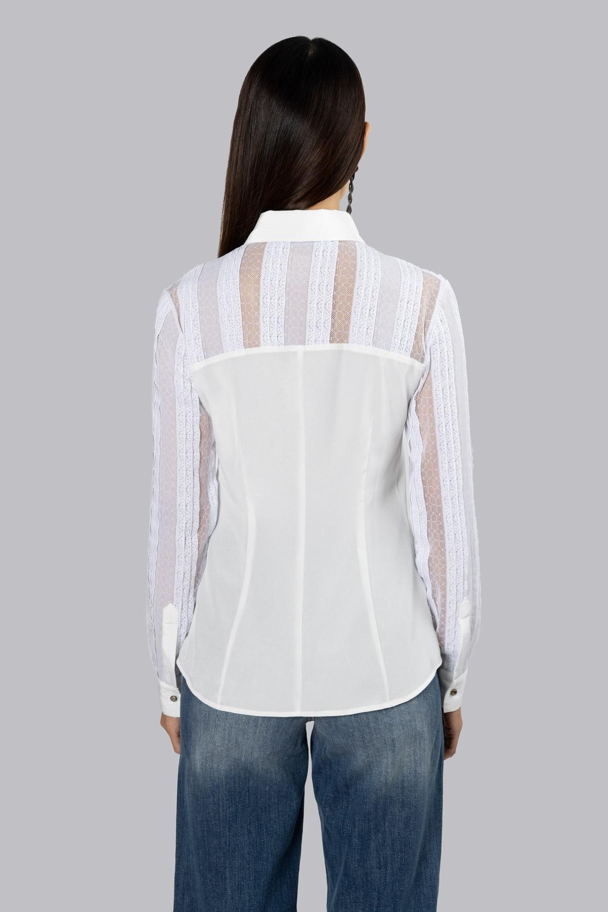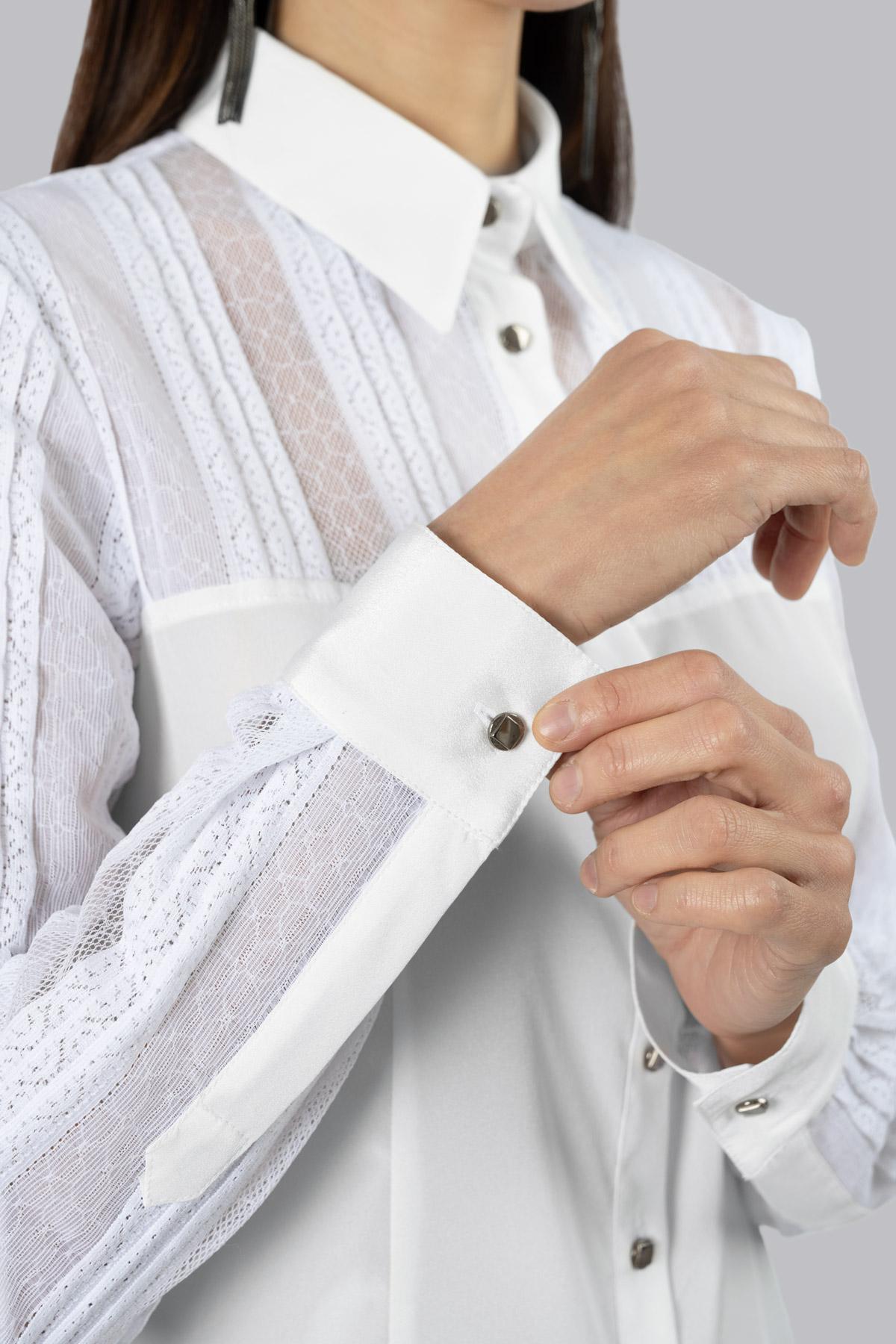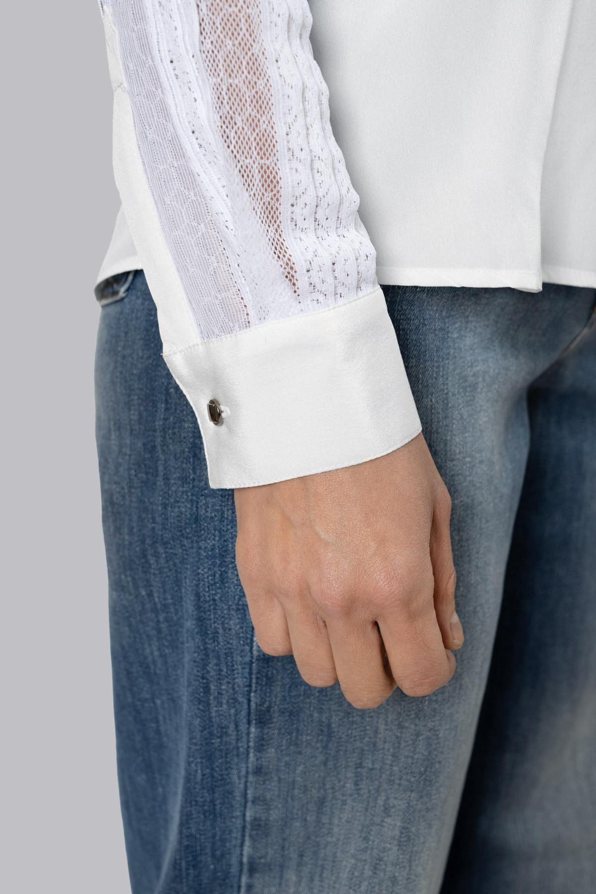 Silk shirt. Embellished with lace details on the neckline and sleeves. Central fastening with metal buttons. Single metal button fastening on the cuff.