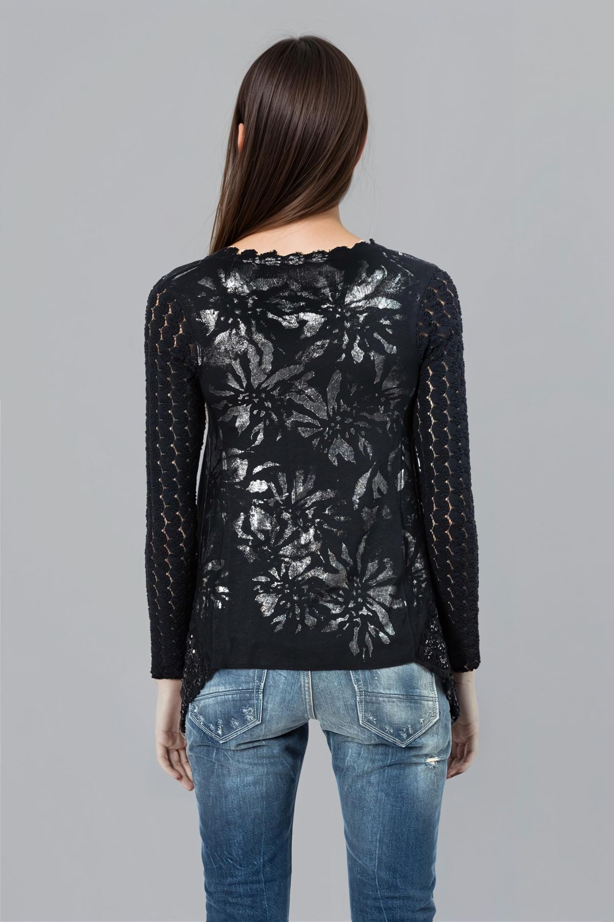 Long-sleeved sweater with flared bottom. Floral pattern with metallic effect. Sleeves with lace.50% Viscose, 50% Polyamide ...