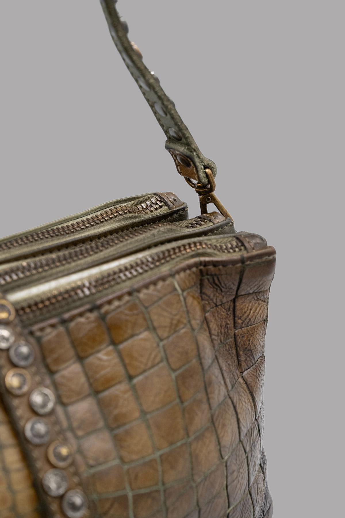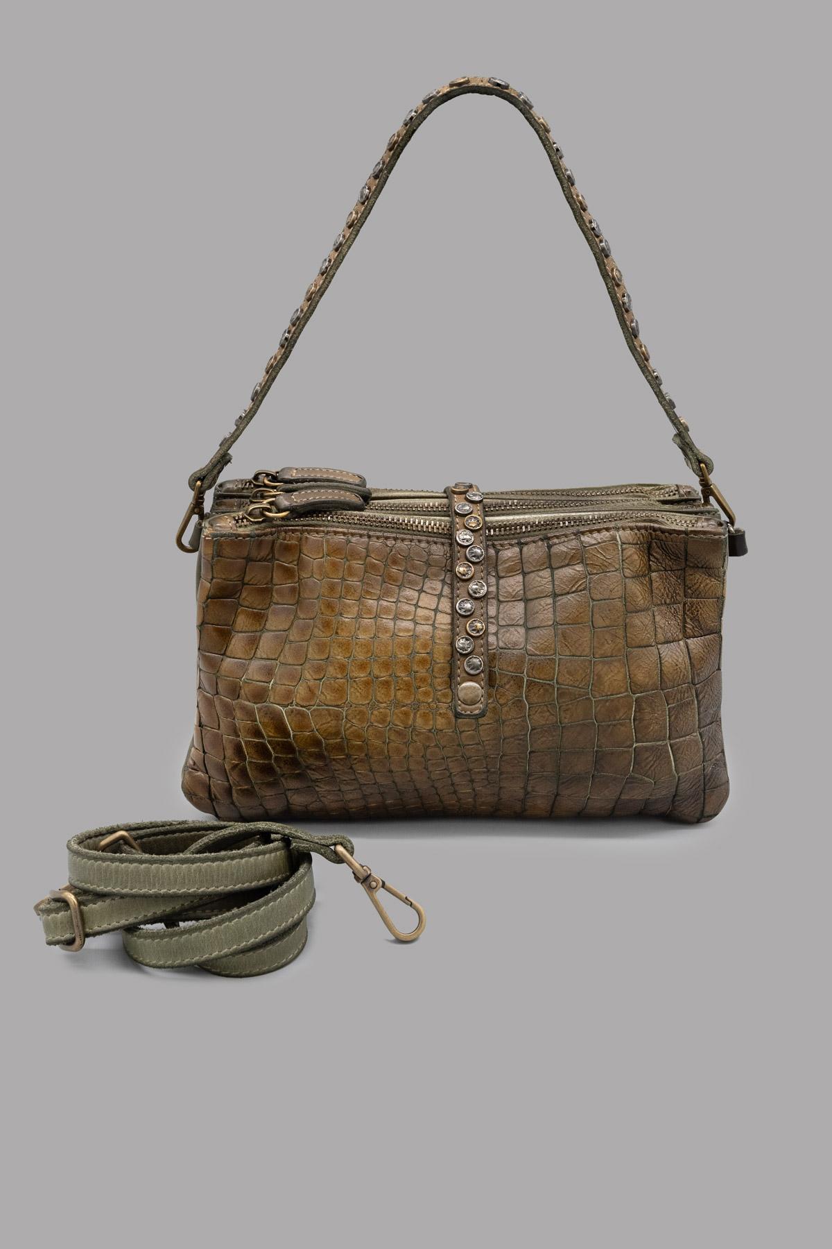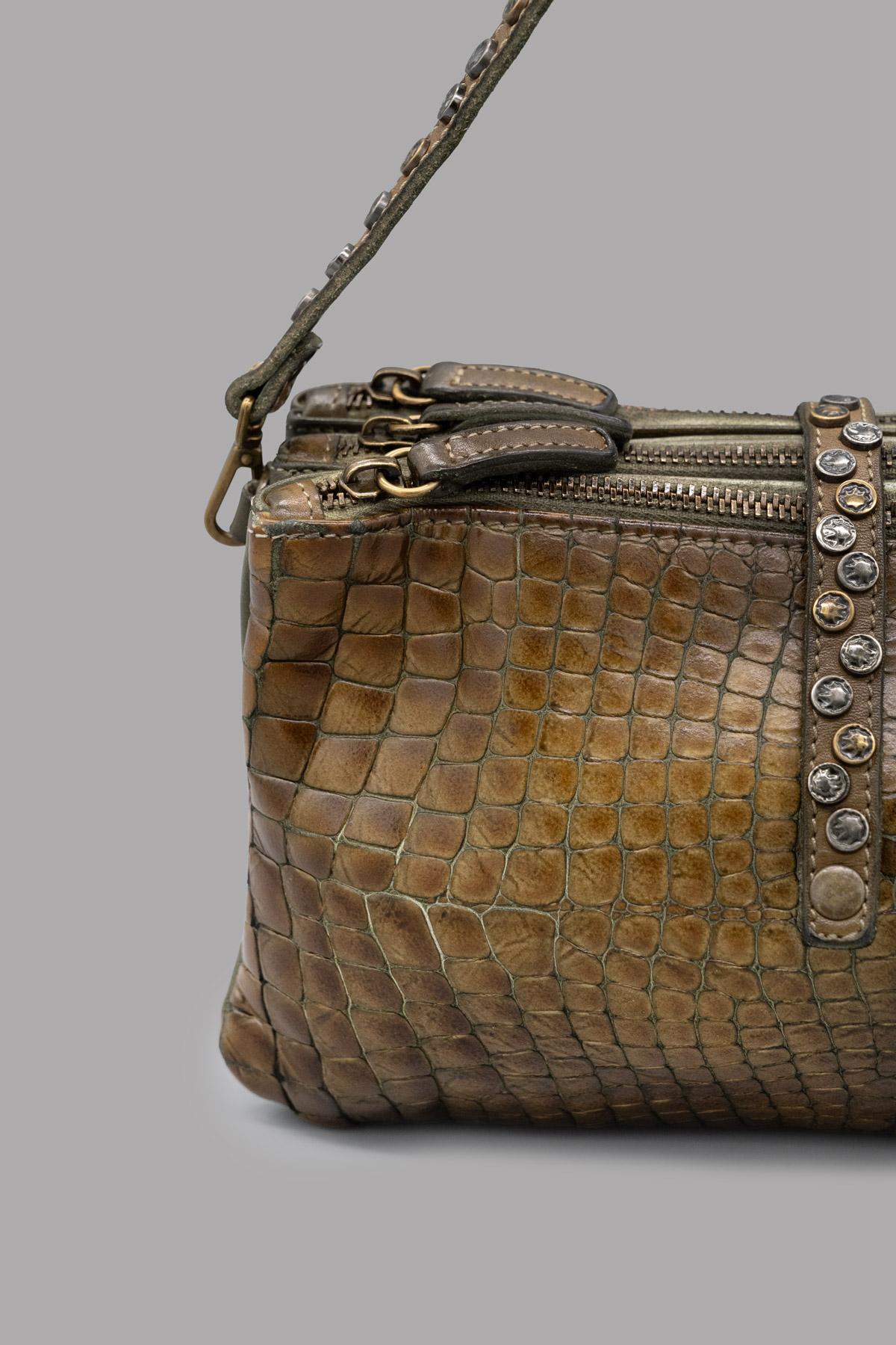 Hand-padded crocodile print leather shoulder bag. Three compartments with zip, strap and studded handle. Adjustable shoulder strap.This item, being a handmade product, ma ...