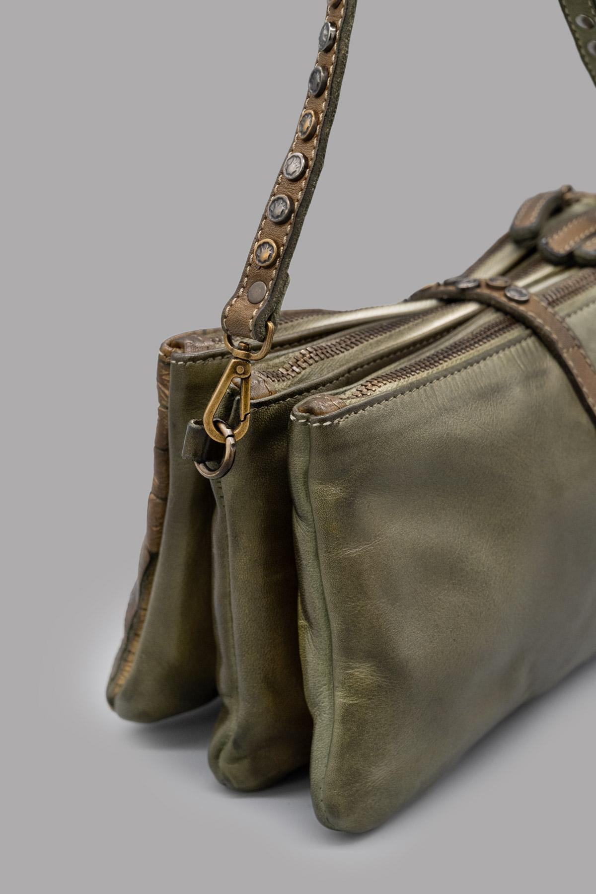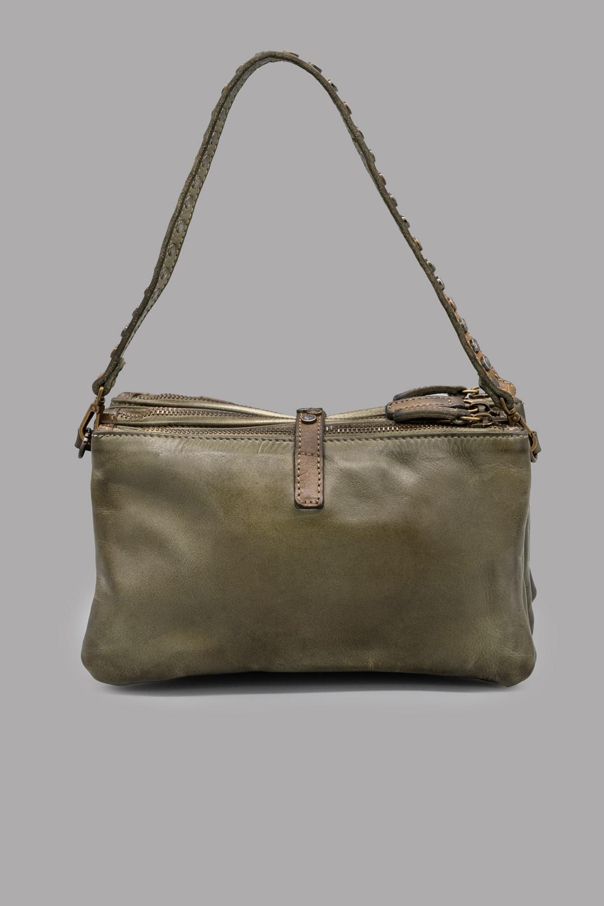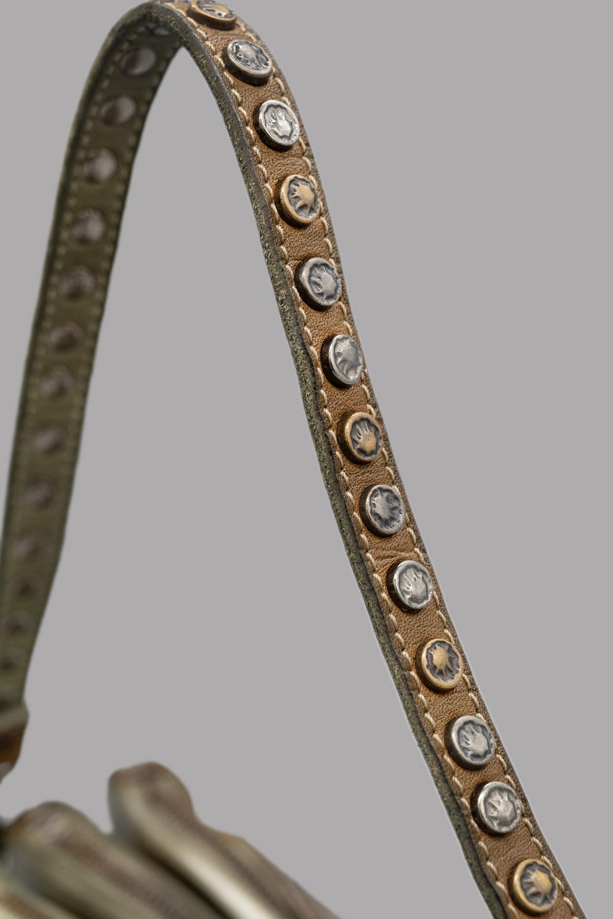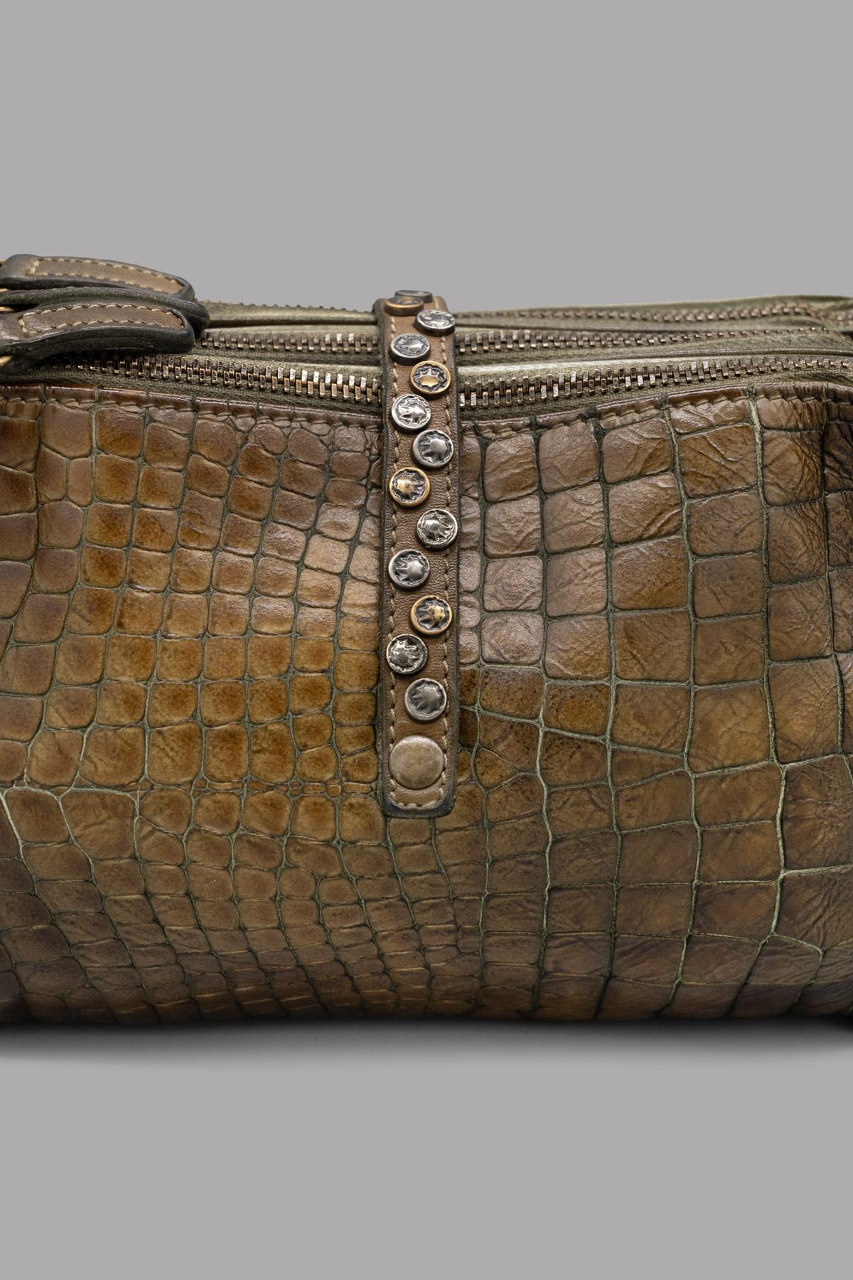 Hand-padded crocodile print leather shoulder bag. Three compartments with zip, strap and studded handle. Adjustable shoulder strap.This item, being a handmade product, ma ...