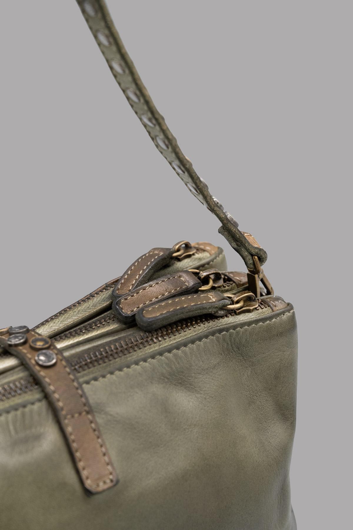 Hand-padded crocodile print leather shoulder bag. Three compartments with zip, strap and studded handle. Adjustable shoulder strap.