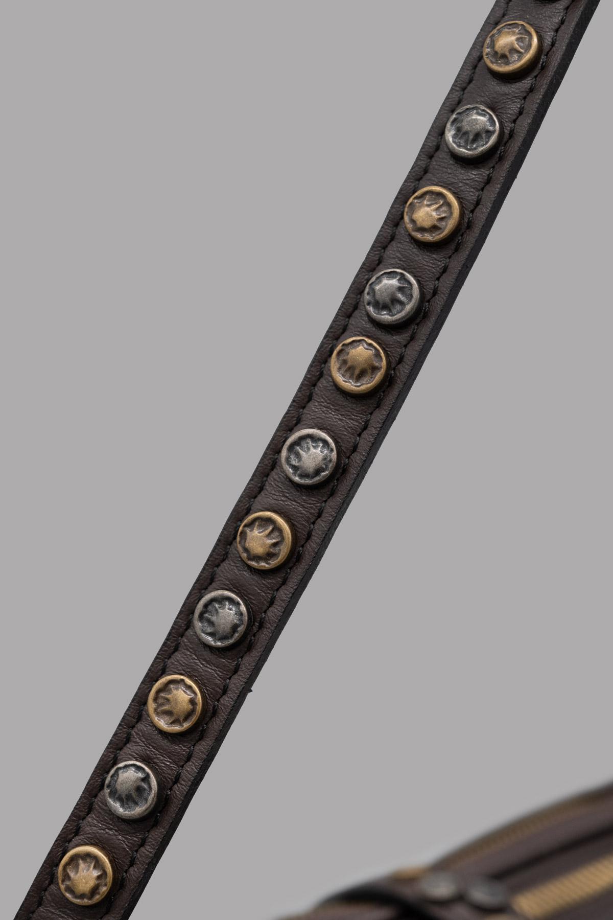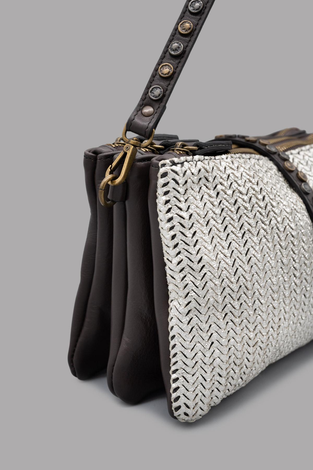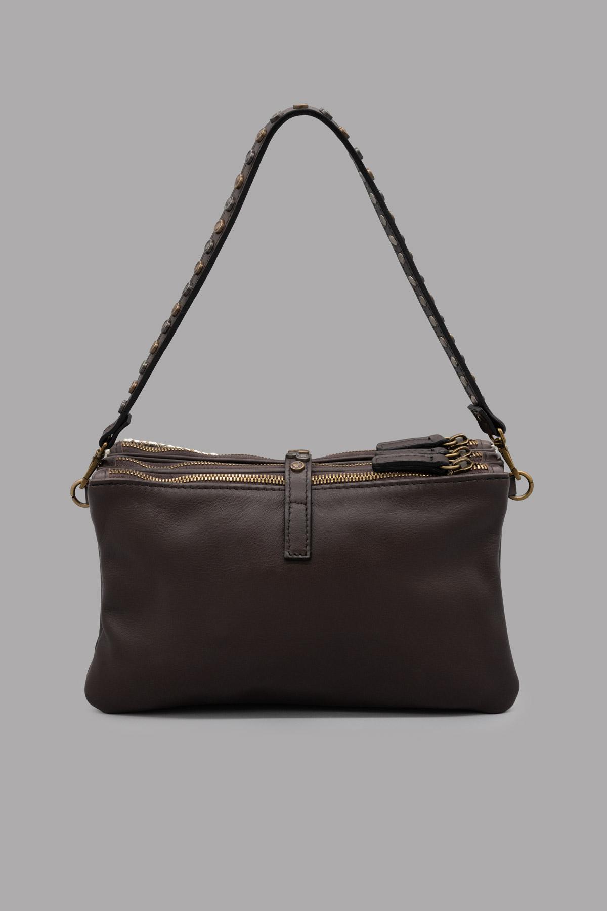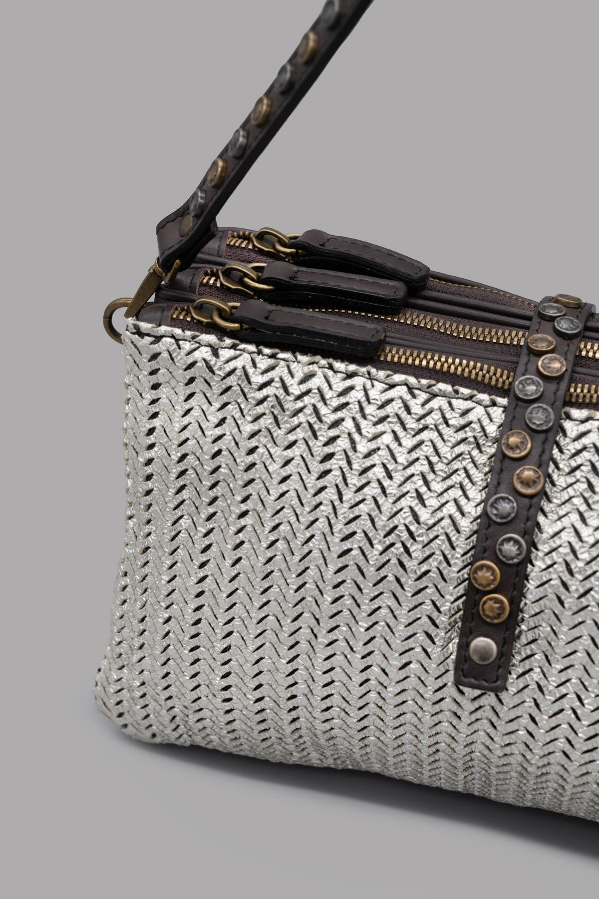 Laser-cut leather shoulder bag, painted gold. Three compartments with zip closure. Strap and handle with studs. Adjustable shoulder strap.