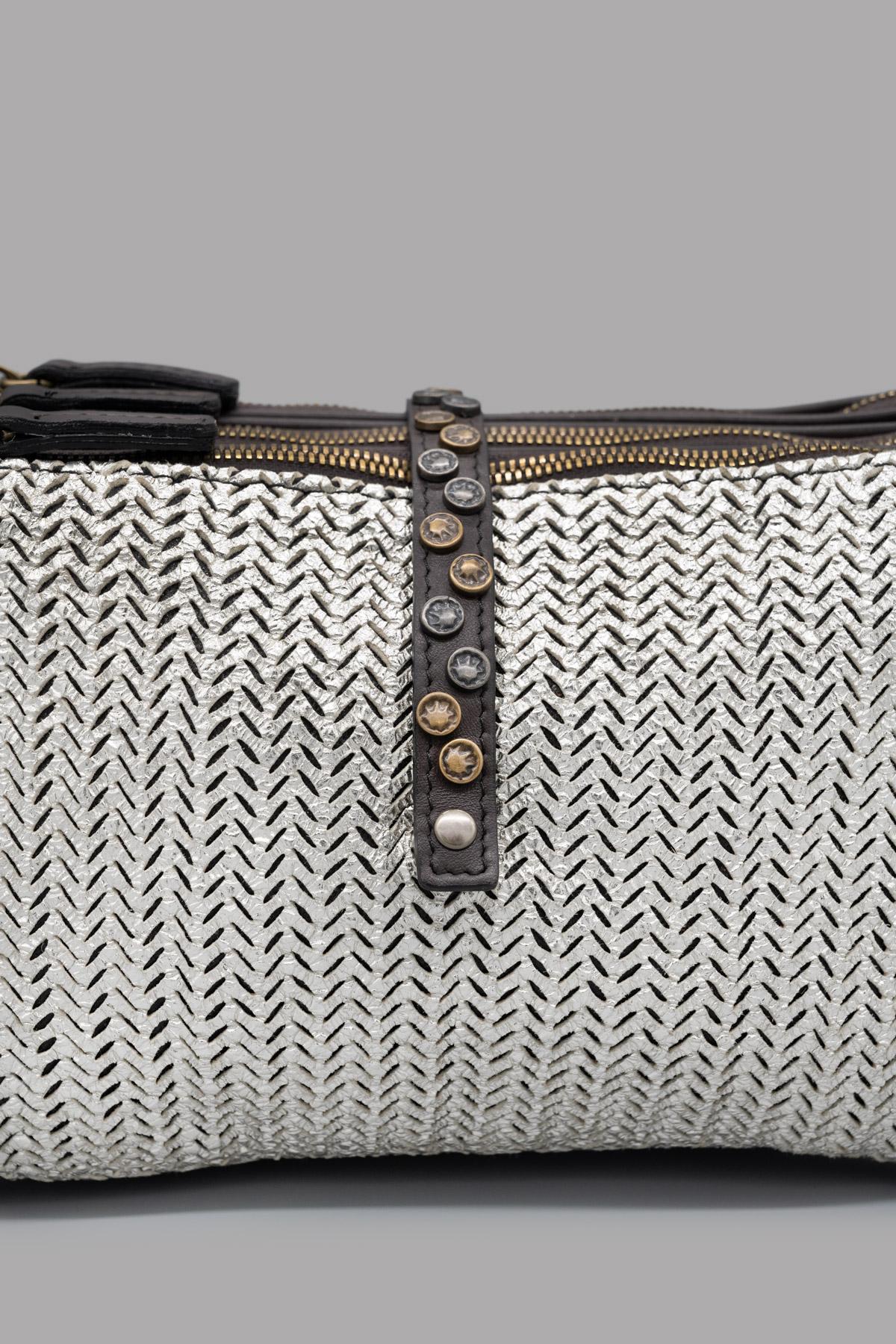 Laser-cut leather shoulder bag, painted gold. Three compartments with zip closure. Strap and handle with studs. Adjustable shoulder strap.Calf LeatherMeasures:Width: 9,8i ...