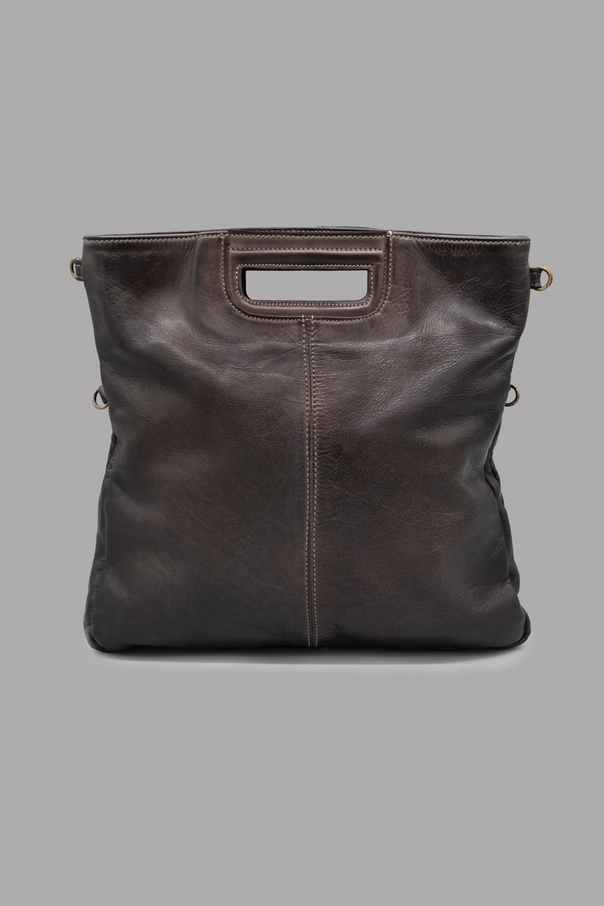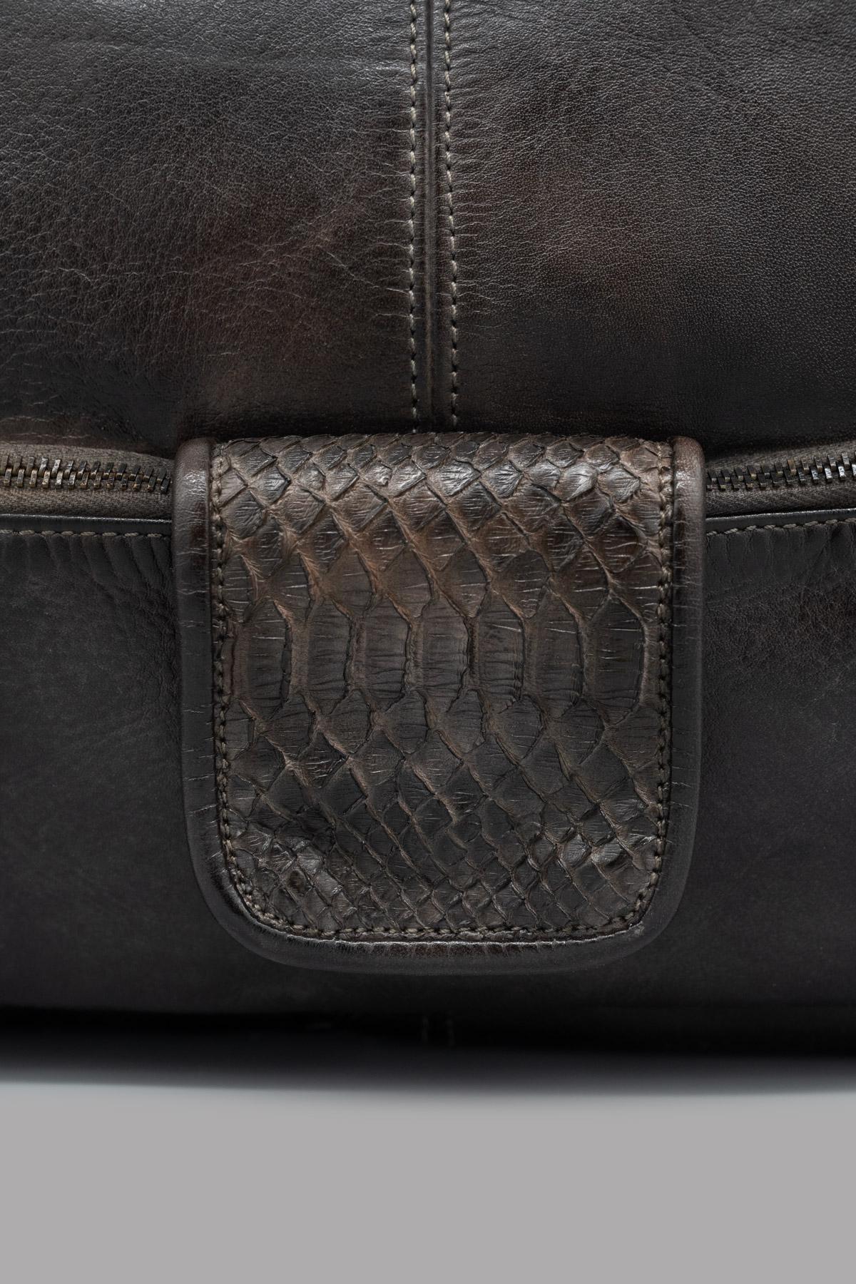 Hand-buffed genuine leather bag. Main zip closure. External pocket with zip closure and python leather flap with button. Practical and versatile, it can be carried by hand, as a cross-body bag, or as a clutch by folding the bag over itself. Adjustable and removable shoulder strap.