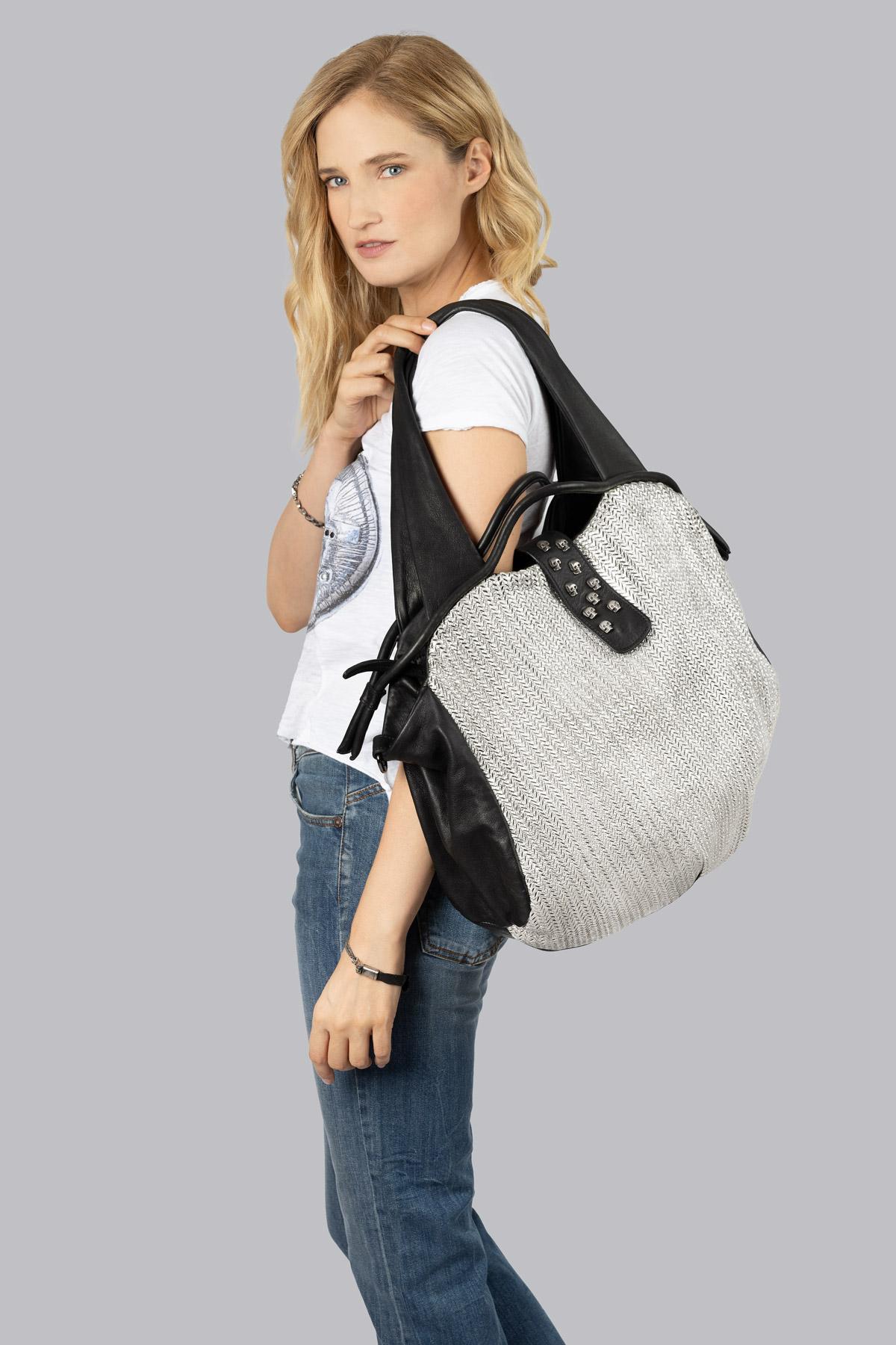 Leather bag with double handles. Laser-cut leather insert, platinum-coloured paint finish. Zip closure and band with embedded skulls.