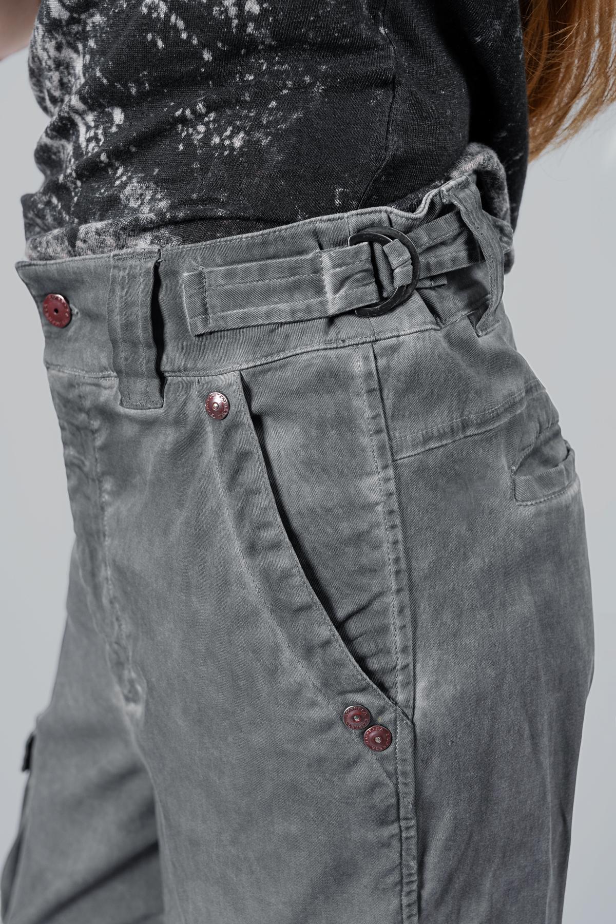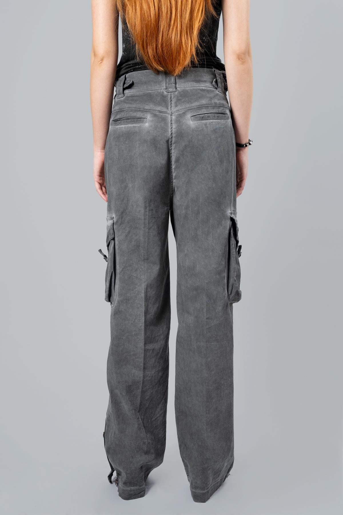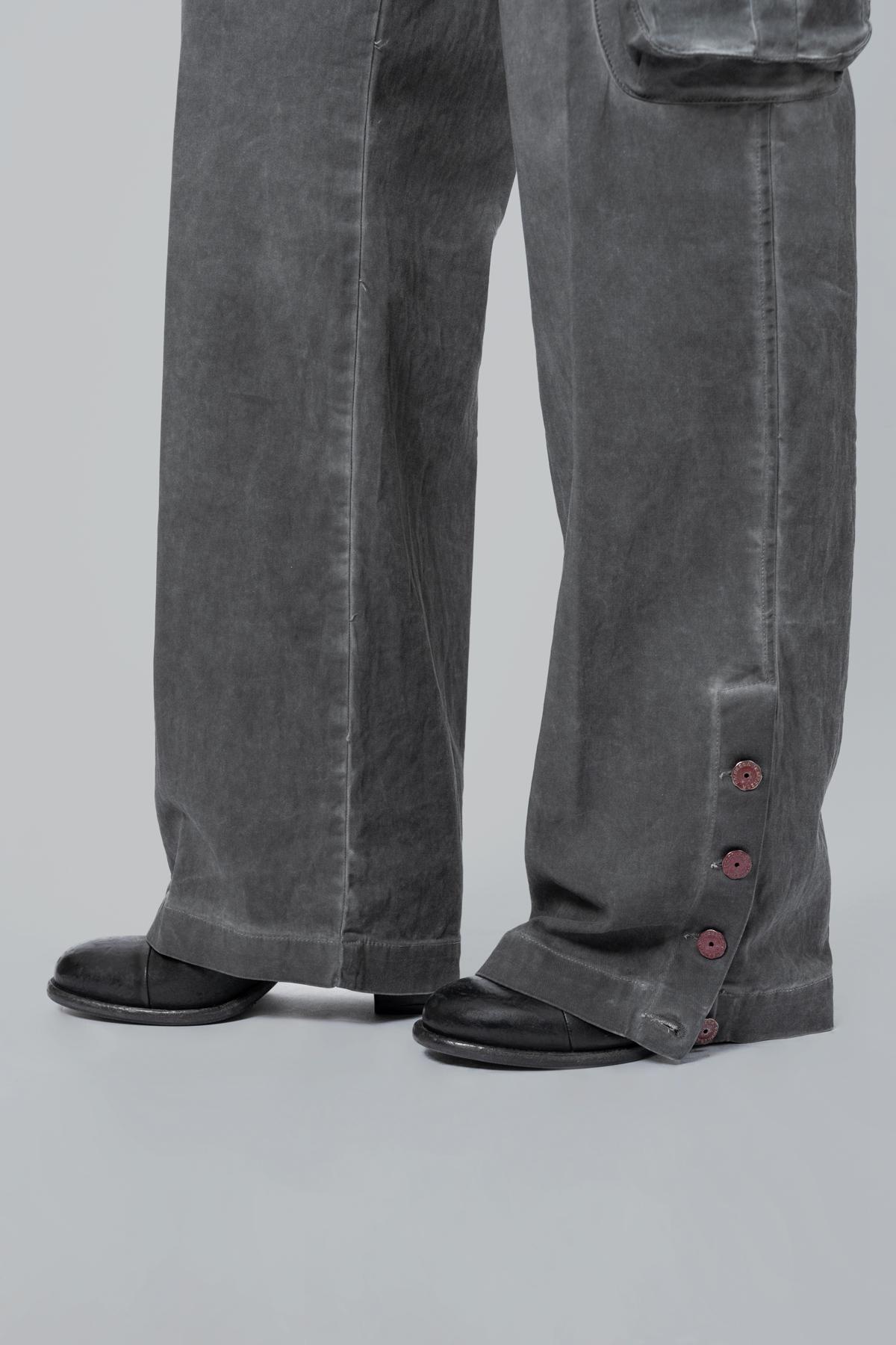 Wide-leg cargo trousers. Two large side pockets and four buttons at the bottom of the leg. Central closure with button and zip fastening. Adjustable waist width by the buckles on the sides.