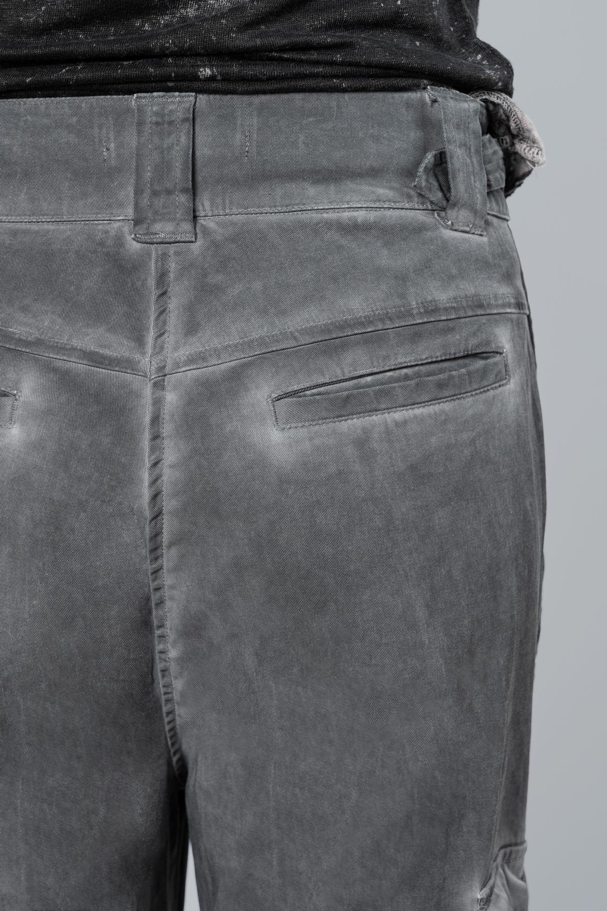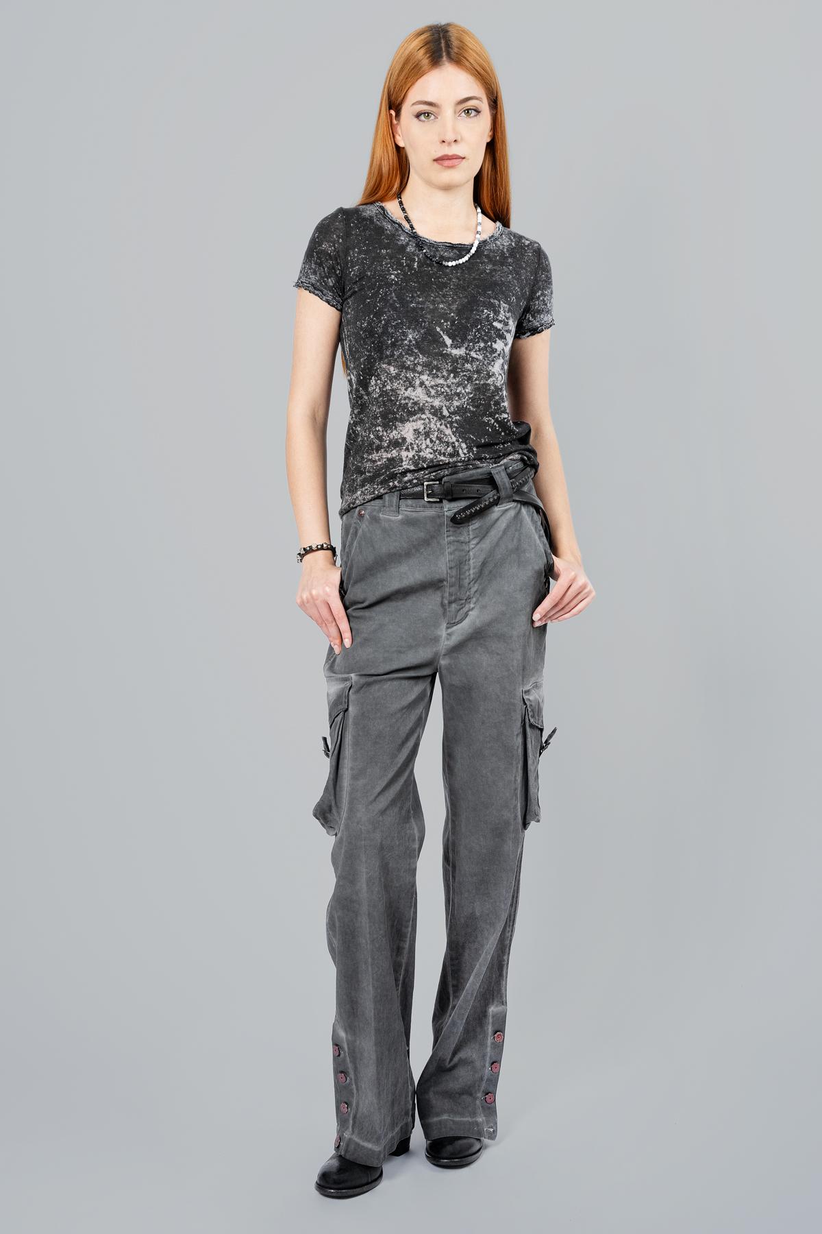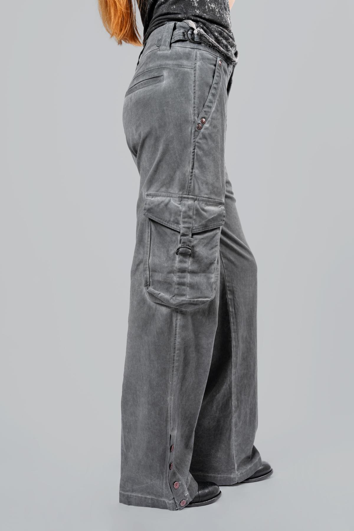 Wide-leg cargo trousers. Two large side pockets and four buttons at the bottom of the leg. Central closure with button and zip fastening. Adjustable waist width by the buckles on the sides.